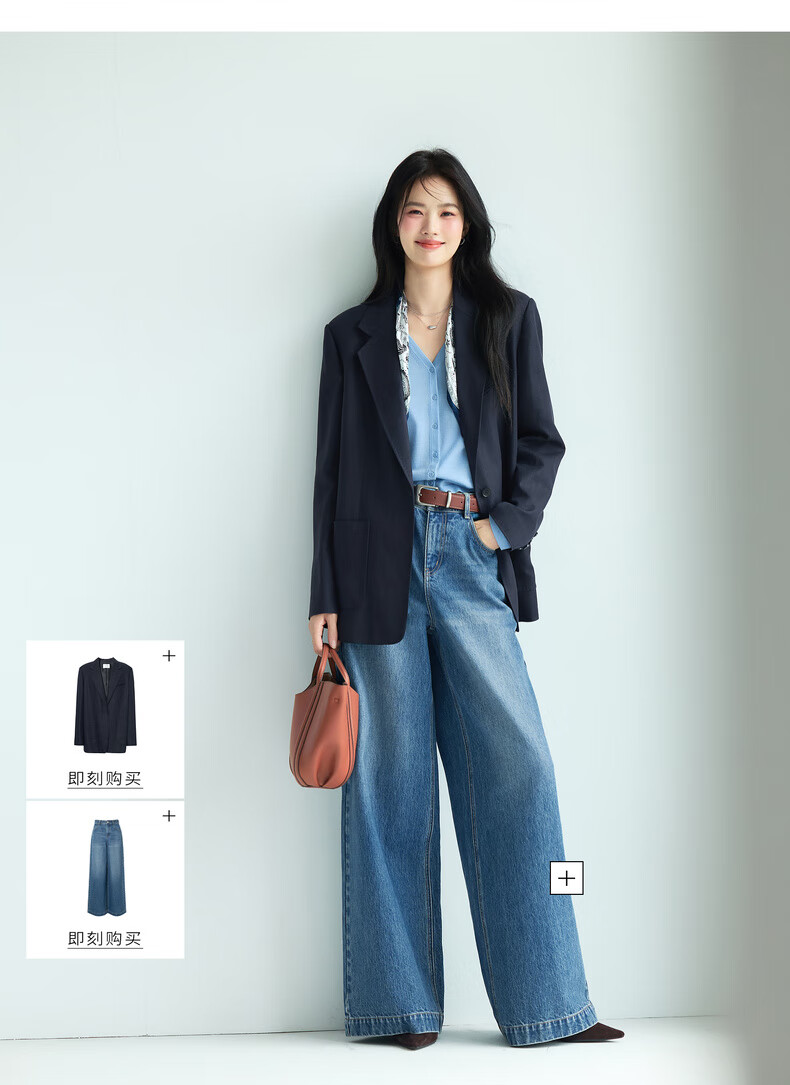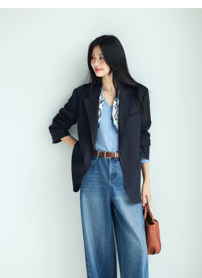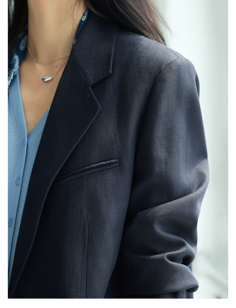 Eveli Tencel and linen blended herringbone design loose silhouette suit jacket for women 2025 autumn new style dark navy S