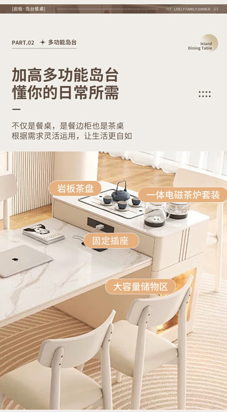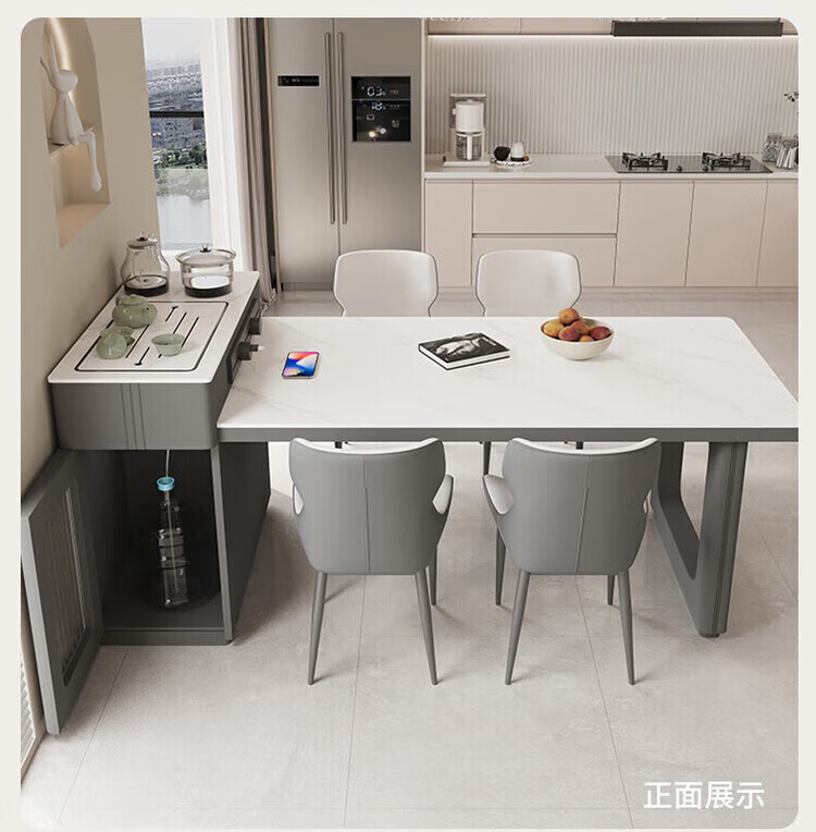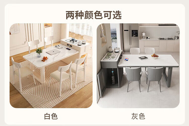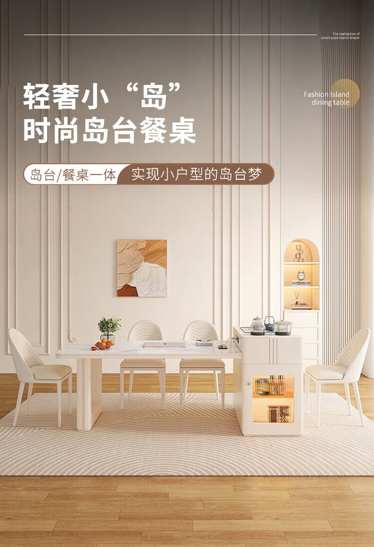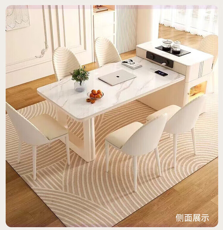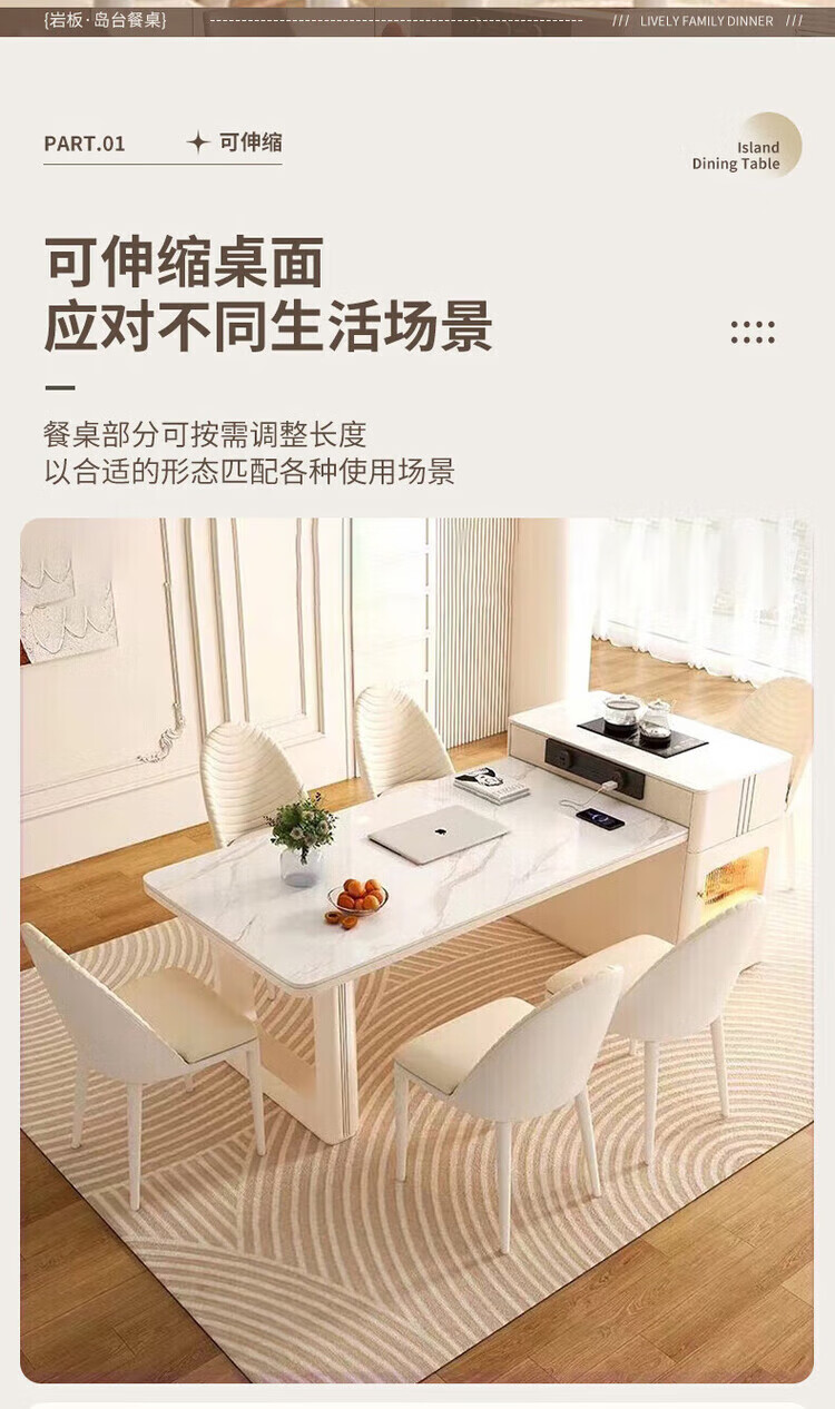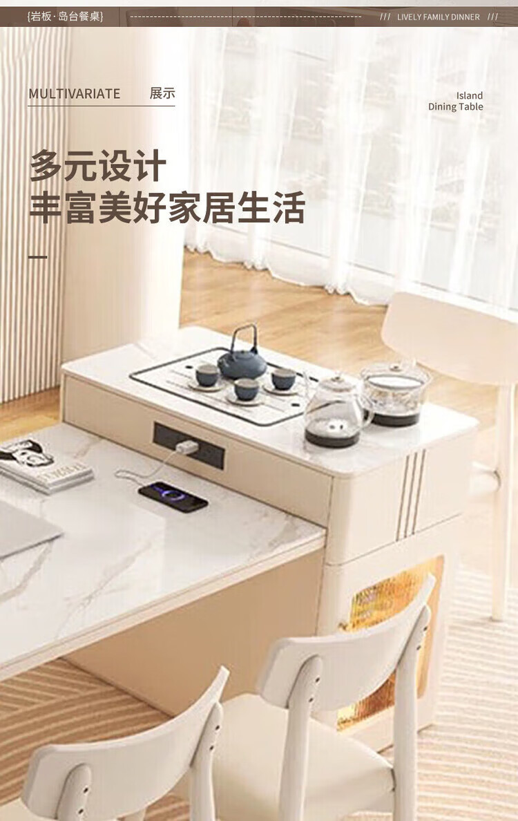 Lunzhuo Cream Style Slate Island Table Dining Table Tea Table Integrated Retractable Small Household Light Luxurious Modern Simple Dining Table Wear-resistant 12mm Slate Orbital Socket Straight Side Tea Stove 1.6 Meters 1 Table 6 Furry Chairs