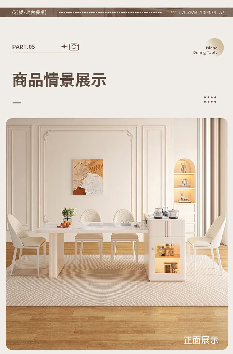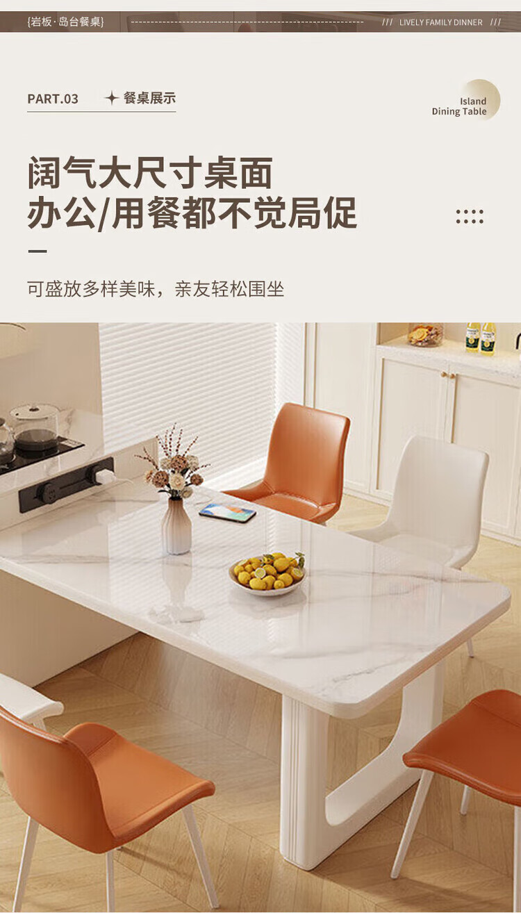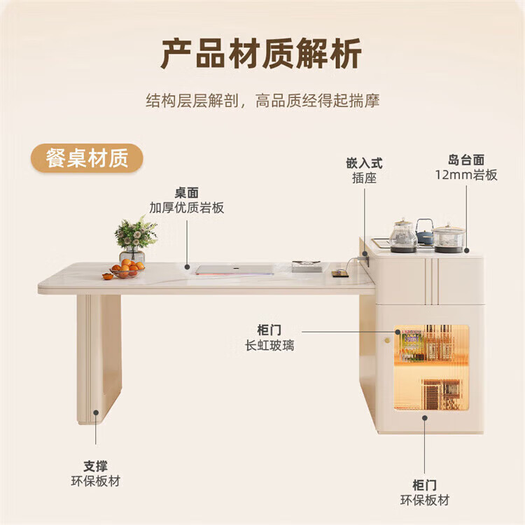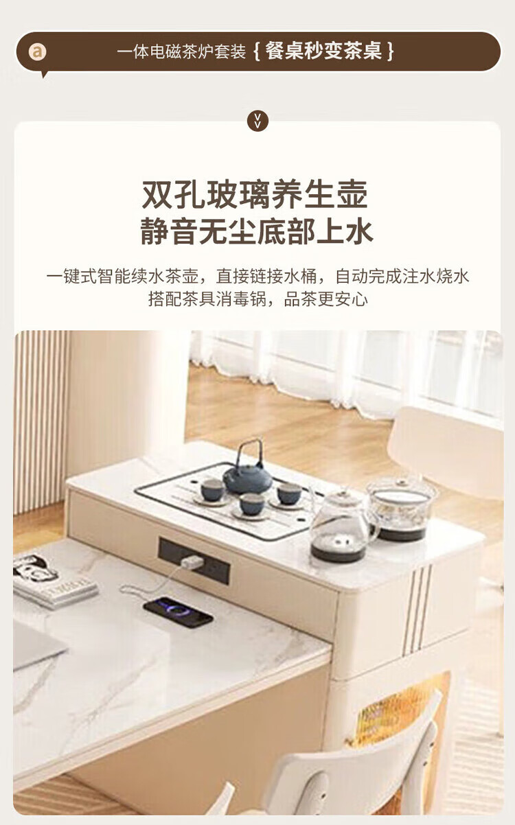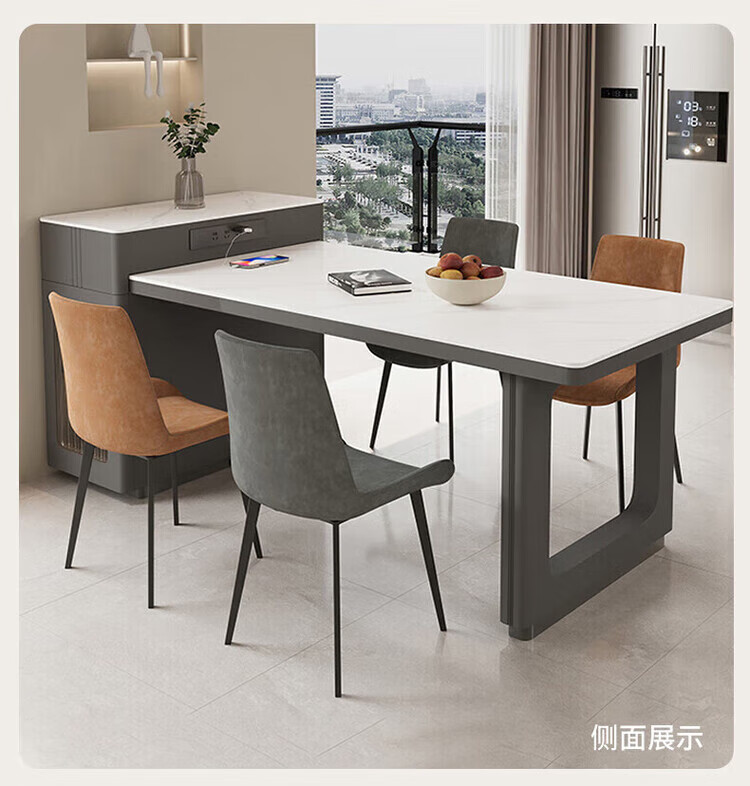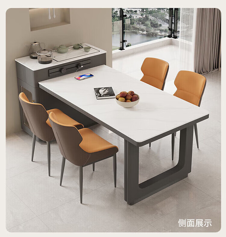 Lunzhuo Cream Style Slate Island Table Dining Table Tea Table Integrated Retractable Small Household Light Luxurious Modern Simple Dining Table Wear-resistant 12mm Slate Orbital Socket Straight Side Tea Stove 1.6 Meters 1 Table 6 Furry Chairs