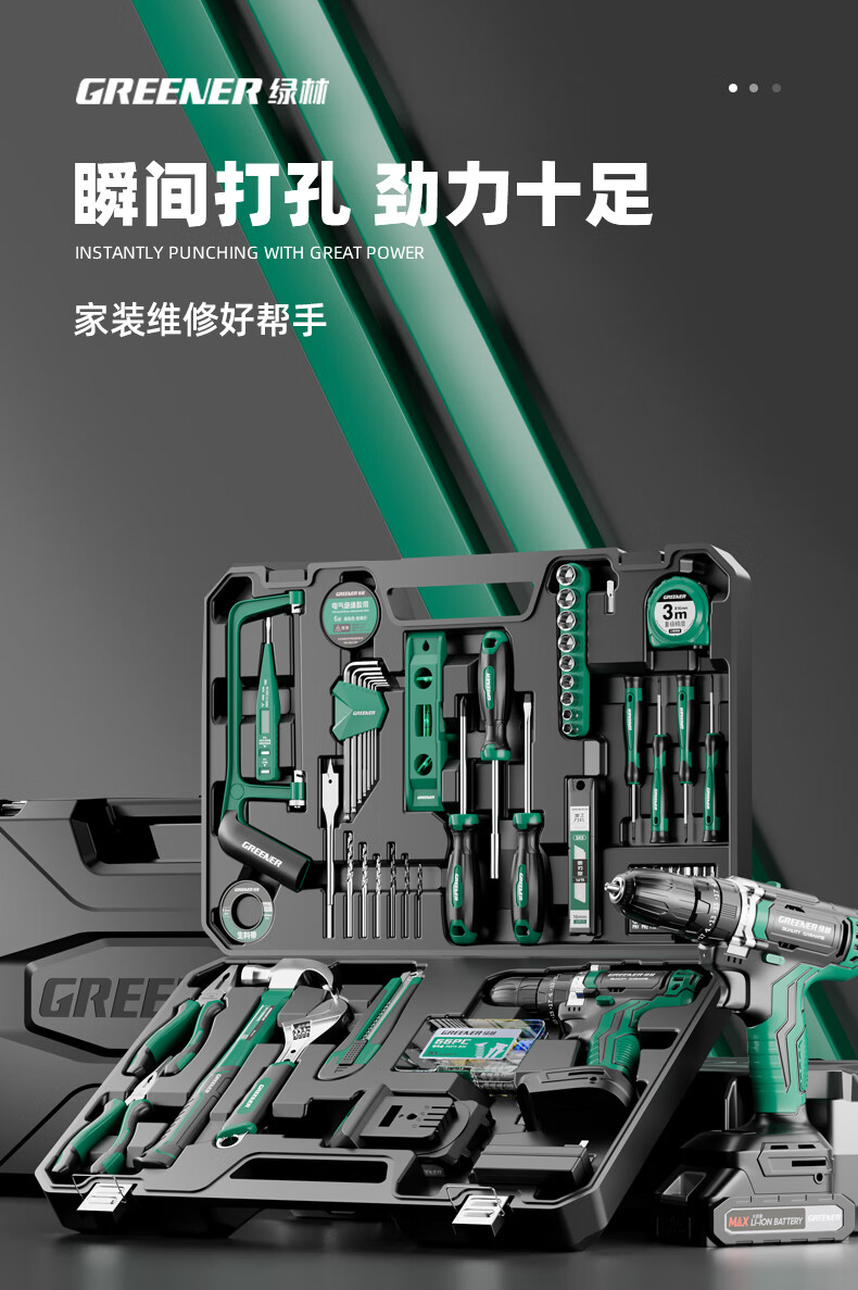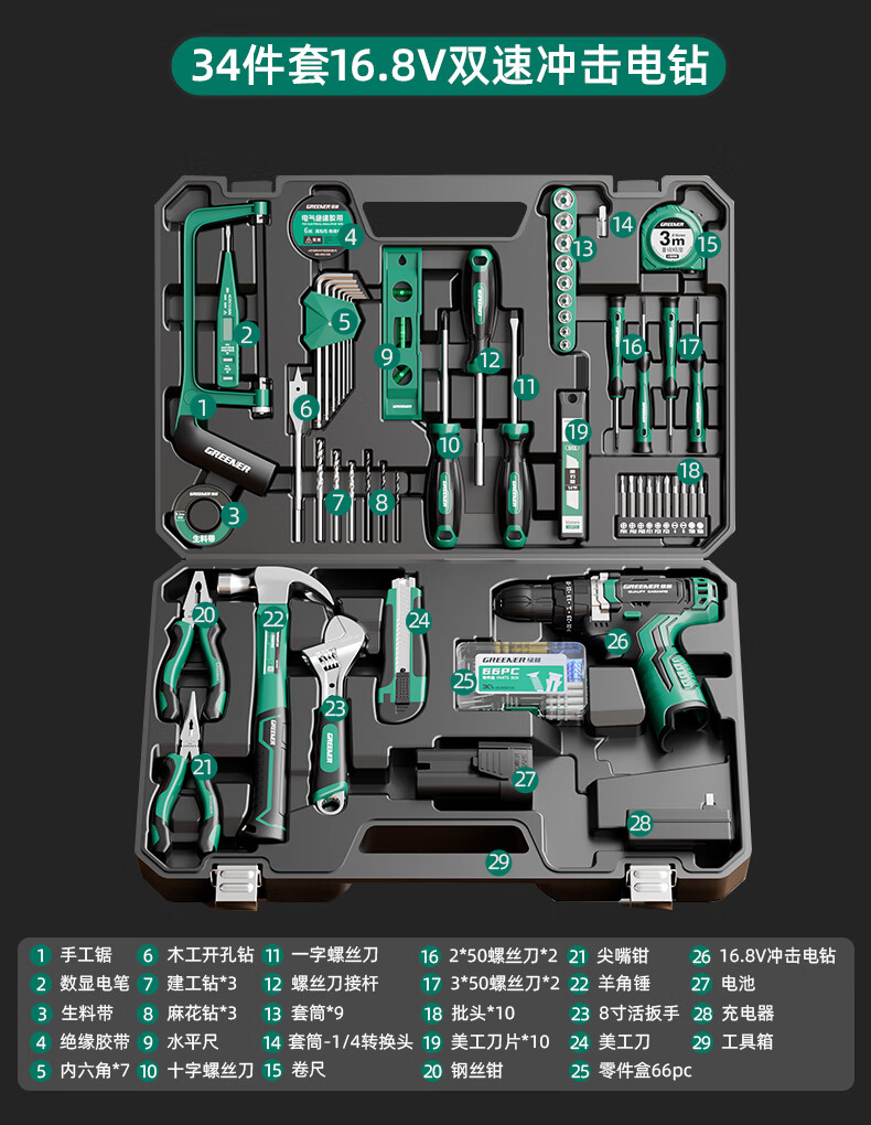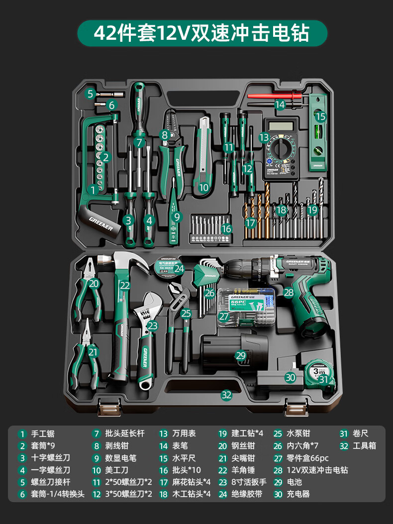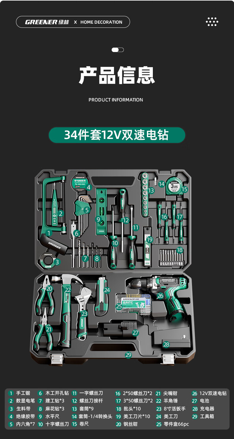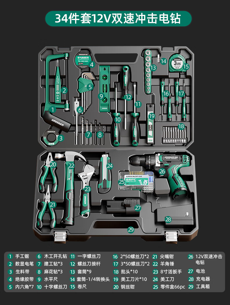 Green Forest Hardware Tool Set Household Toolbox Repair Complete Set Multifunctional Home Electrician Woodworking Electric Drill 12V Double Speed Lithium Electric Drill-34 Piece Set