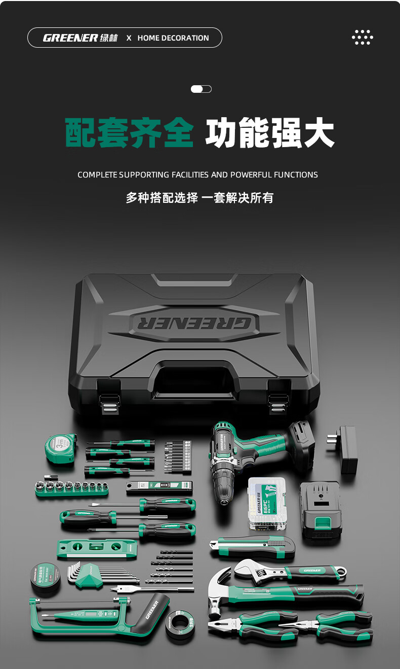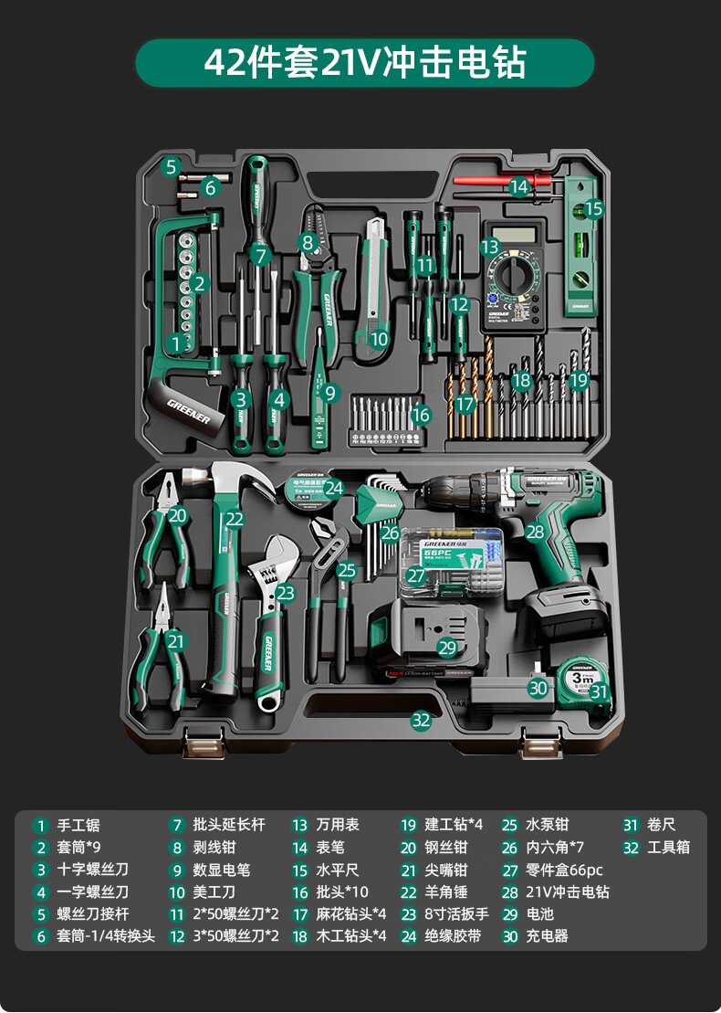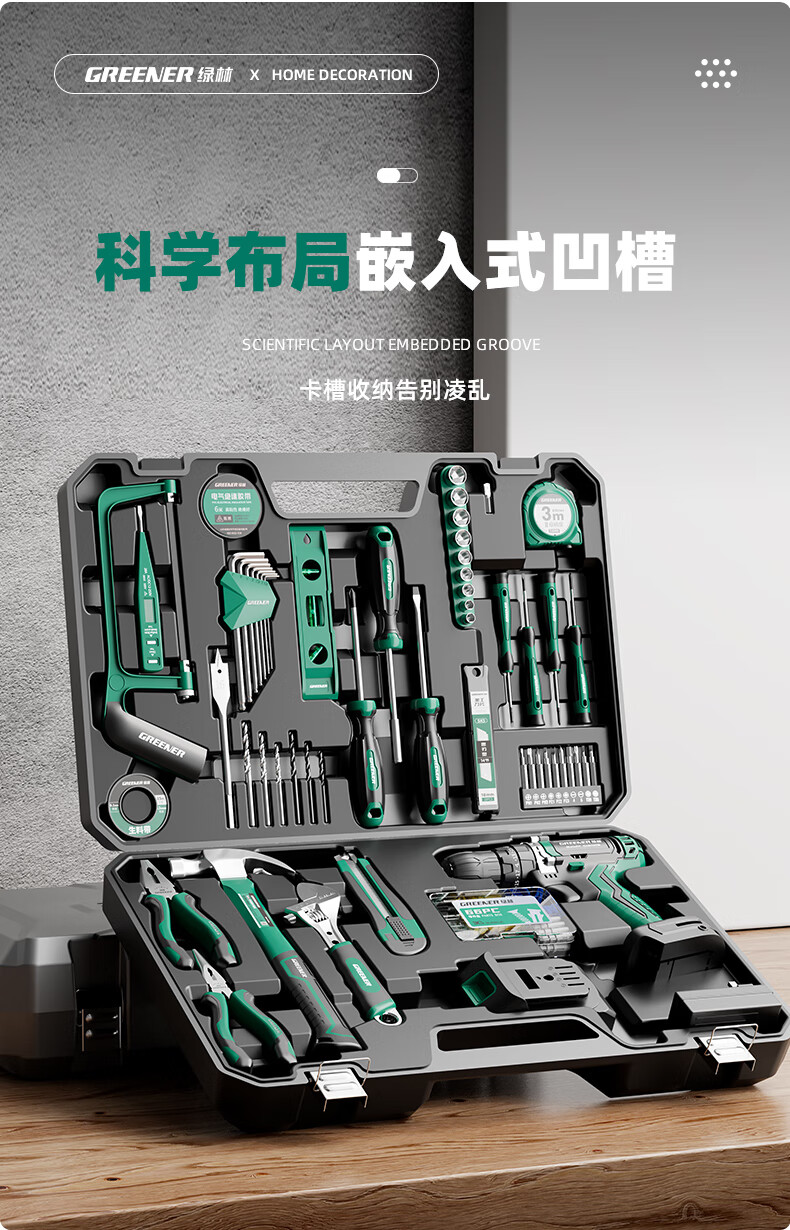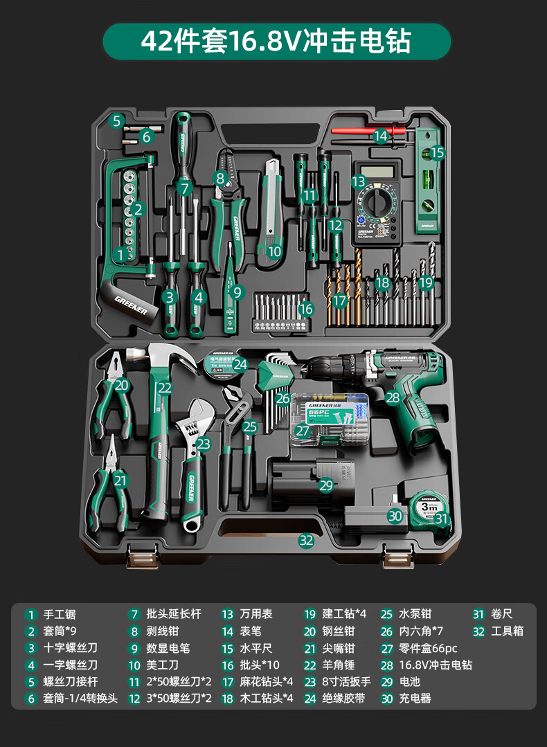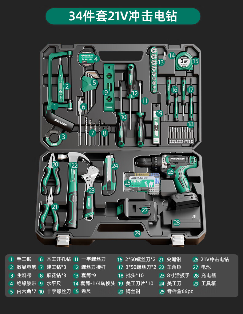 Green Forest Hardware Tool Set Household Toolbox Repair Complete Set Multifunctional Home Electrician Woodworking Electric Drill 12V Double Speed Lithium Electric Drill-34 Piece Set