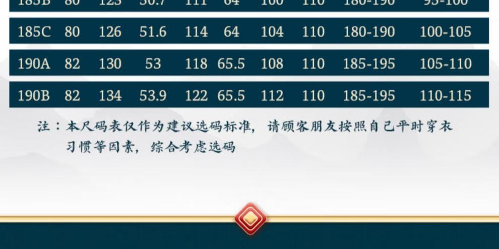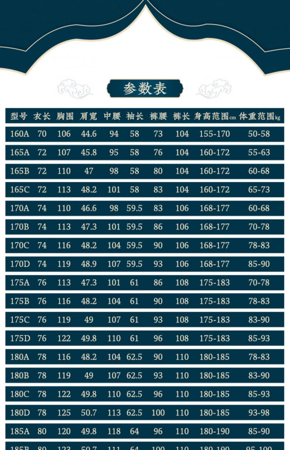 China (cm) 165 / 88-90 170 / 96-98 175 / 108-110 180 / 118-122 185 / 126-130