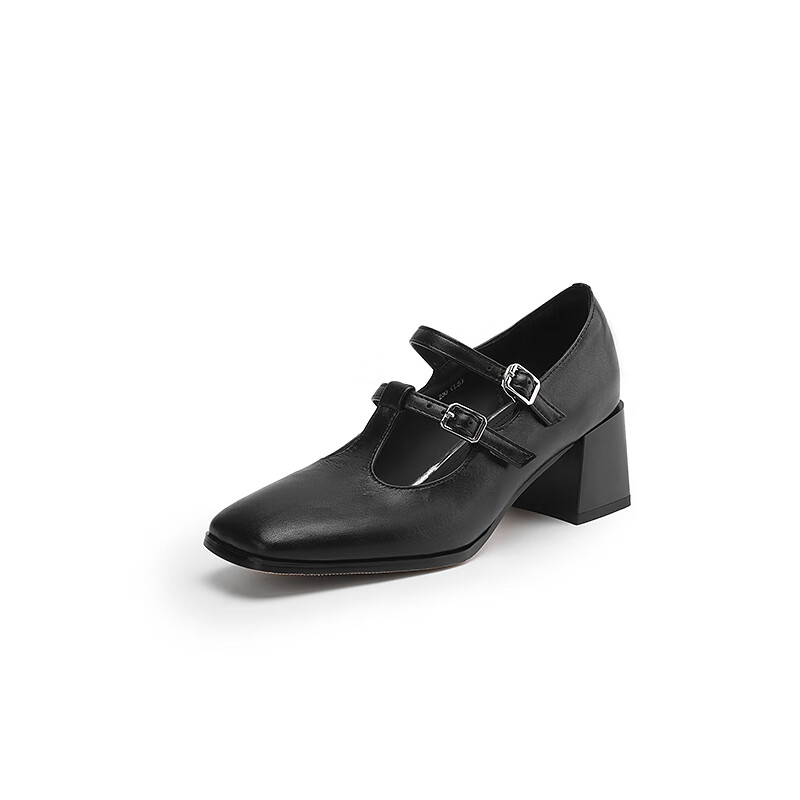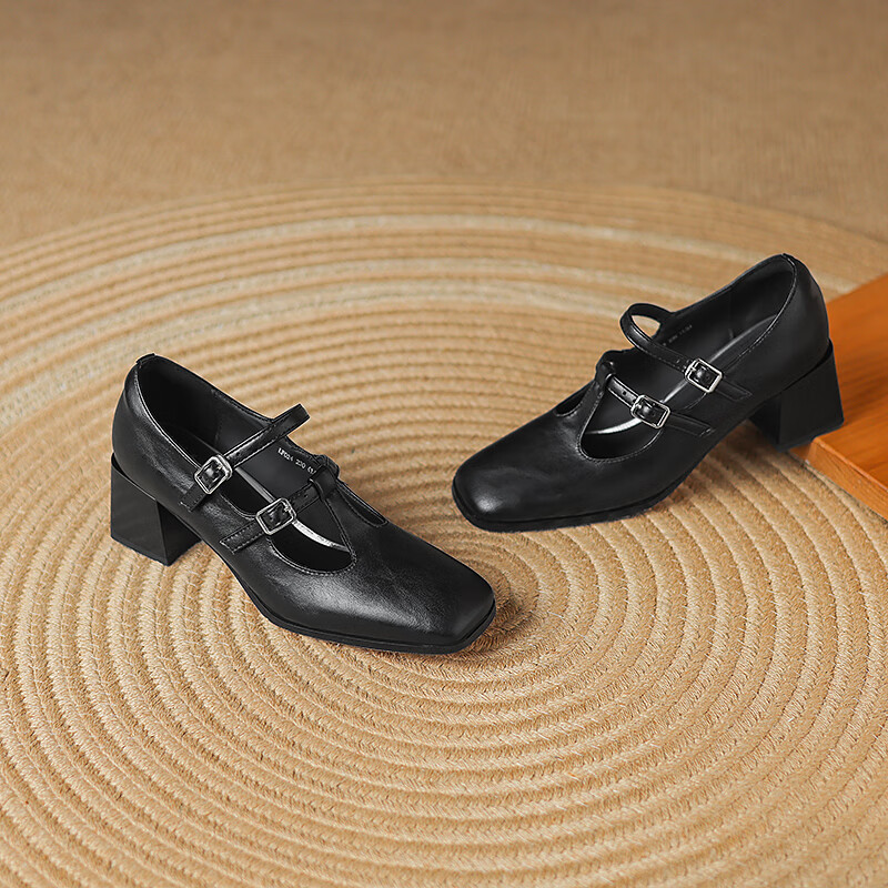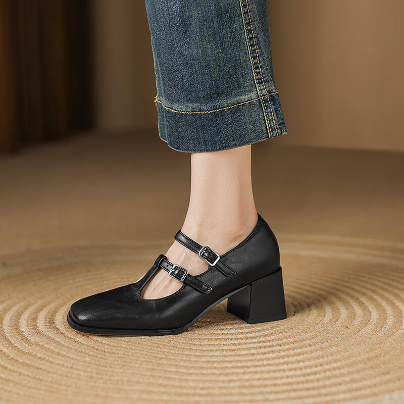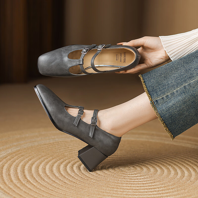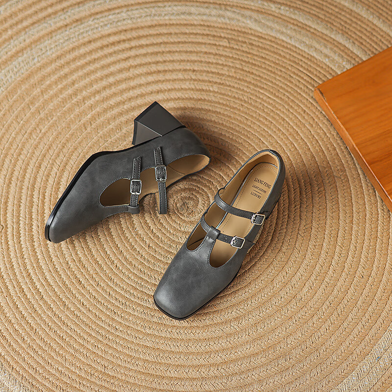 Cowhide 2025 new style square toe T-buckle thick heel medium heel fashion women's shoes gray 39