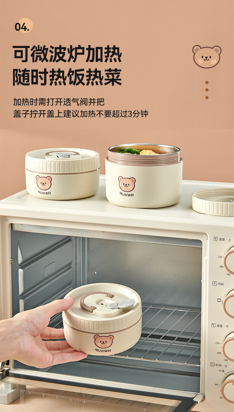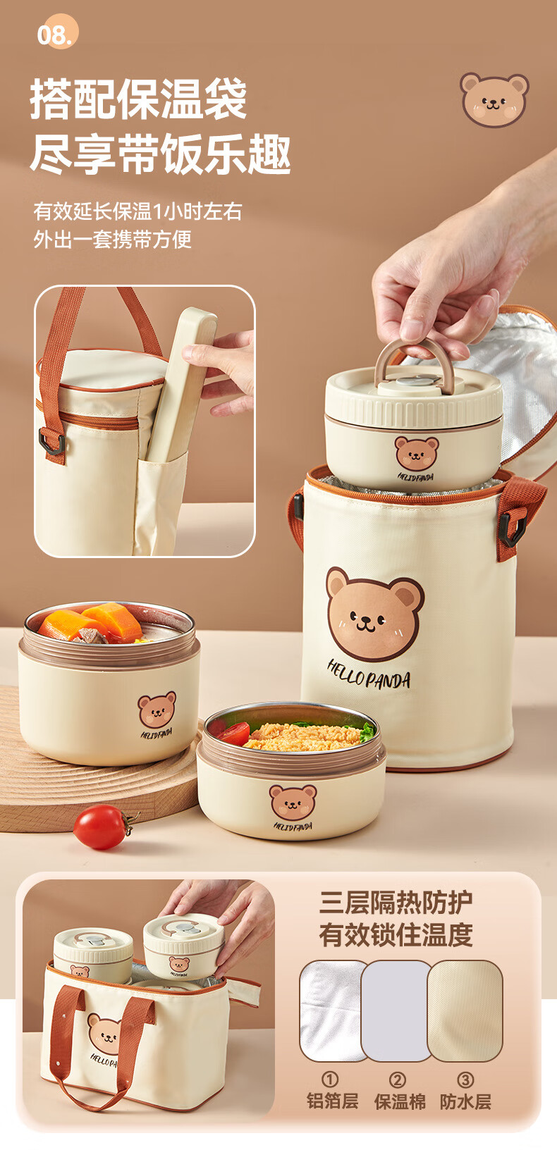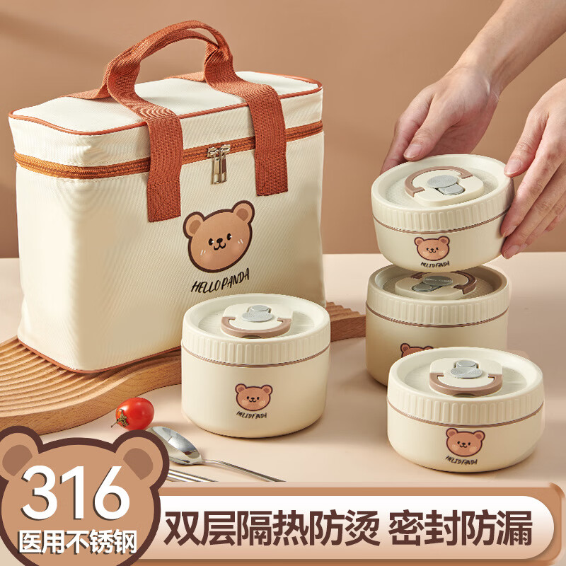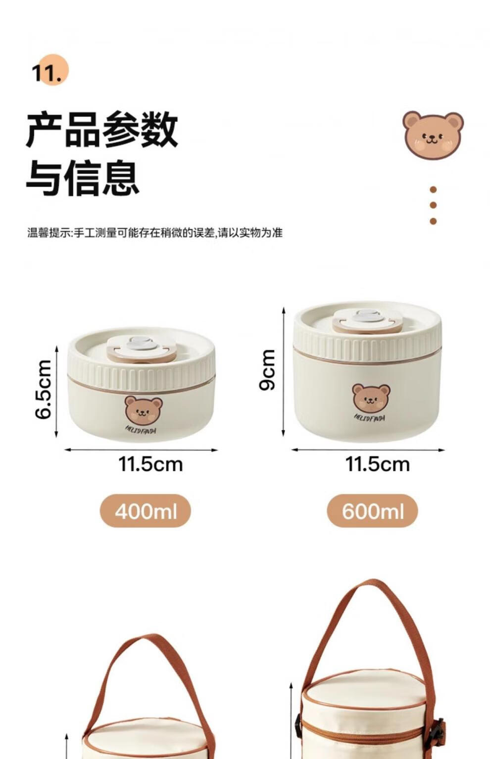 Bear Lunch Box Thermos Box for Office Workers 2024 New Microwave Heated Stainless Steel Lunch Box with Hand Bag 316 Rice White Large Size 600ml--