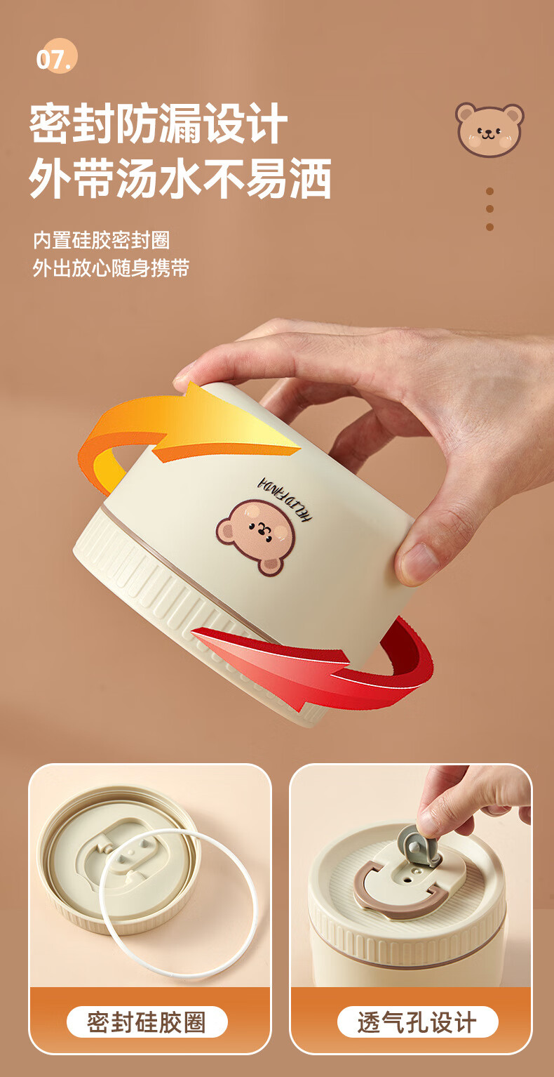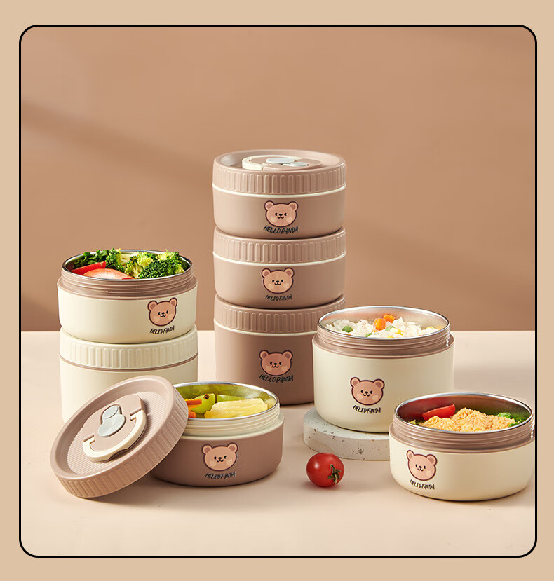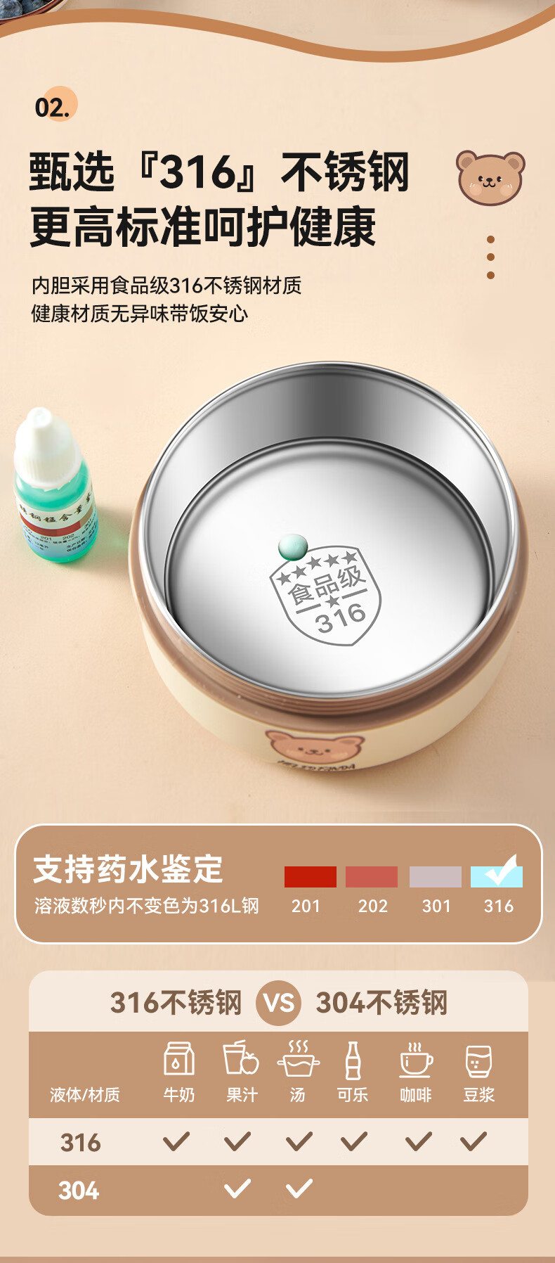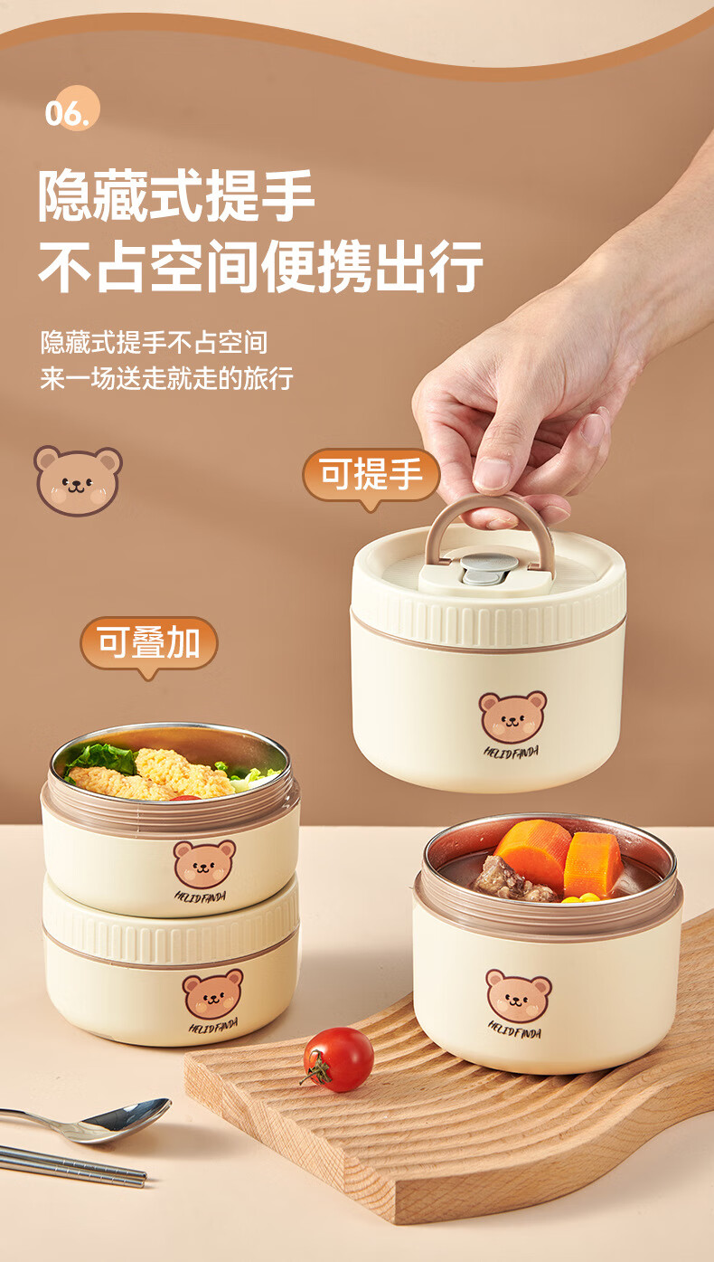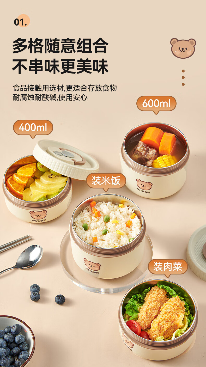 Bear Lunch Box Thermos Box for Office Workers 2024 New Microwave Heated Stainless Steel Lunch Box with Hand Bag 316 Rice White Large Size 600ml--