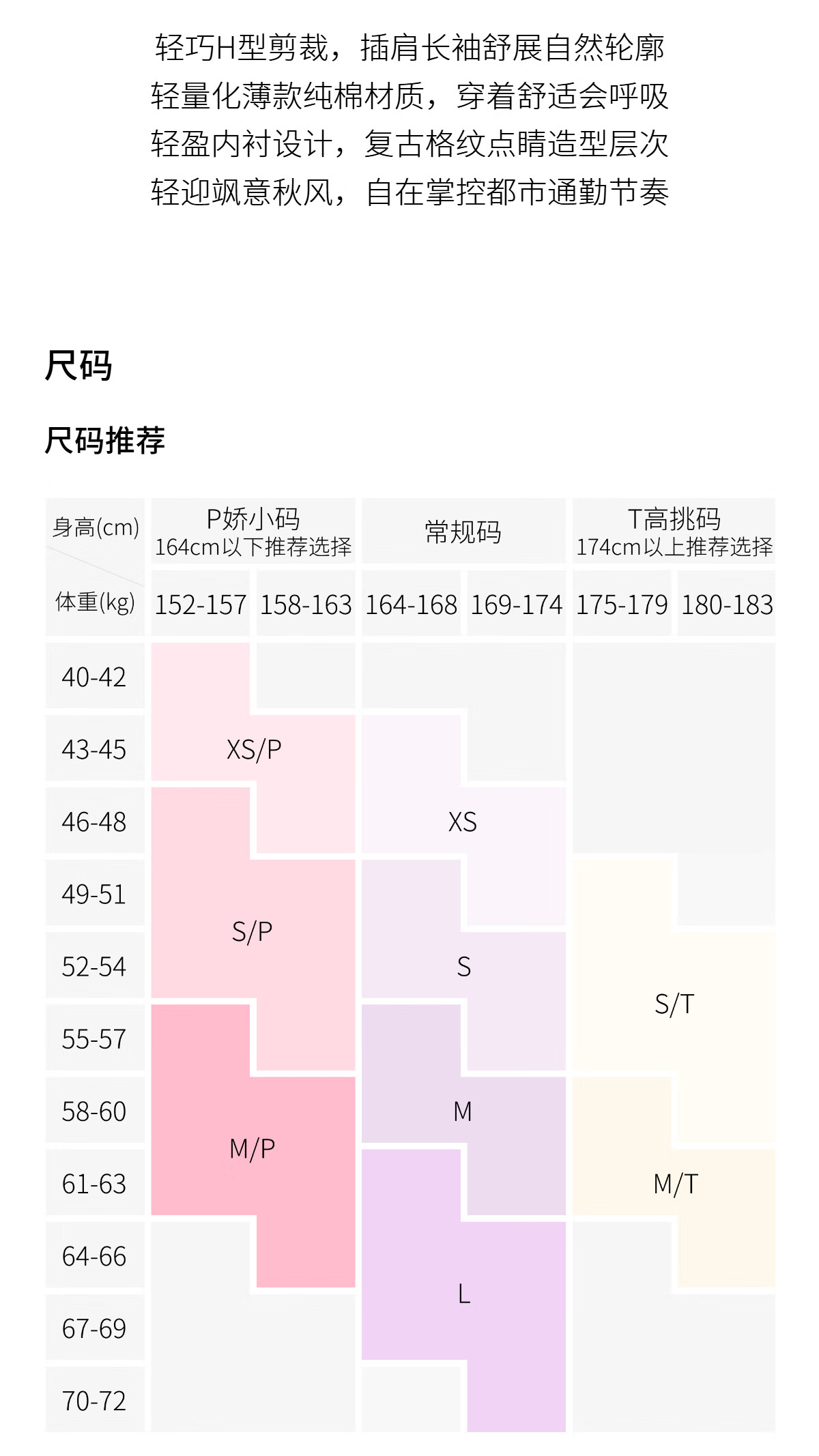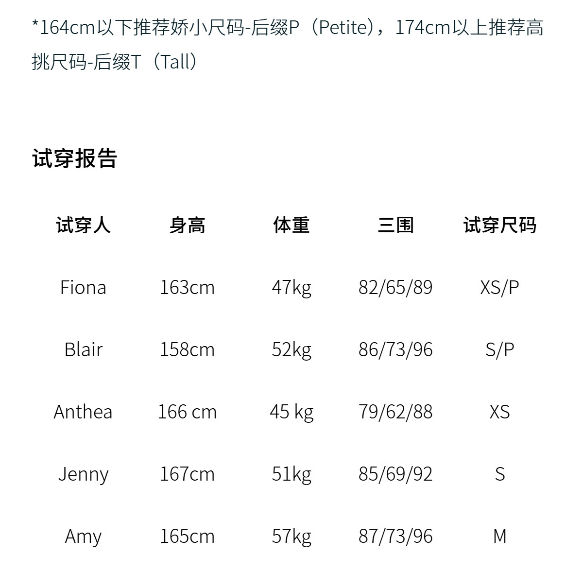 China (cm) 160-165/84-86 165-170 / 88-90 167-172 / 92-96 168-173 / 98-102 170-176 / 106-110