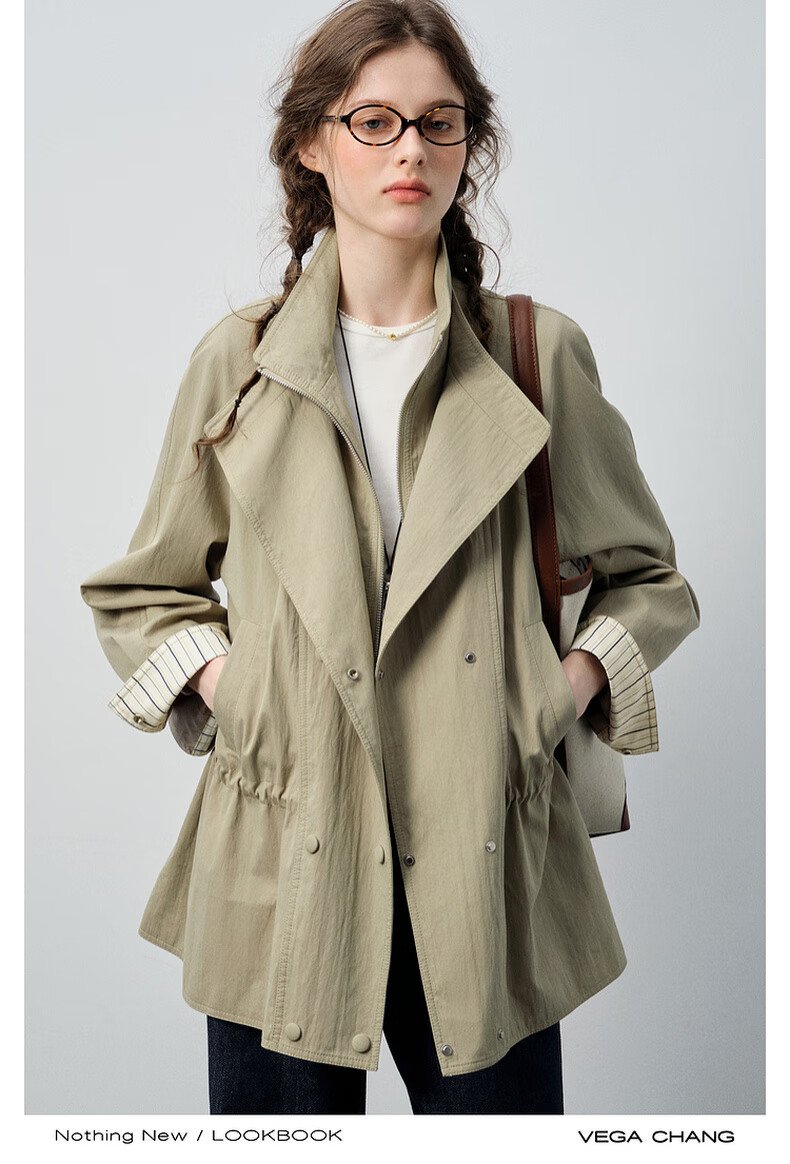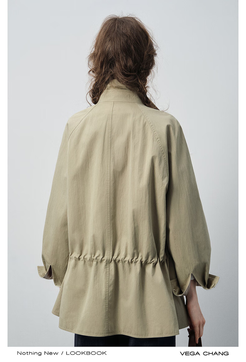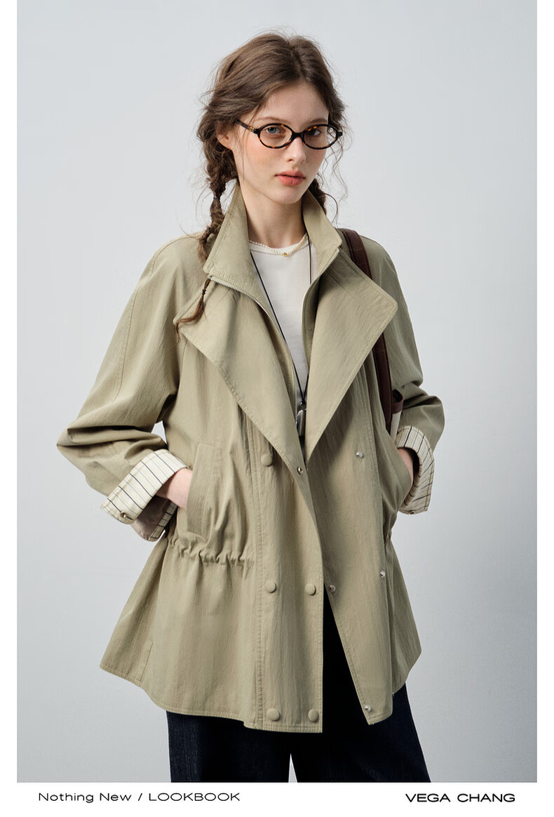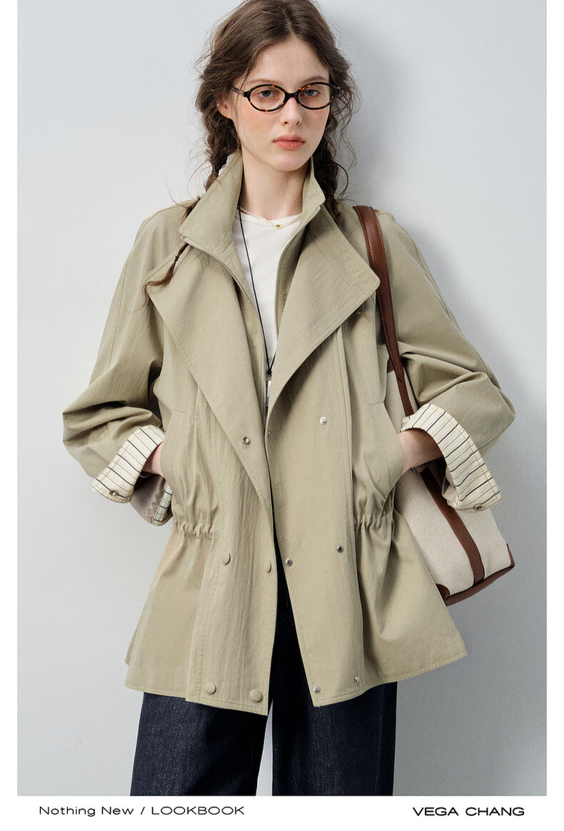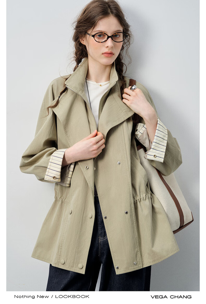 VEGA CHANG windbreaker for women petite 2026 spring new style waisted short cuffs striped splicing loose jacket fog khaki S