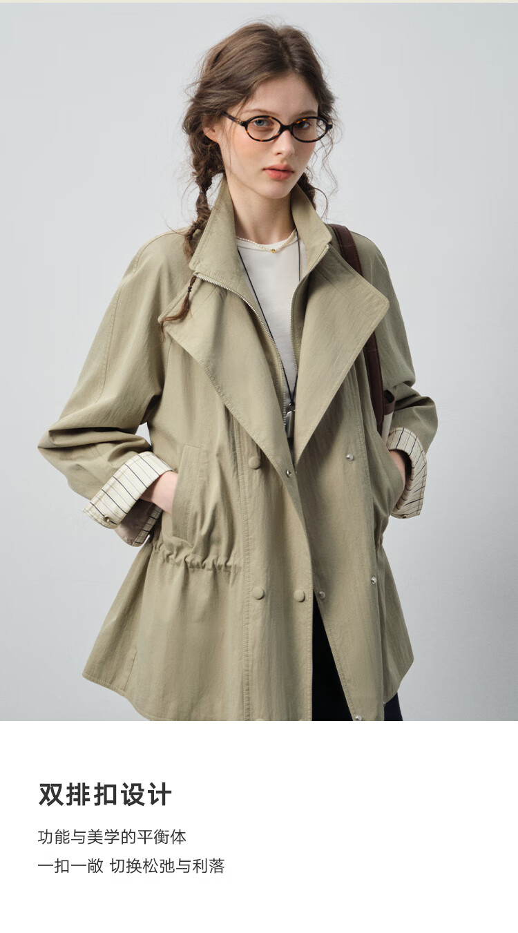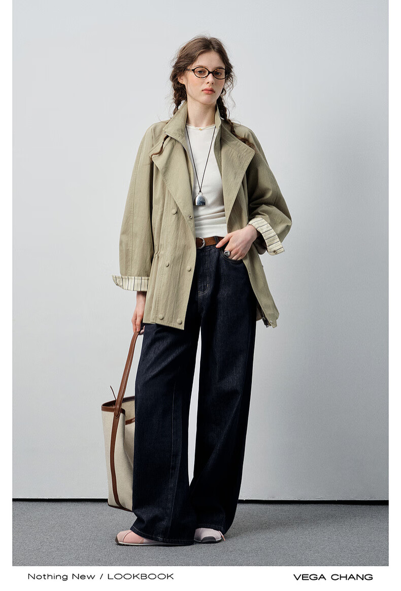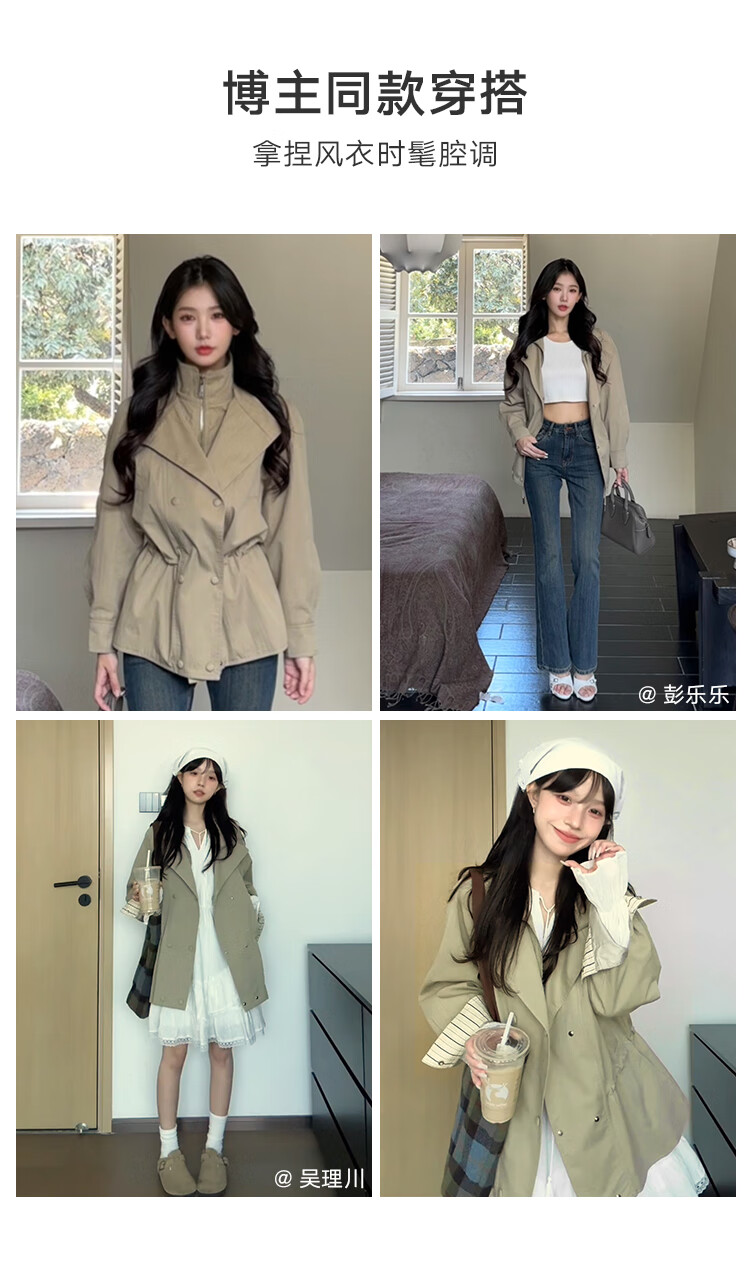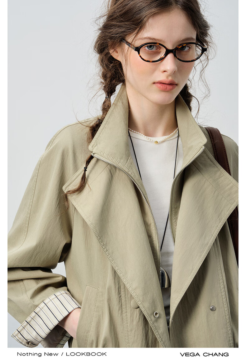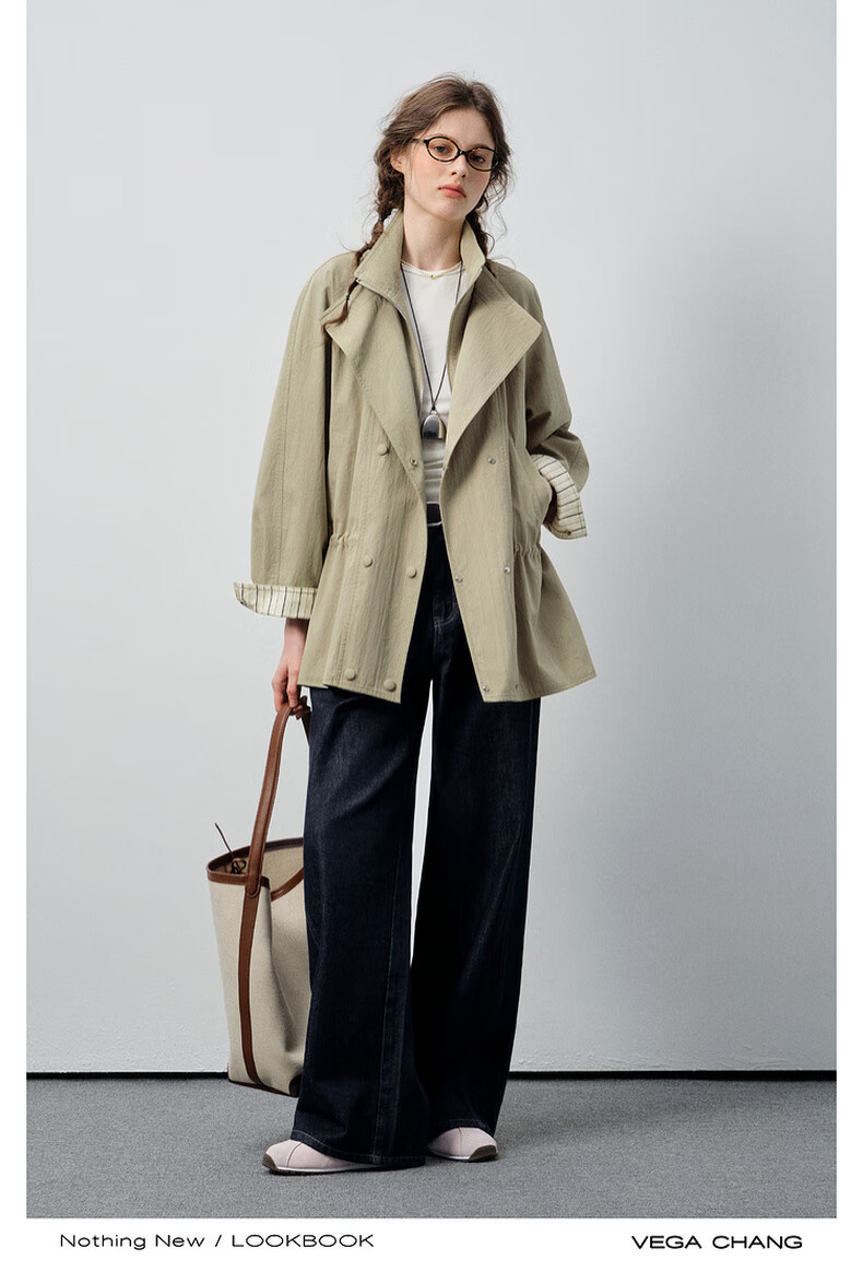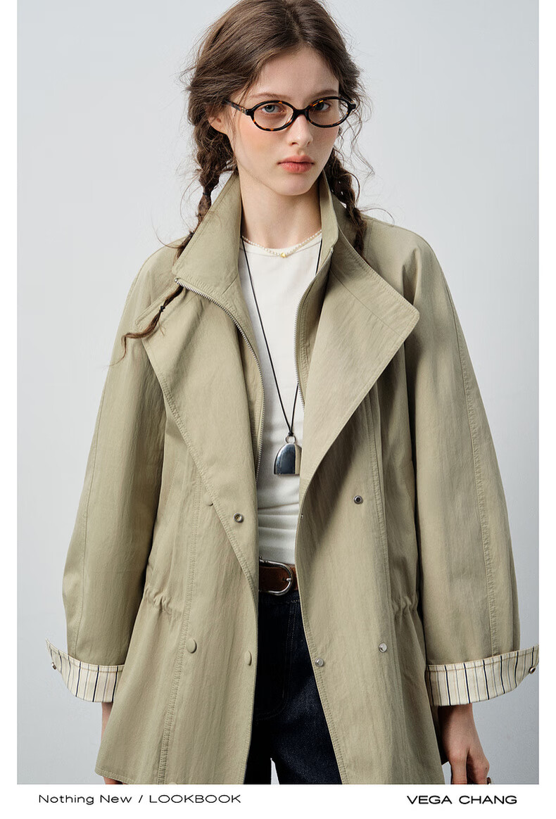 VEGA CHANG windbreaker for women petite 2026 spring new style waisted short cuffs striped splicing loose jacket fog khaki S