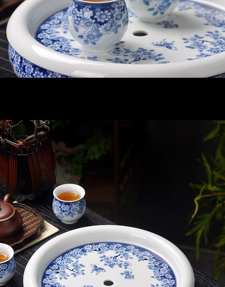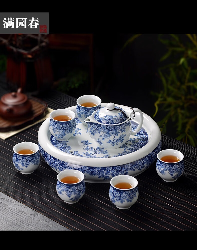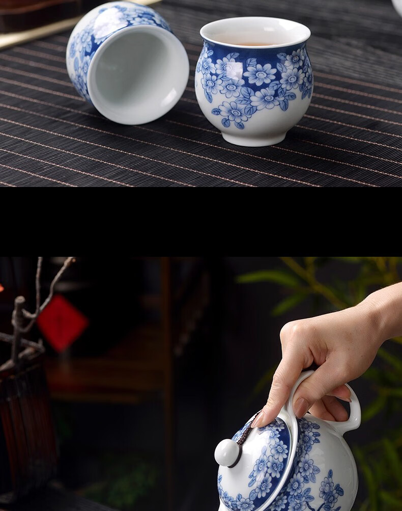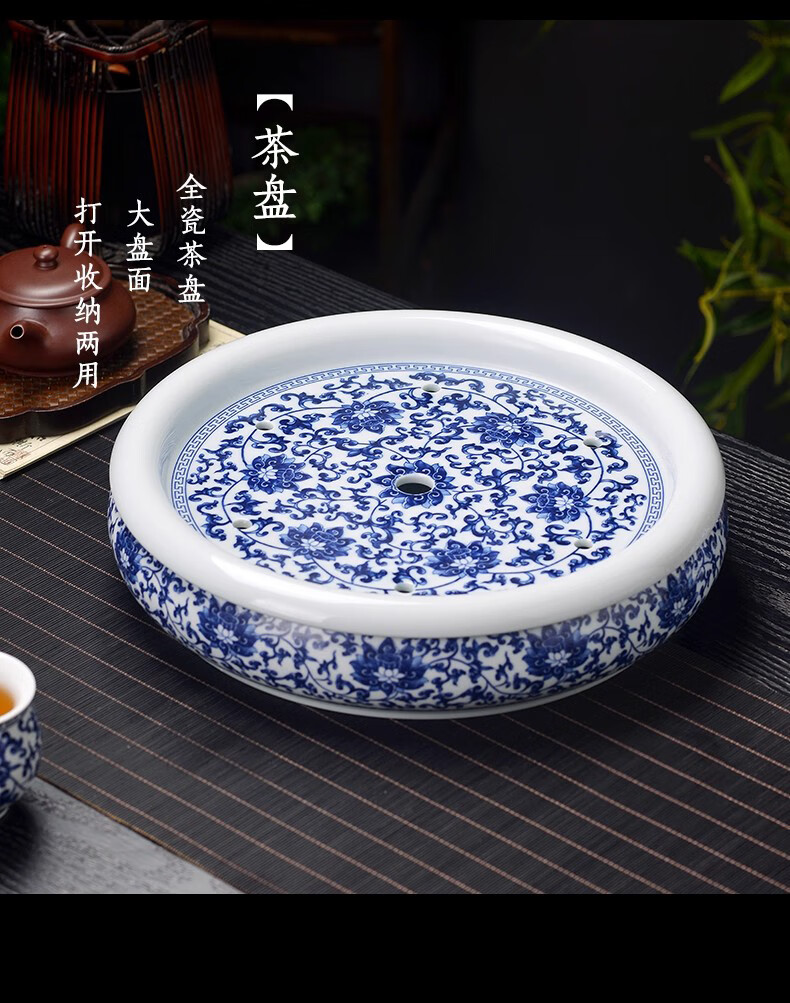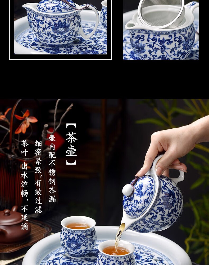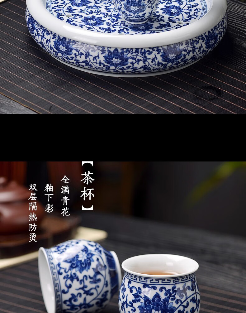 Close-up blue and white porcelain tea set Jingdezhen ceramic complete set household double-layer anti-scald tea cup living room office tea tray Panzhilian