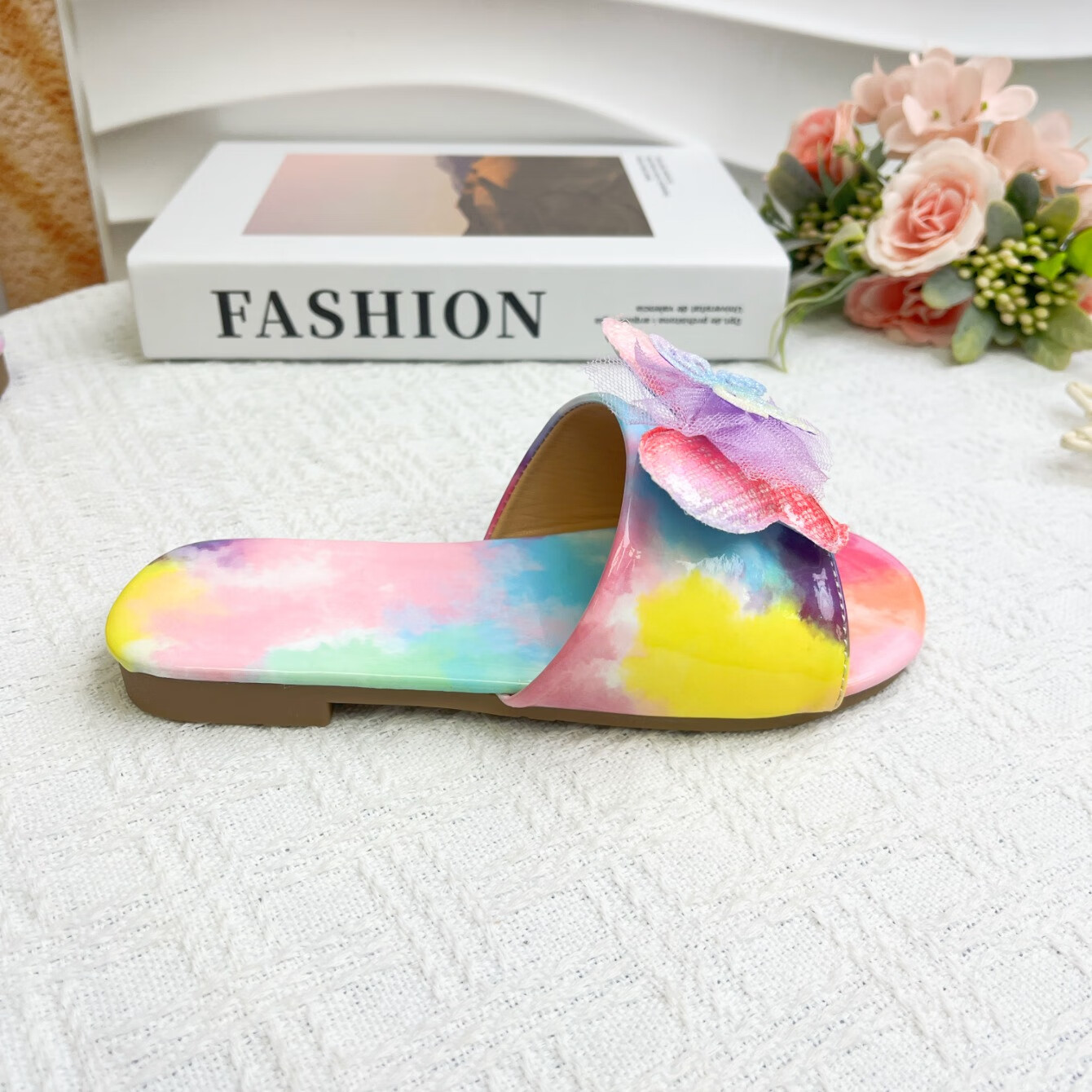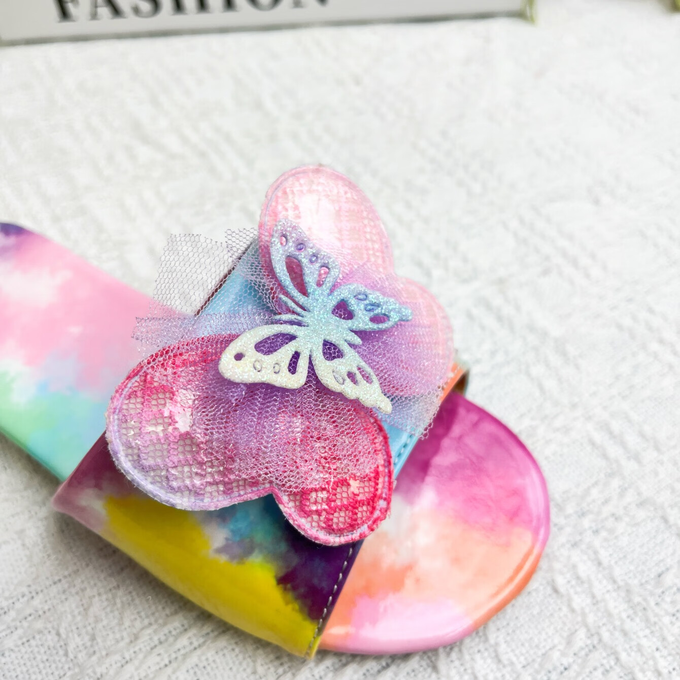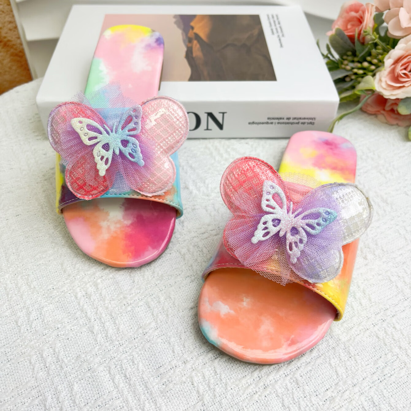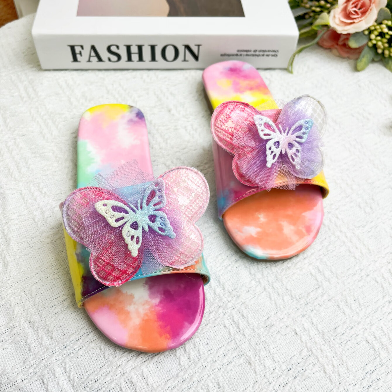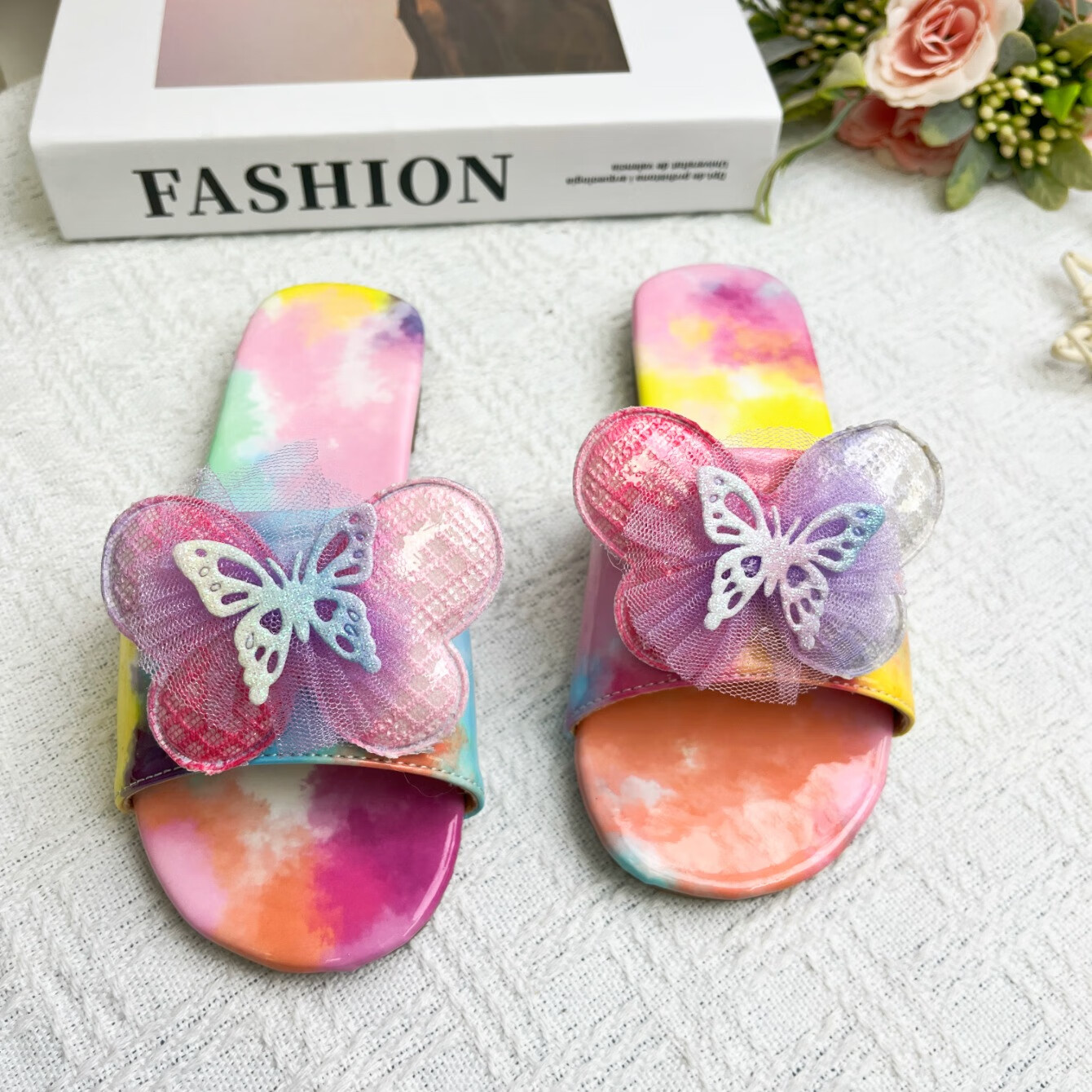 2025 new Korean style girls summer non-slip slippers, everyday versatile colorful bow decorated flip flops, rainbow color 34, inner length 22.8cm
