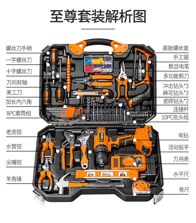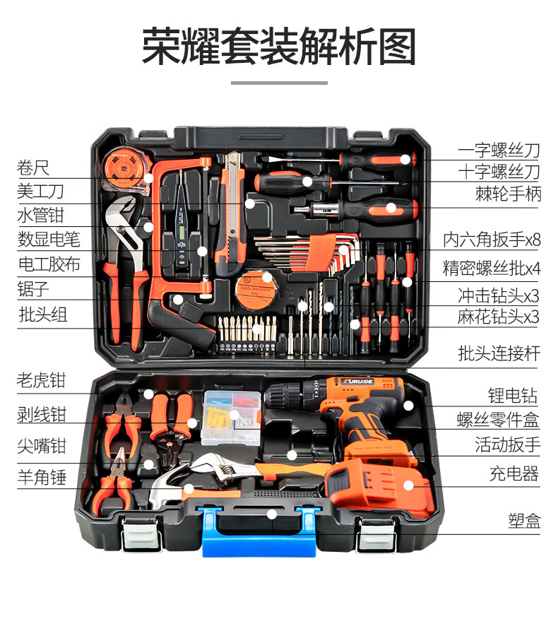 FURUIDE Tool Box Household Tool Set Multifunctional Hardware Electrician Repair Combination Complete Vehicle Mounted Electric Drill Storage Set Flagship Edition 1 Battery/King Set/Drill Mixer