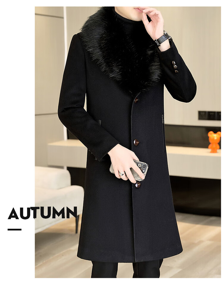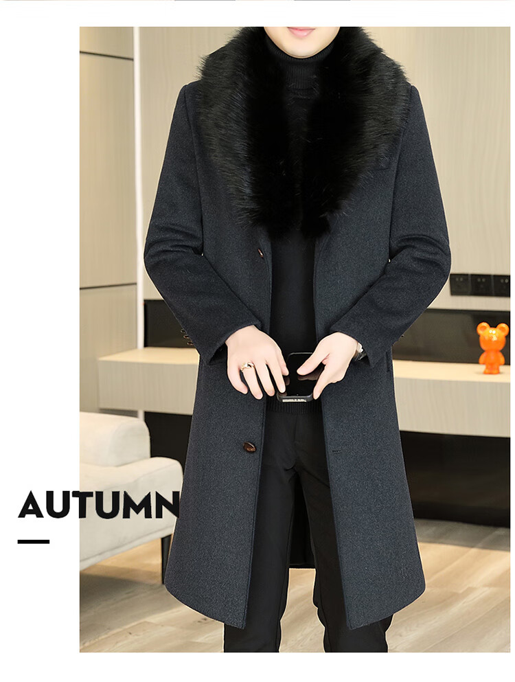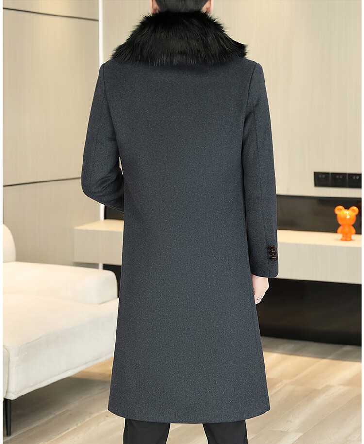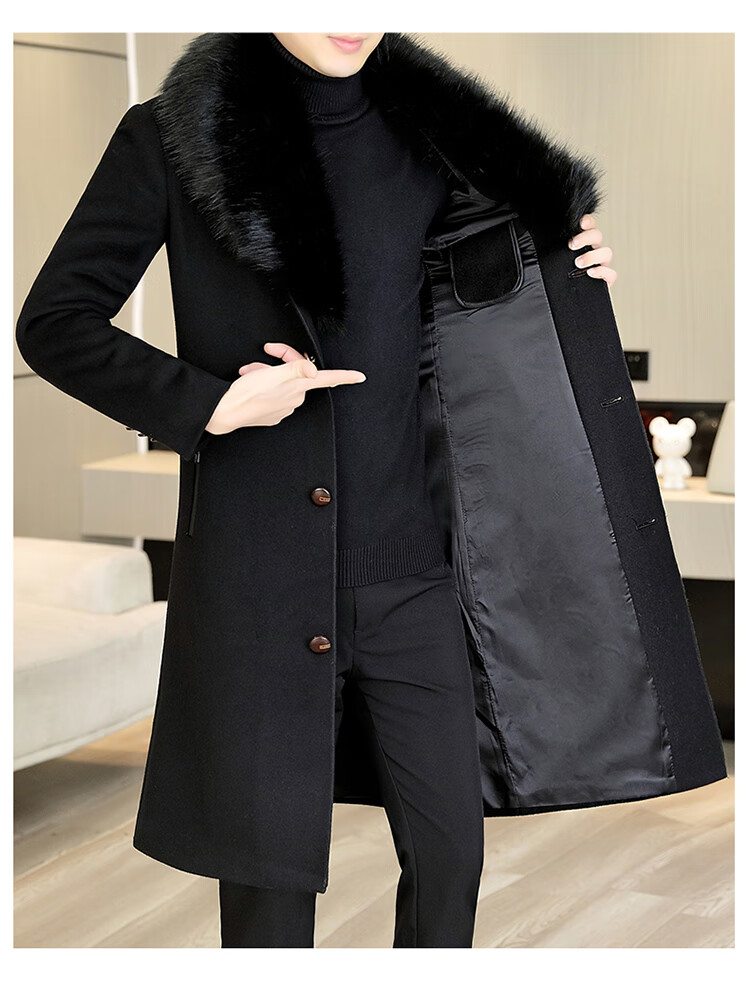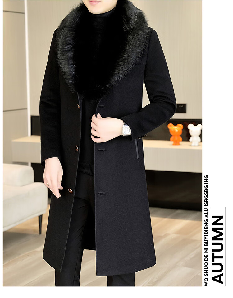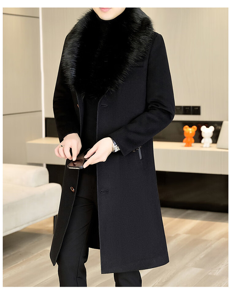 Pierre Cardin autumn and winter men's extended length knee-length woolen coat jacket trendy business men's thickened fur collar woolen windbreaker black XL