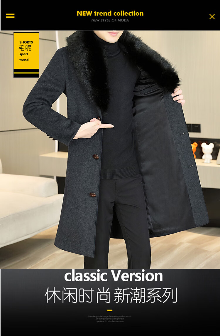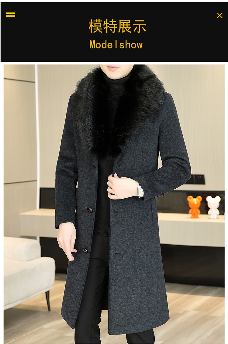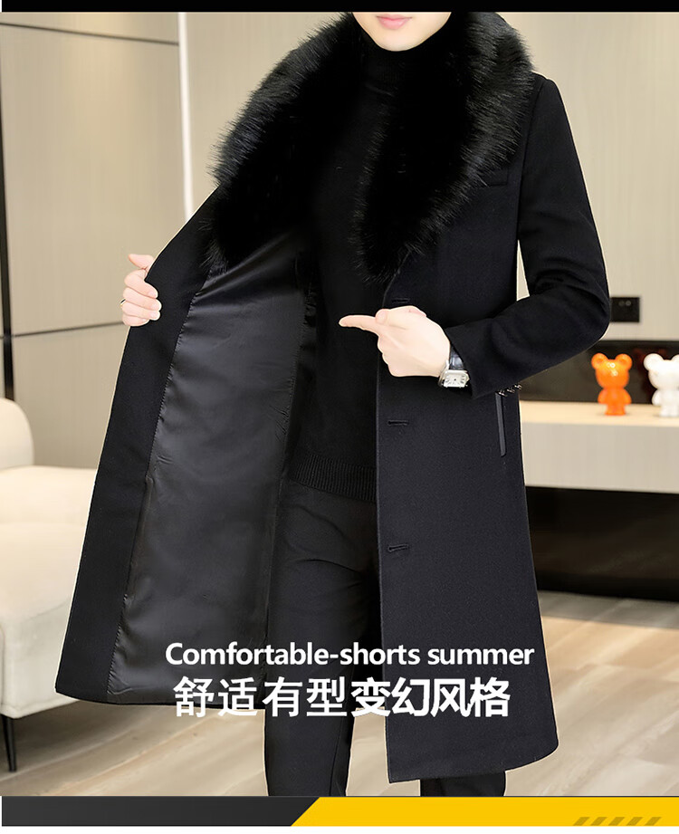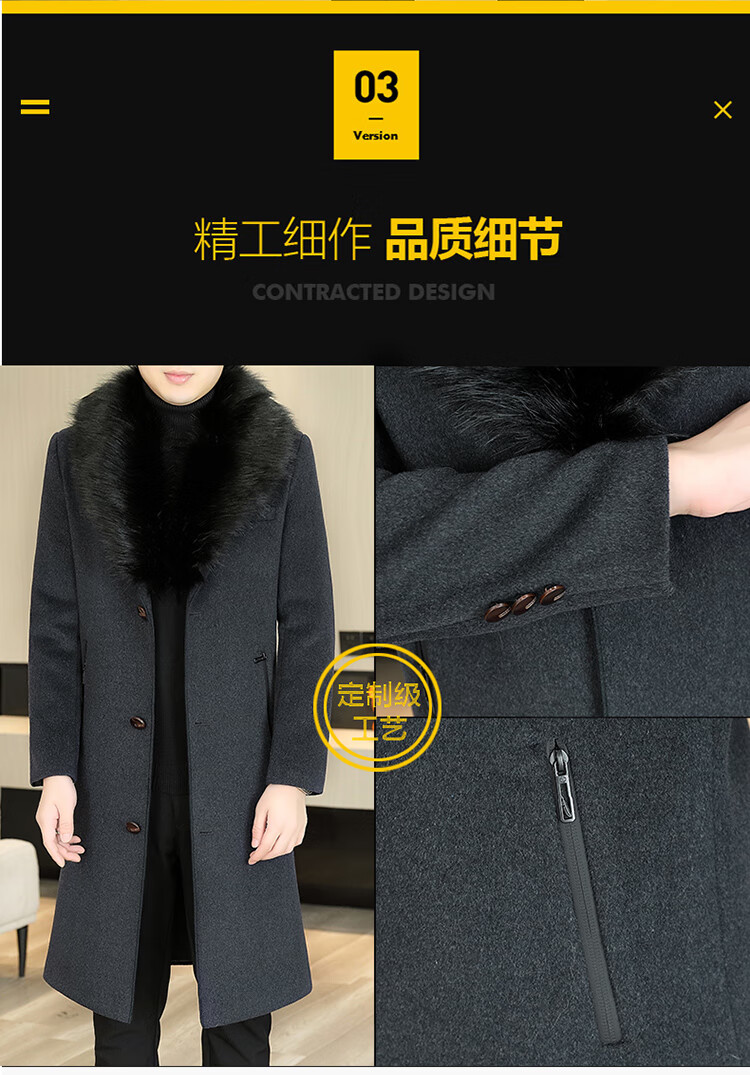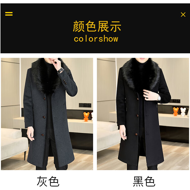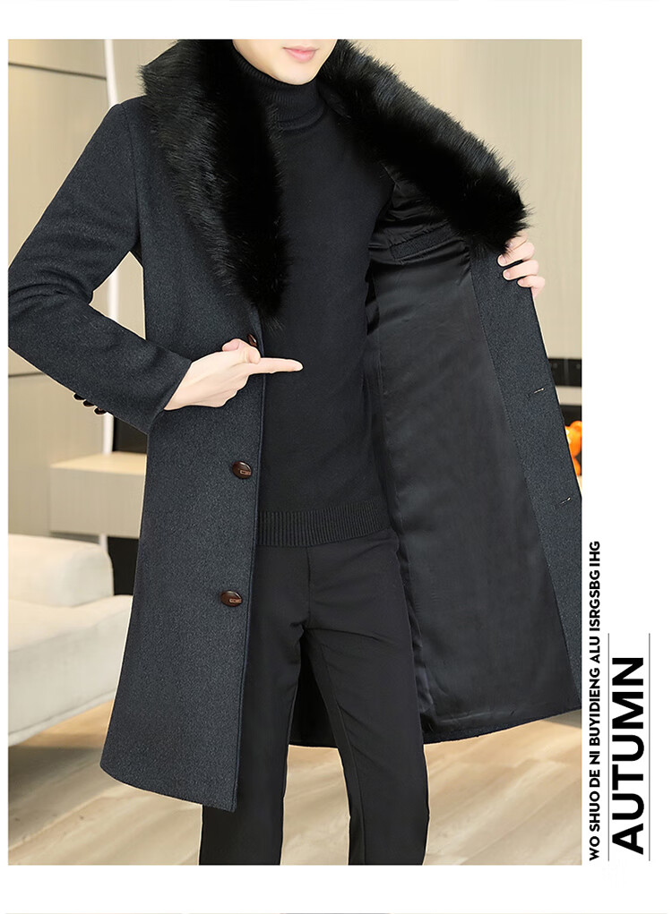Pierre Cardin autumn and winter men's extended length knee-length woolen coat jacket trendy business men's thickened fur collar woolen windbreaker black XL