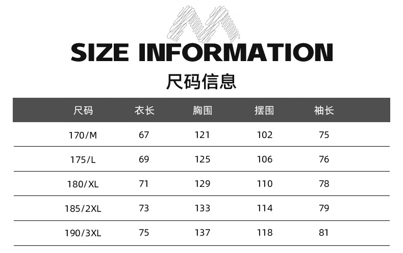 China (cm) 165 / 88-90 170 / 96-98 175 / 108-110 180 / 118-122 185 / 126-130