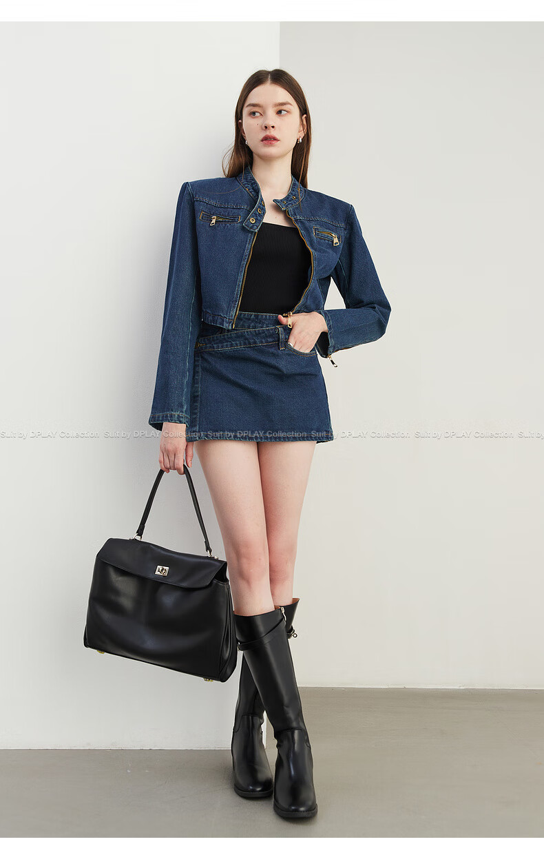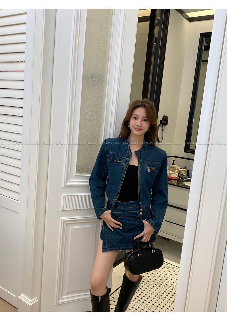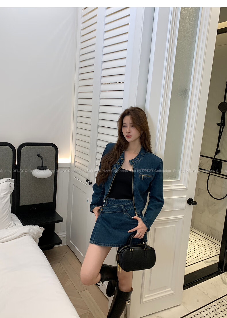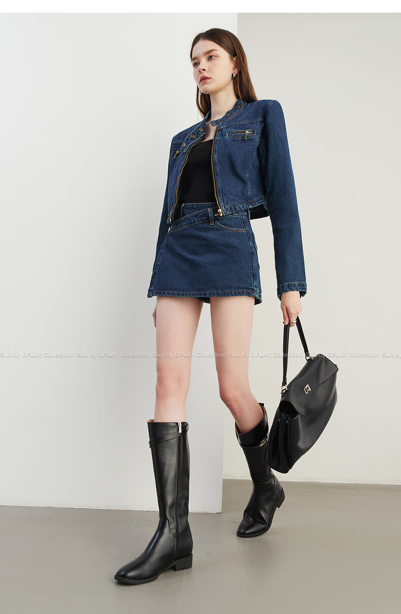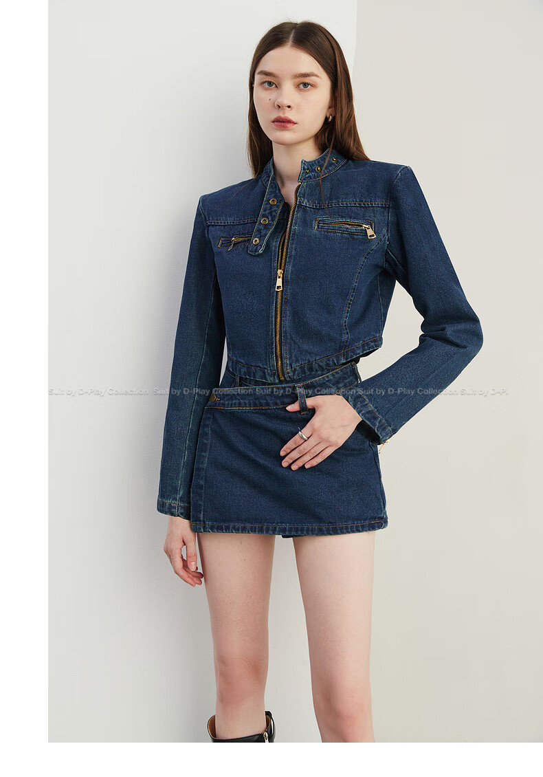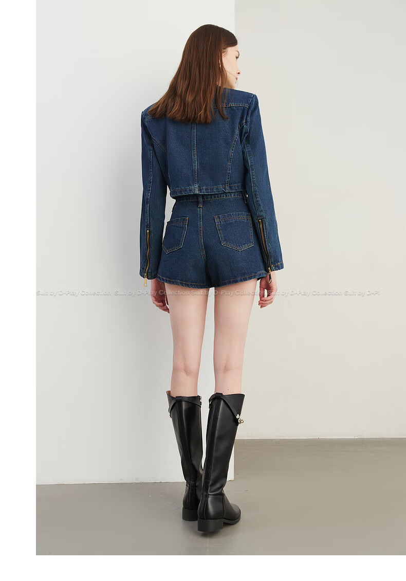 DPLAY2025 autumn retro commuter dark denim blue round neck washed fabric long-sleeved denim short suit dark denim blue S