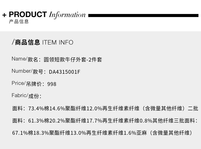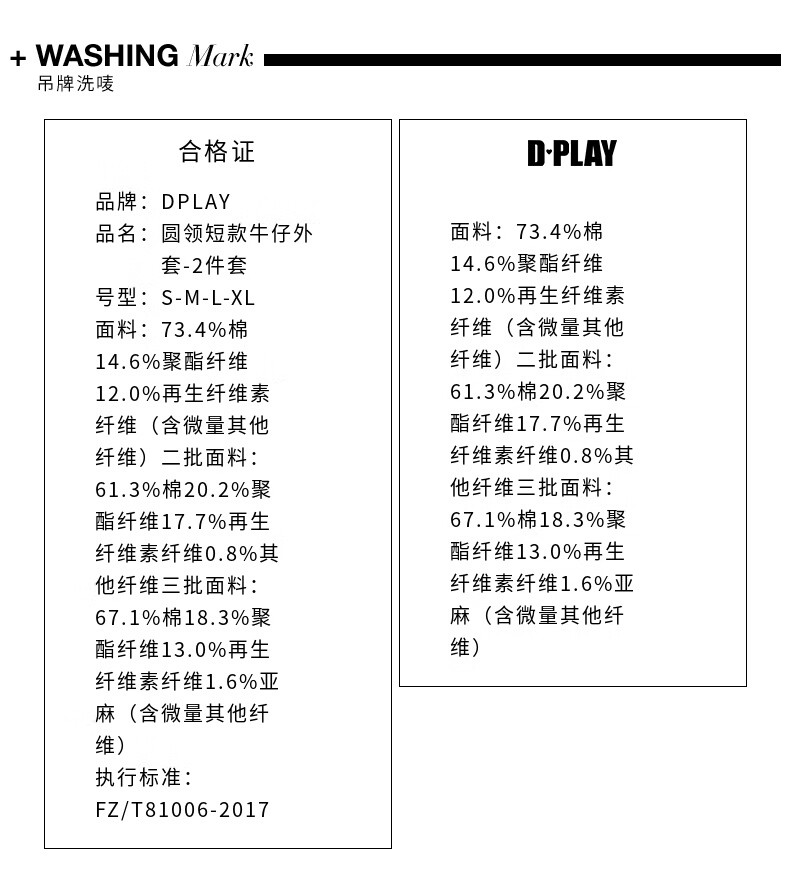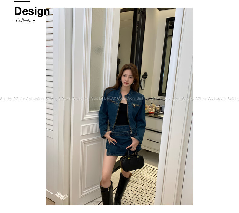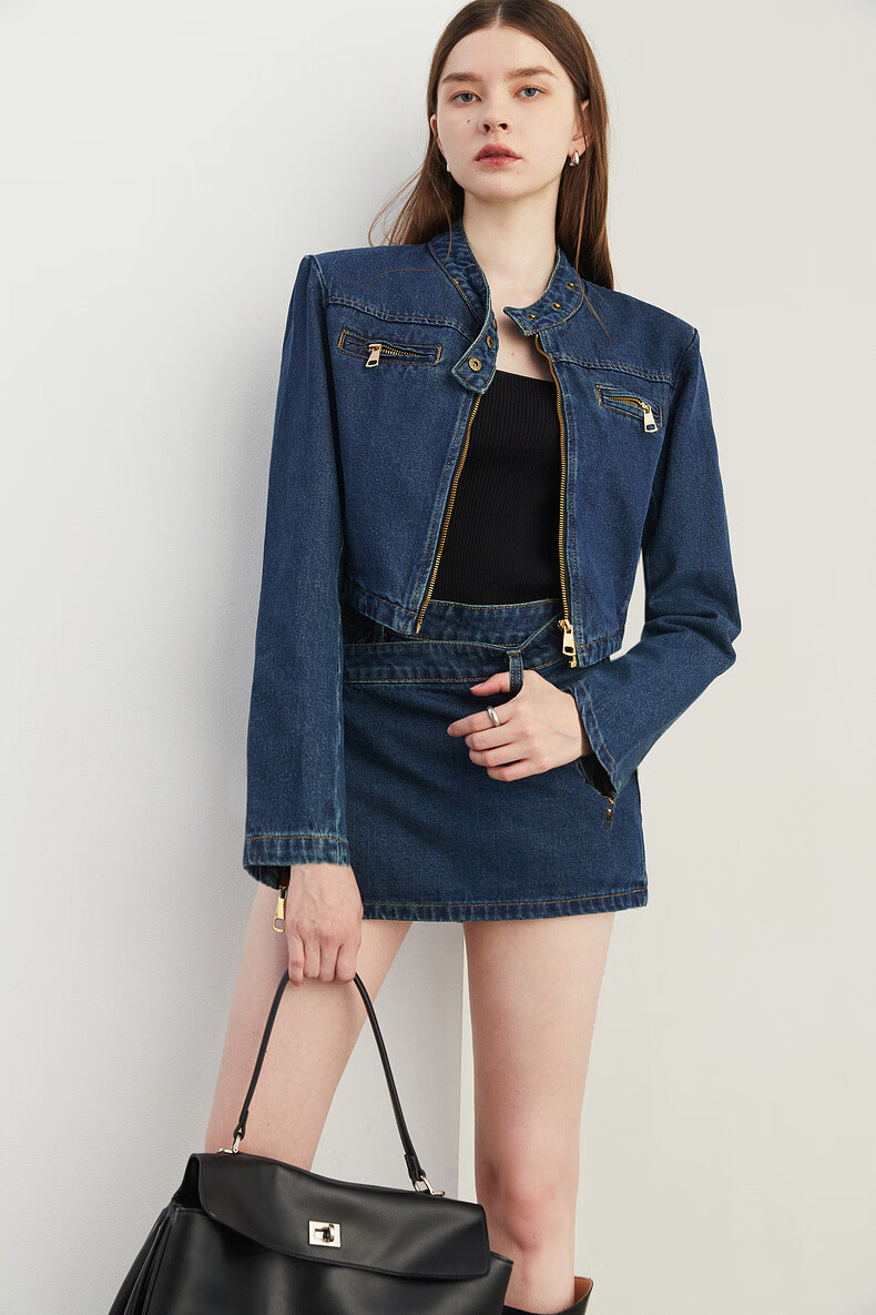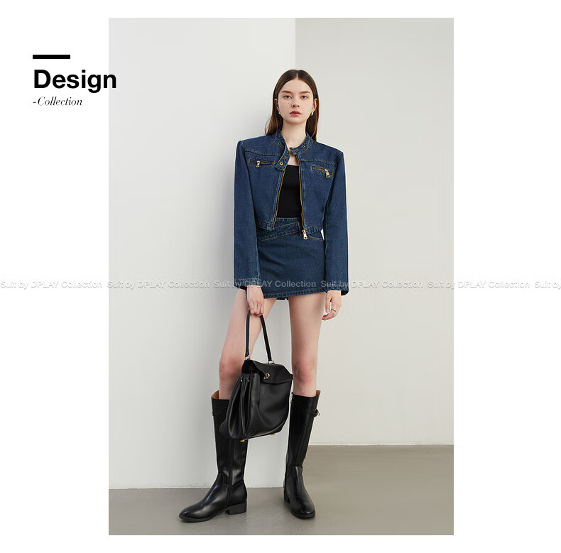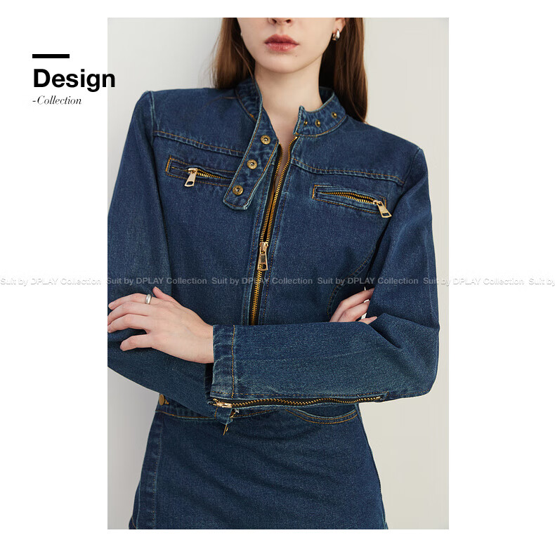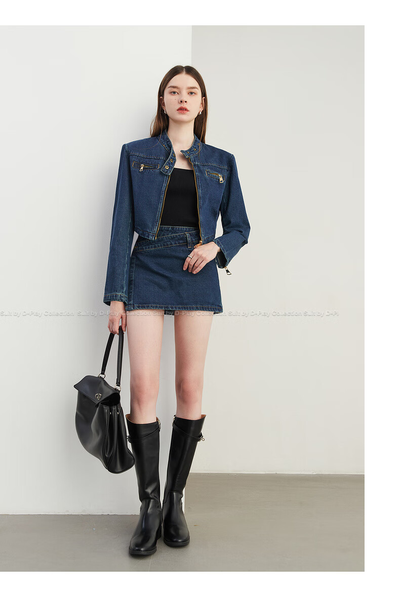 DPLAY2025 autumn retro commuter dark denim blue round neck washed fabric long-sleeved denim short suit dark denim blue S