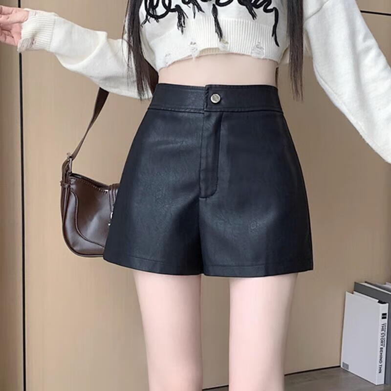 New style small leather shorts for women in autumn and winter, new black American shorts, versatile high-waisted, A-line European goods, black L (recommended 105-110 Jin Jin equals 0.5 kg)