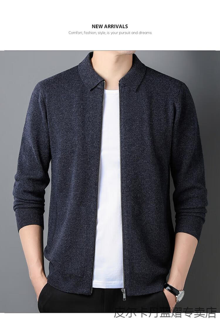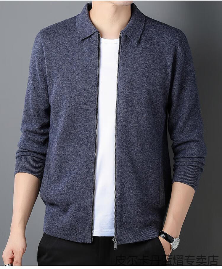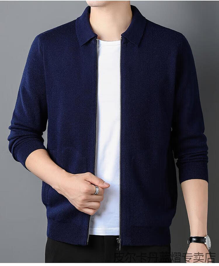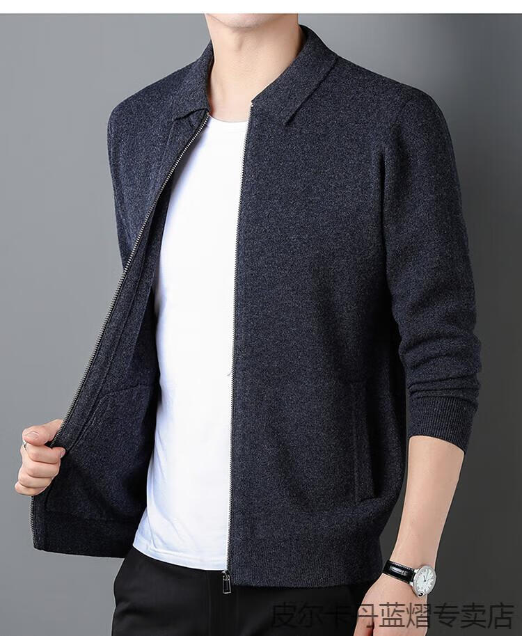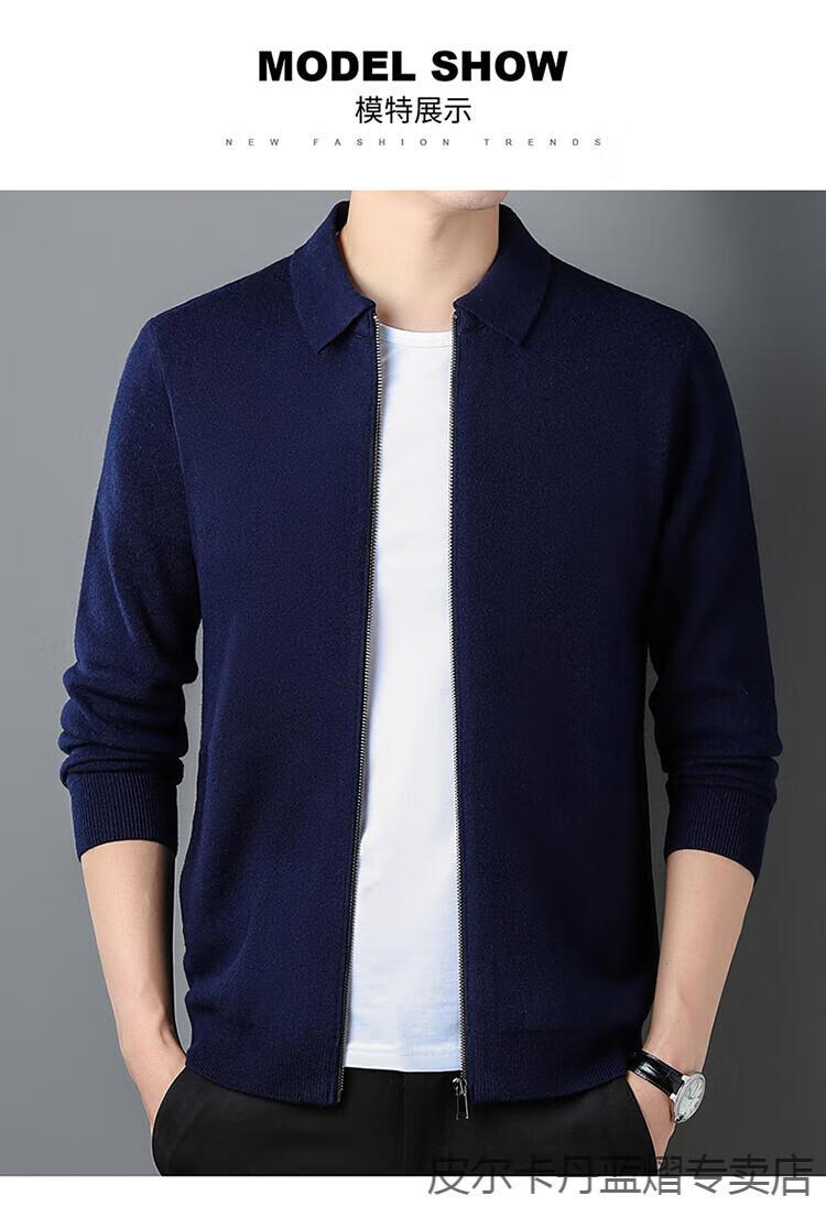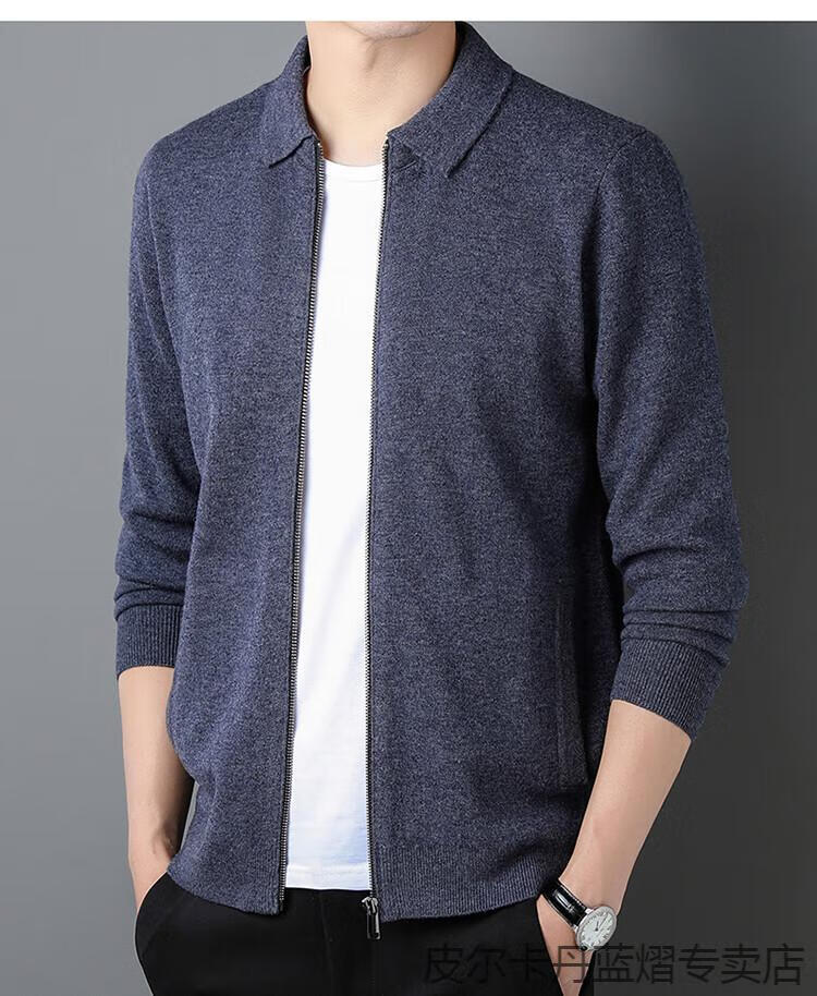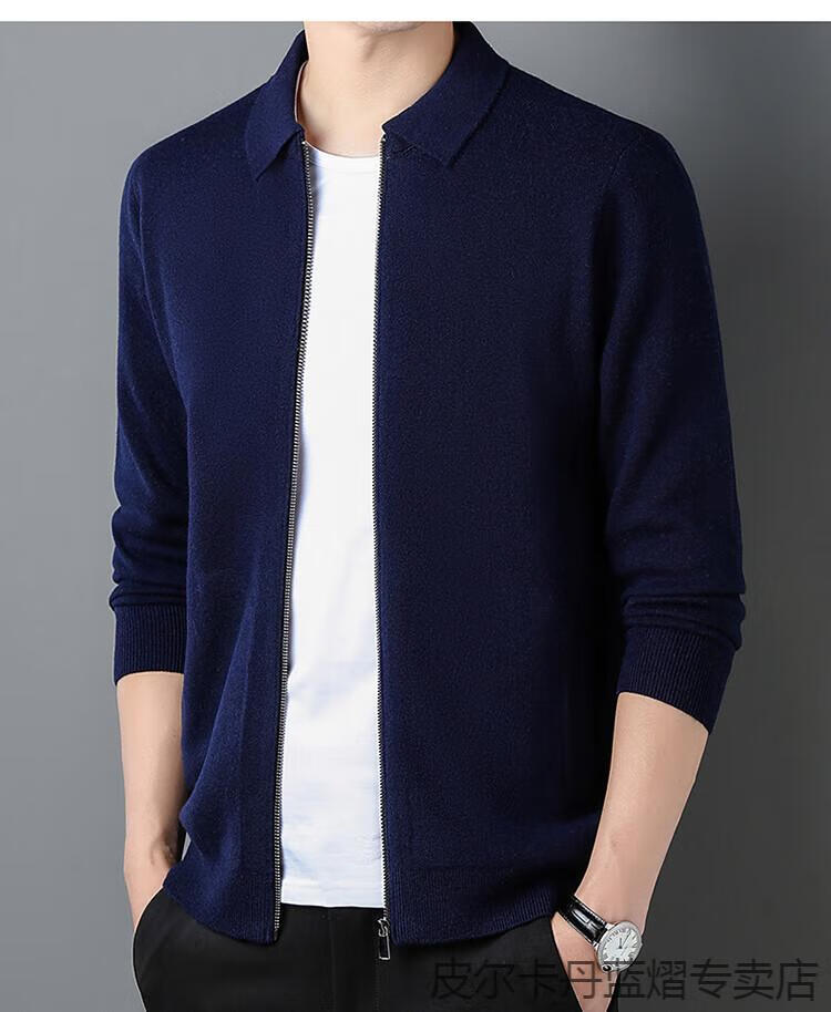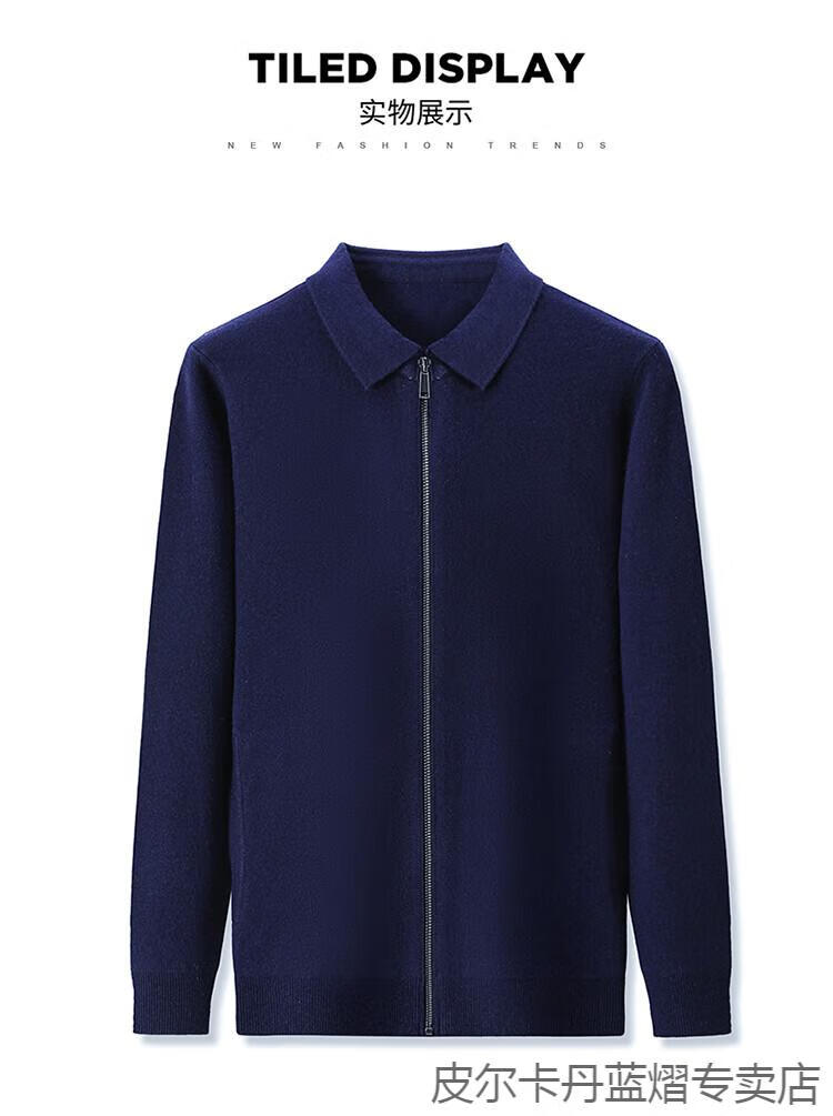 Pierre Cardin 100% pure cashmere sweater men's full zipper cardigan sweater autumn and winter thickened warm lapel sweater jacket navy blue high-end gift box packaging L recommended 120-135 Jin Jin equals 0.5 kg