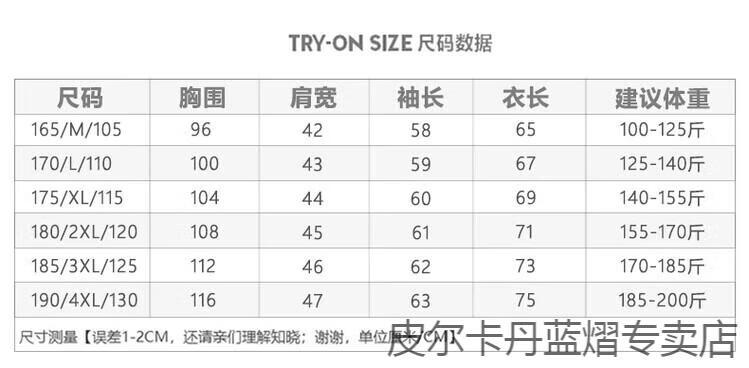 China (cm) 165 / 88-90 170 / 96-98 175 / 108-110 180 / 118-122 185 / 126-130