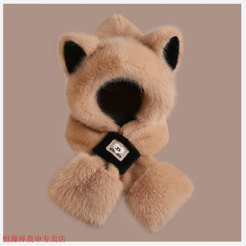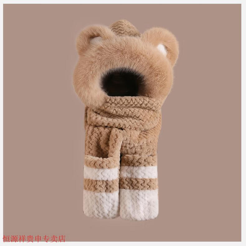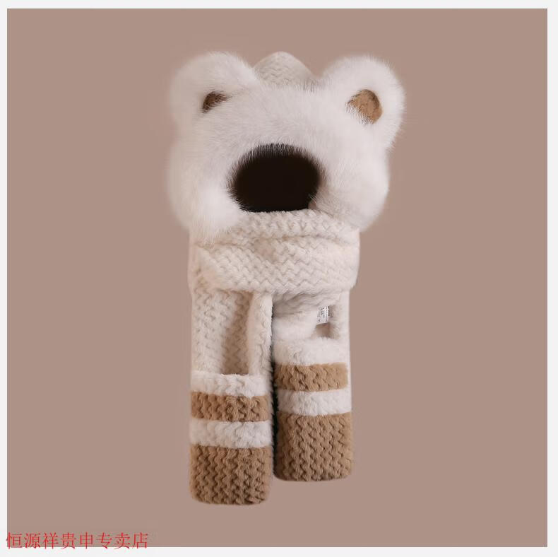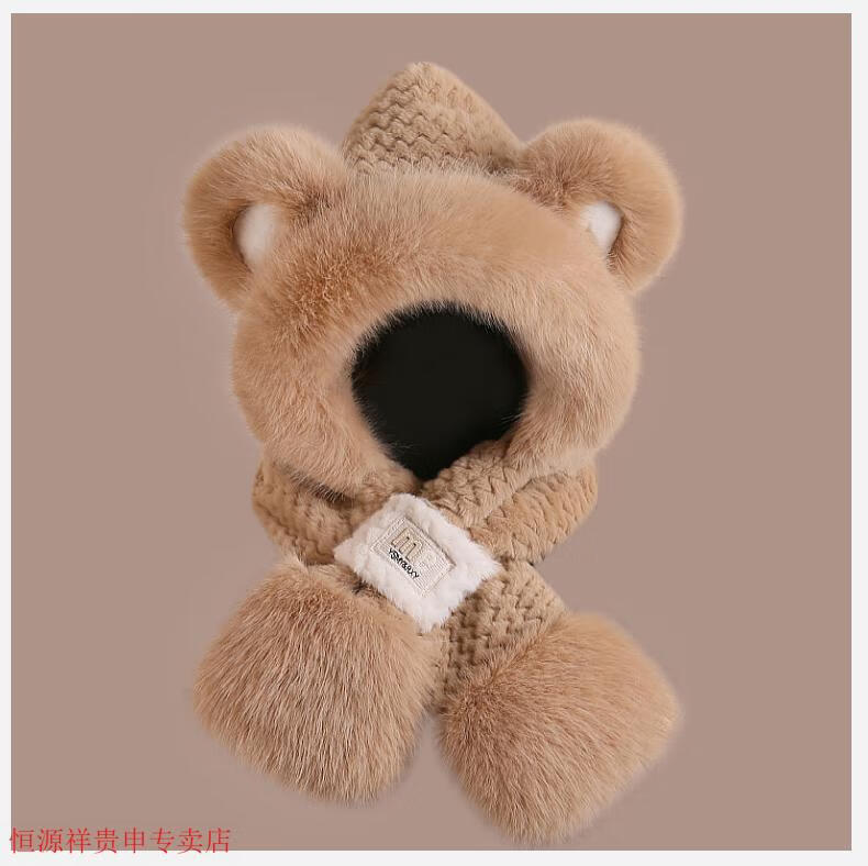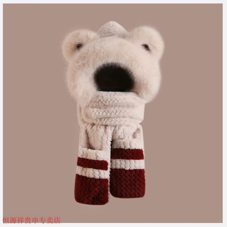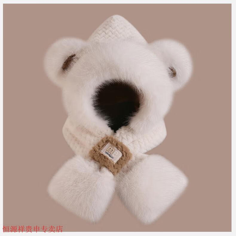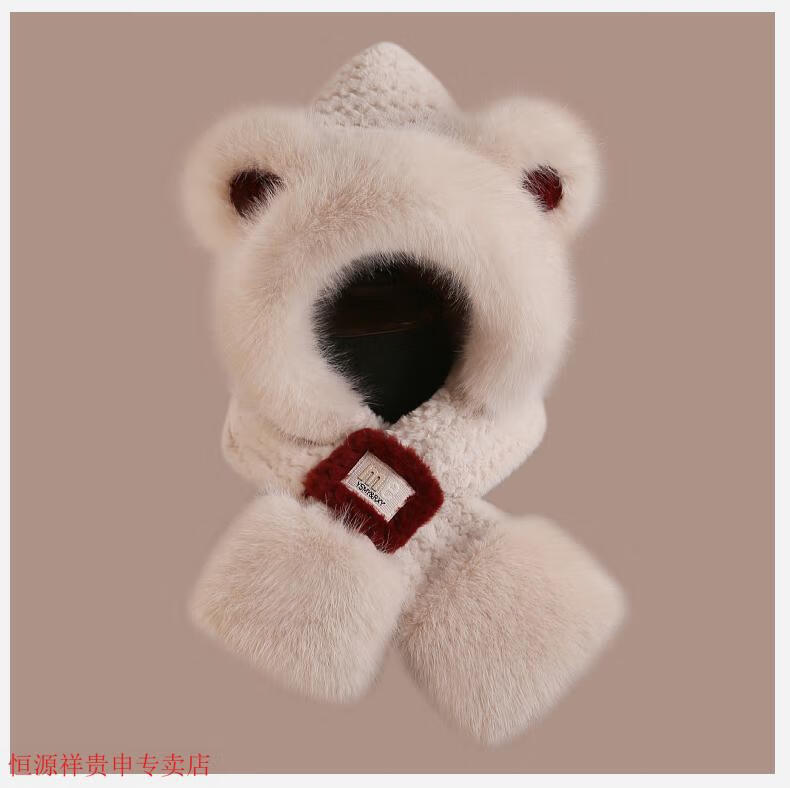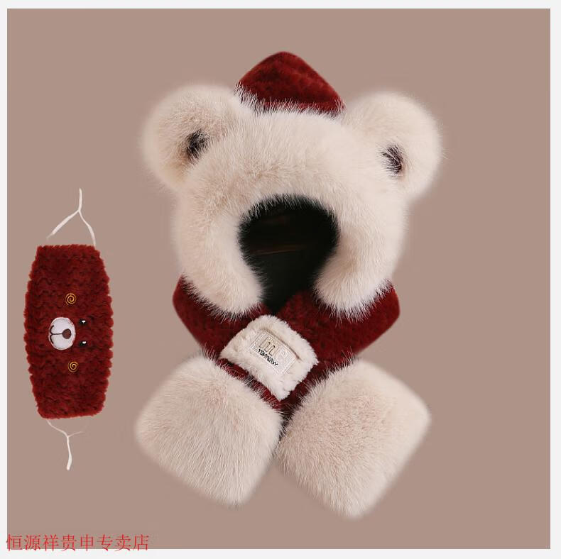 Hengyuanxiang cute bear hat and scarf all-in-one women's winter new thickened headgear, ear protection hat, neck scarf plush hat, Angora red--AN color matching bear hat + mask, one size fits all head sizes