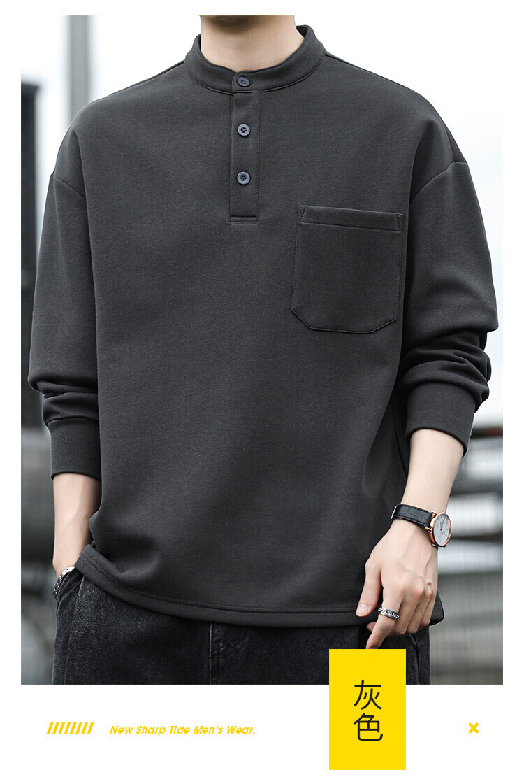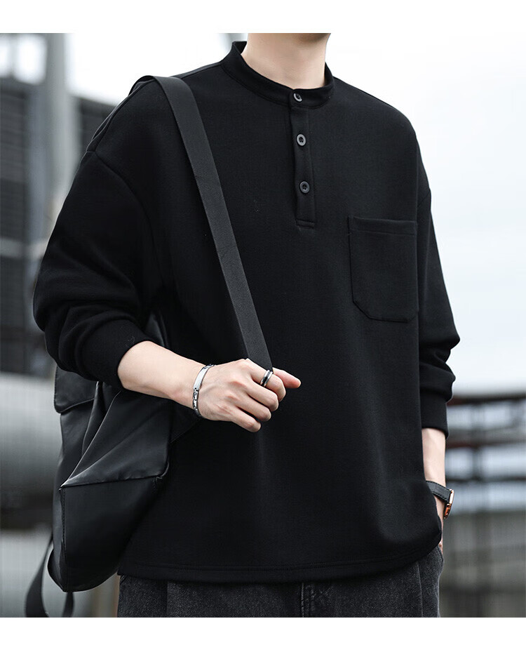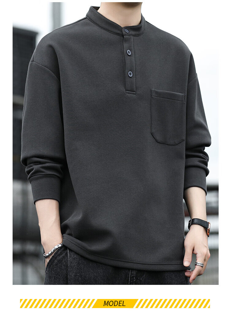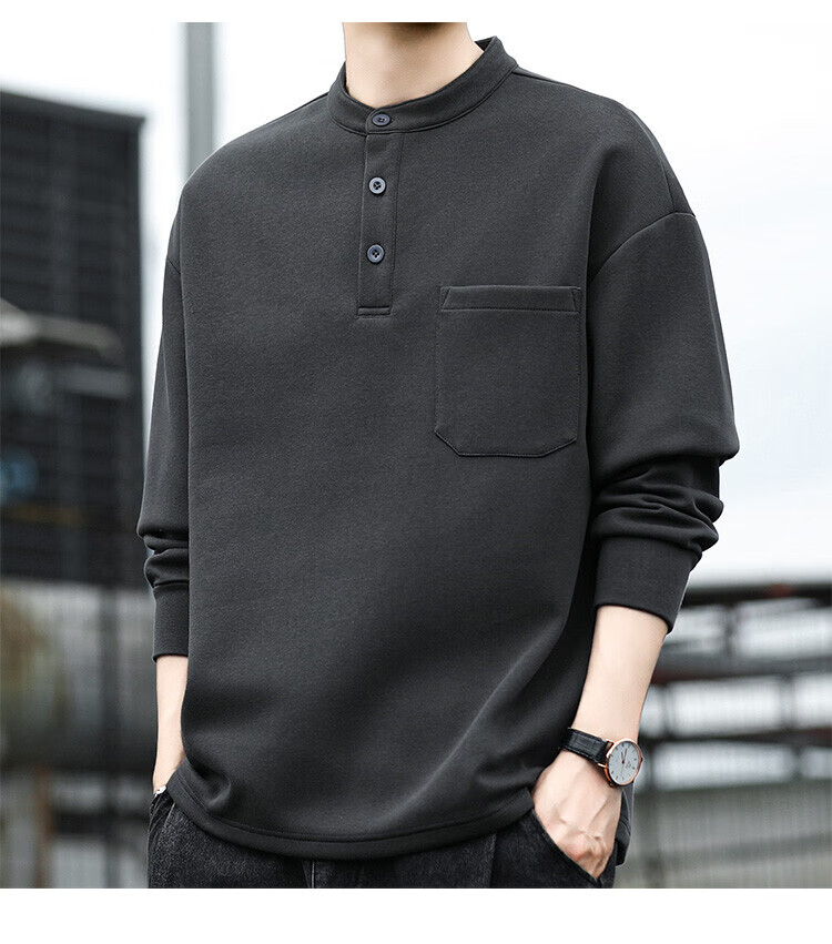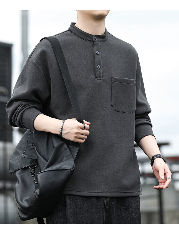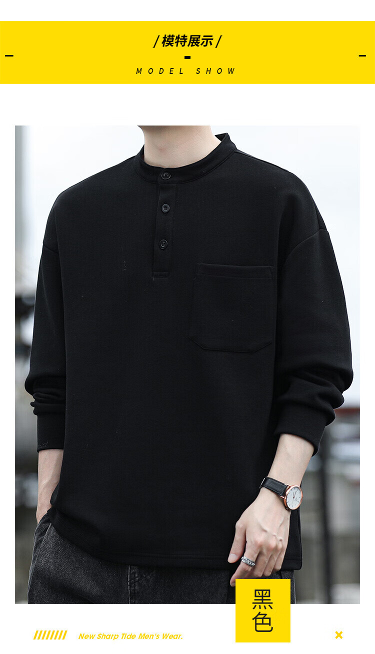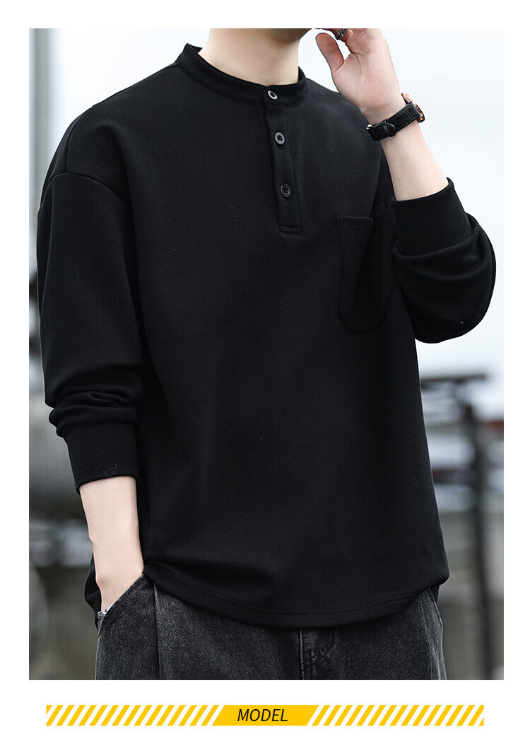 ROMON autumn and winter velvet thickened men's long-sleeved sweatshirt, fashionable, warm and versatile, casual T-shirt, Henry collar loose bottoming shirt, black, velvet XL