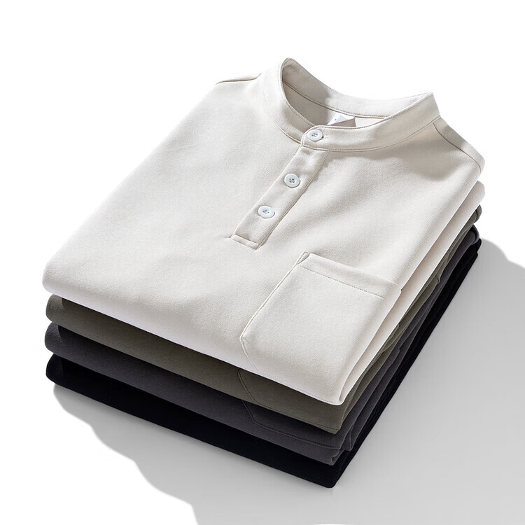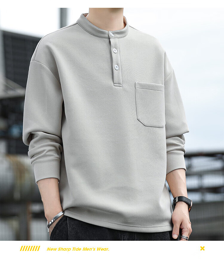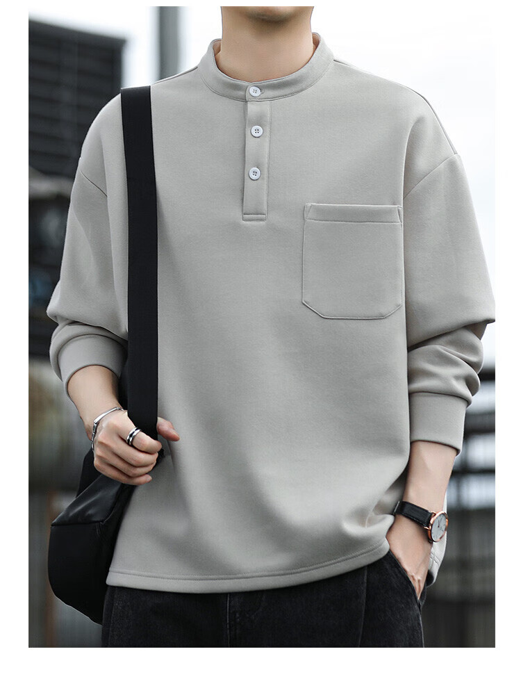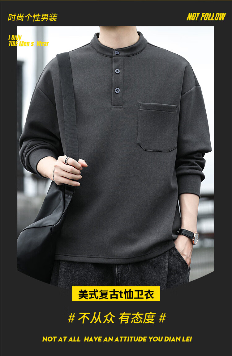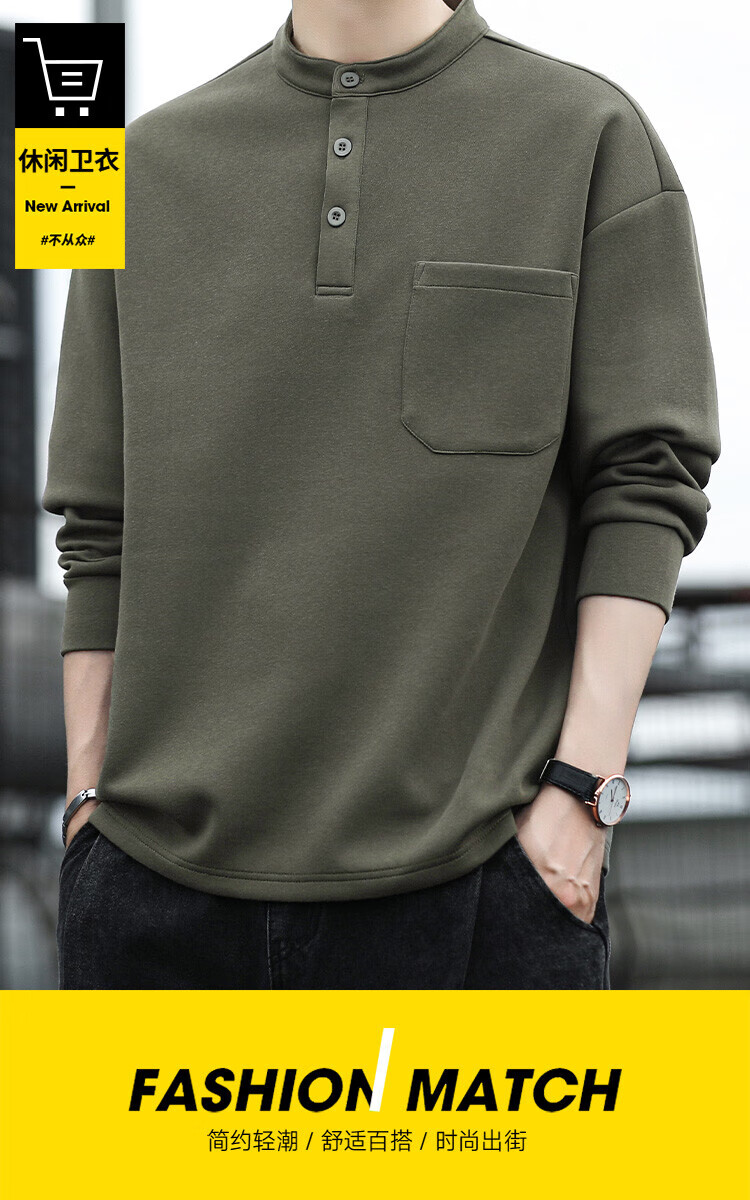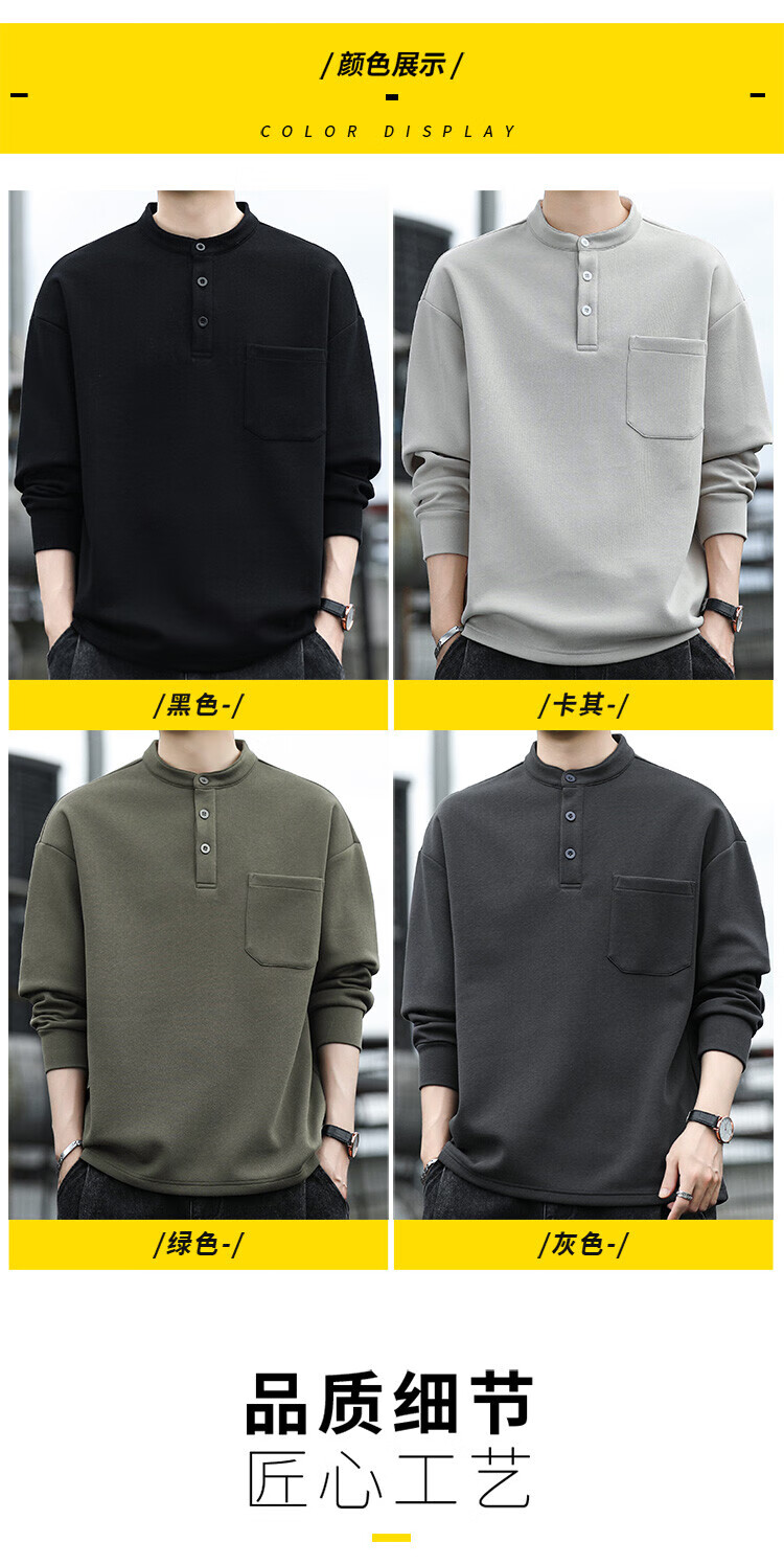 ROMON autumn and winter velvet thickened men's long-sleeved sweatshirt, fashionable, warm and versatile, casual T-shirt, Henry collar loose bottoming shirt, black, velvet XL