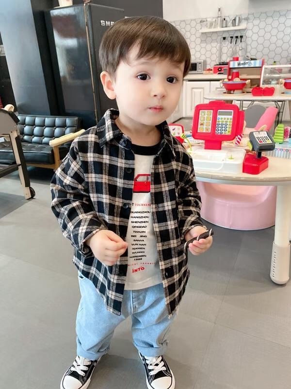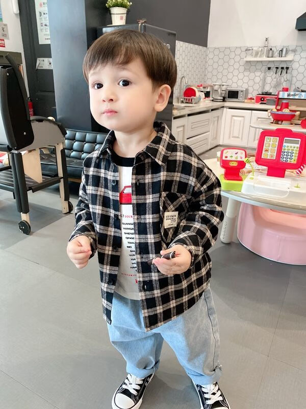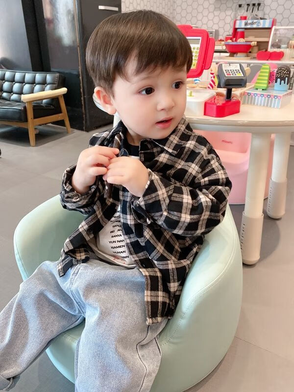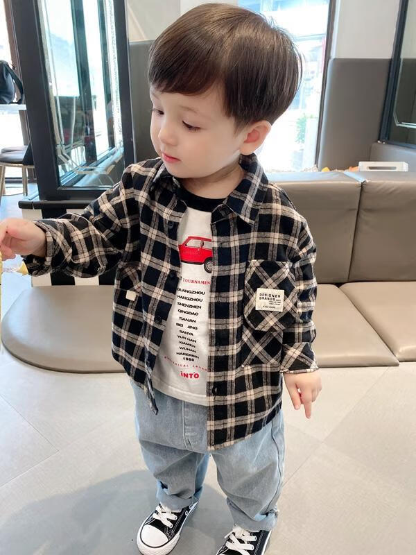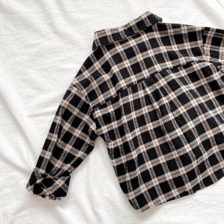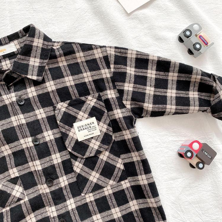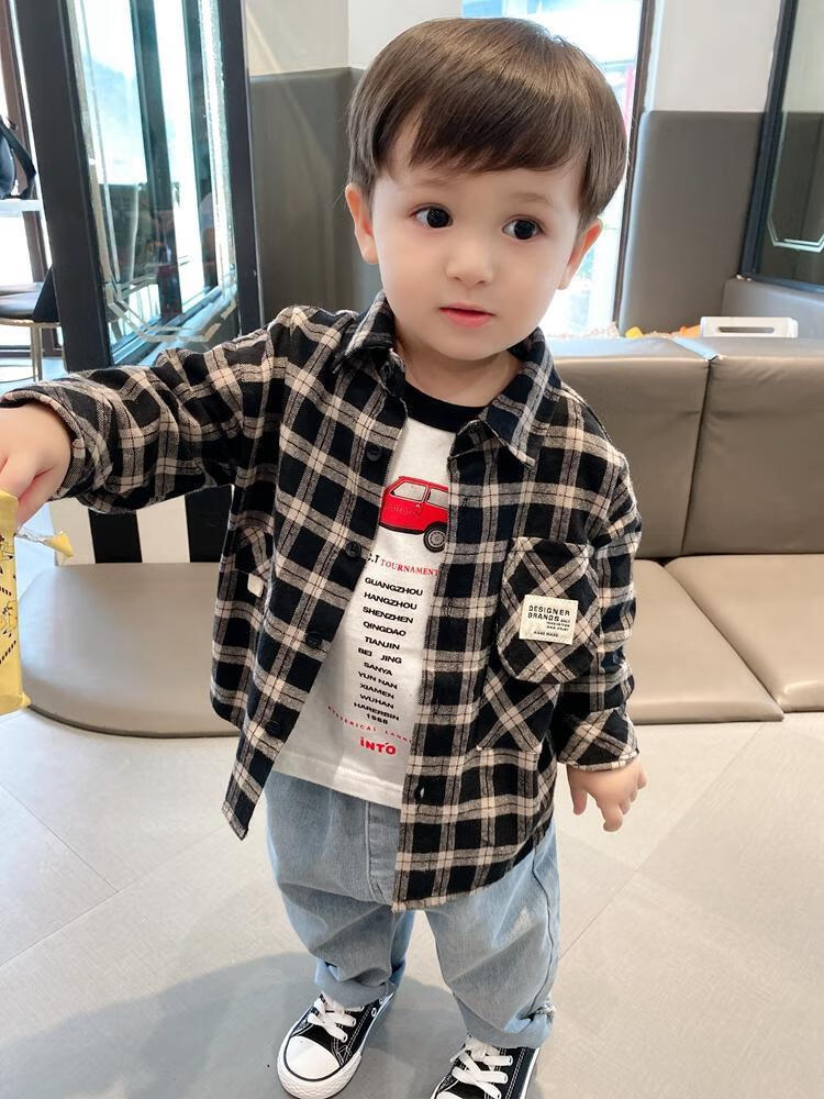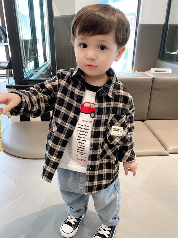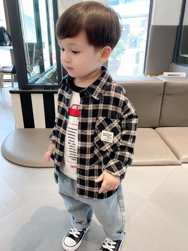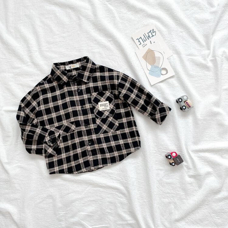 Pisces Rabbit (SHUAGNYUTU) boys' shirt spring and autumn handsome children's shirt long-sleeved baby plaid top Korean style spring style thin coat black plaid spring and autumn 90