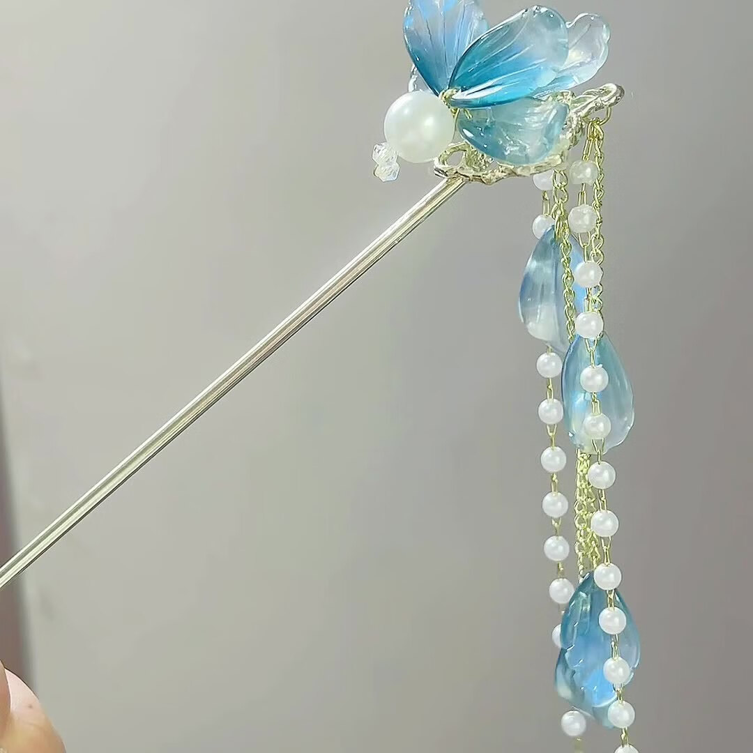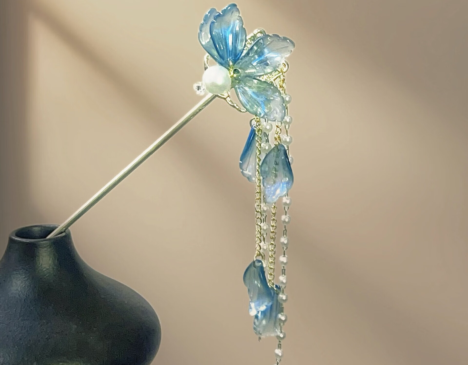 Shena ancient style blue flower hairpin, high-end new Chinese style pearl tassels, gift to girlfriend hair accessories, hairpin, blue petals