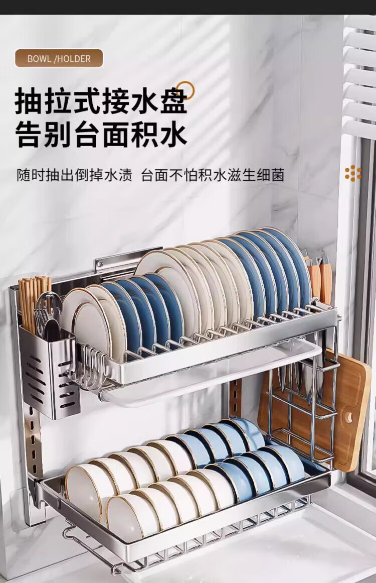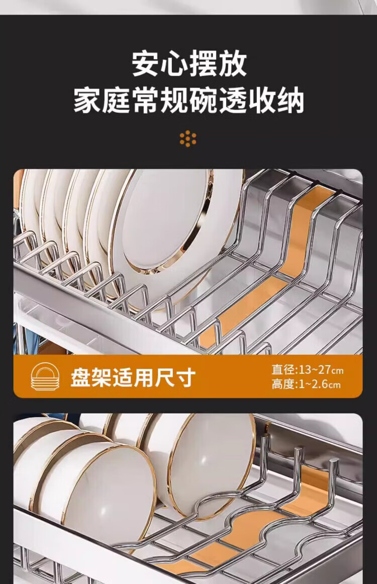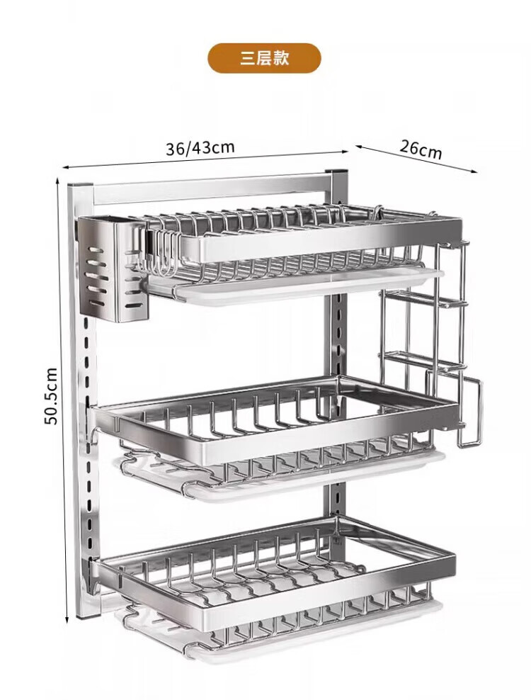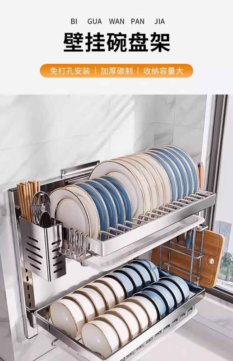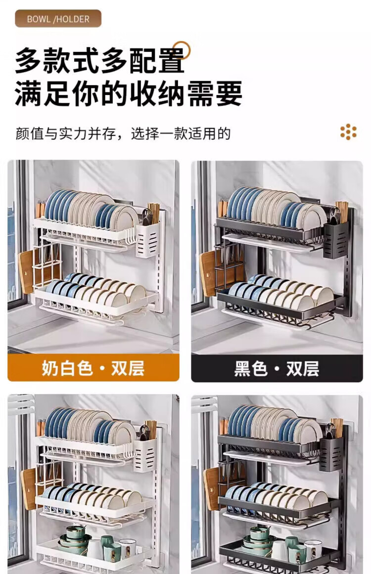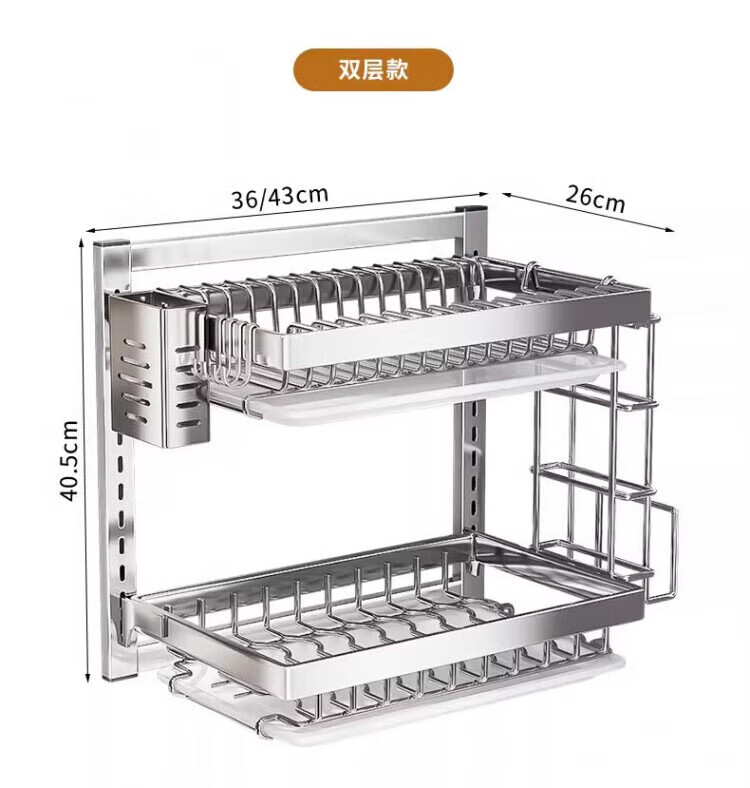 JCZS German brand stainless steel dish storage rack kitchen storage rack wall-mounted punch-free dish rack bowl chopsticks bowl plate drain black carbon steel 36cm double layer standard with drain tray