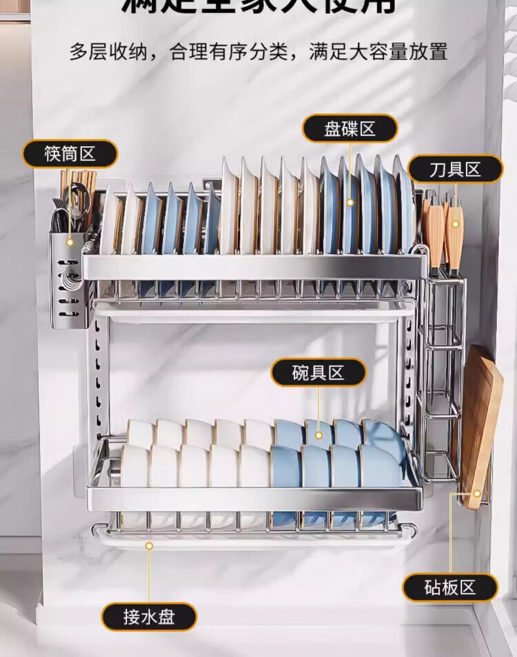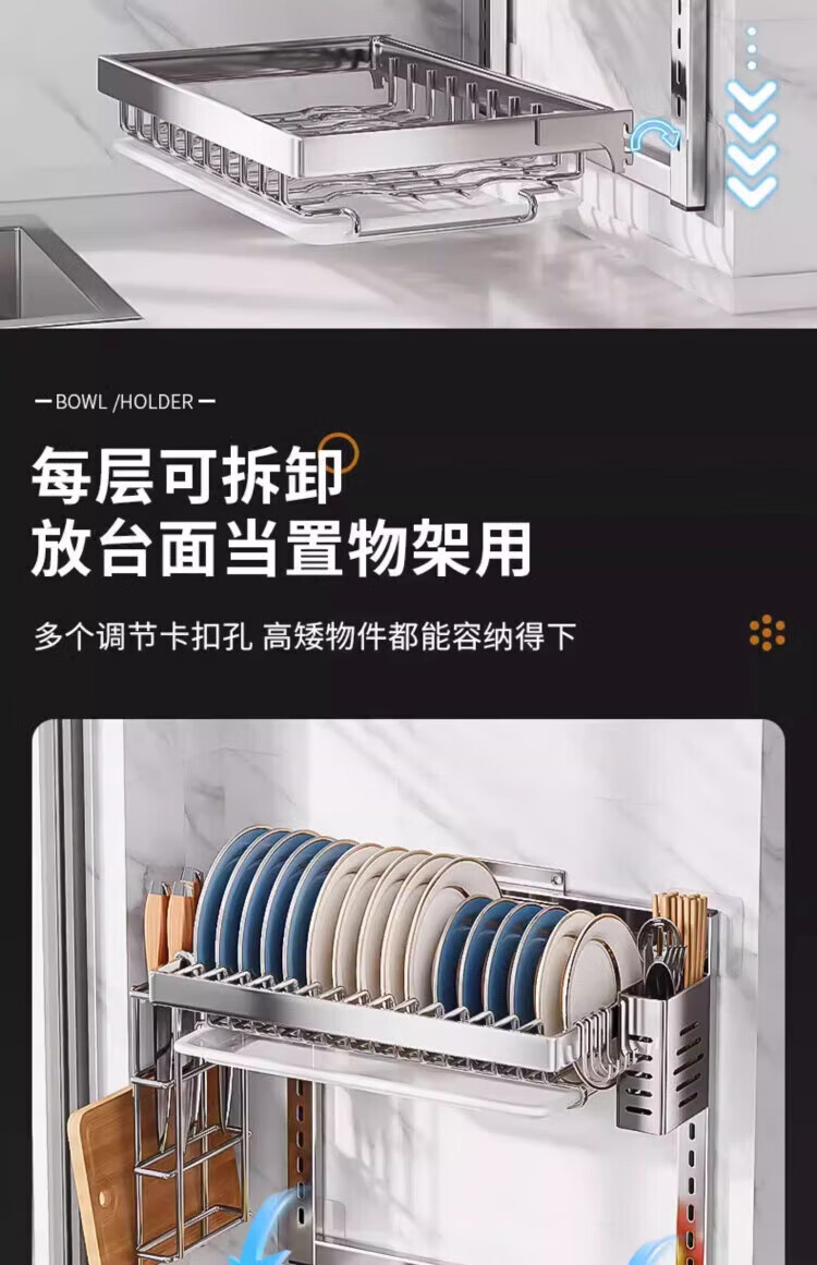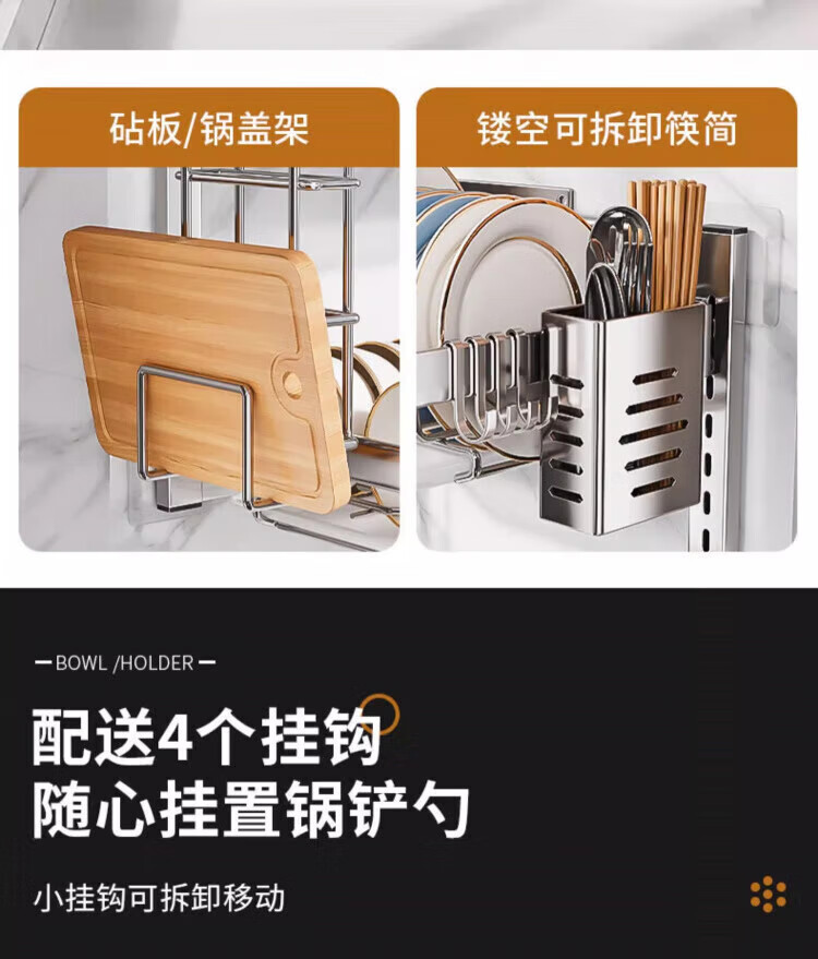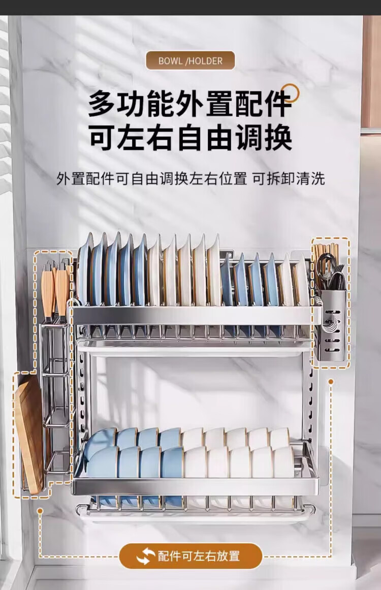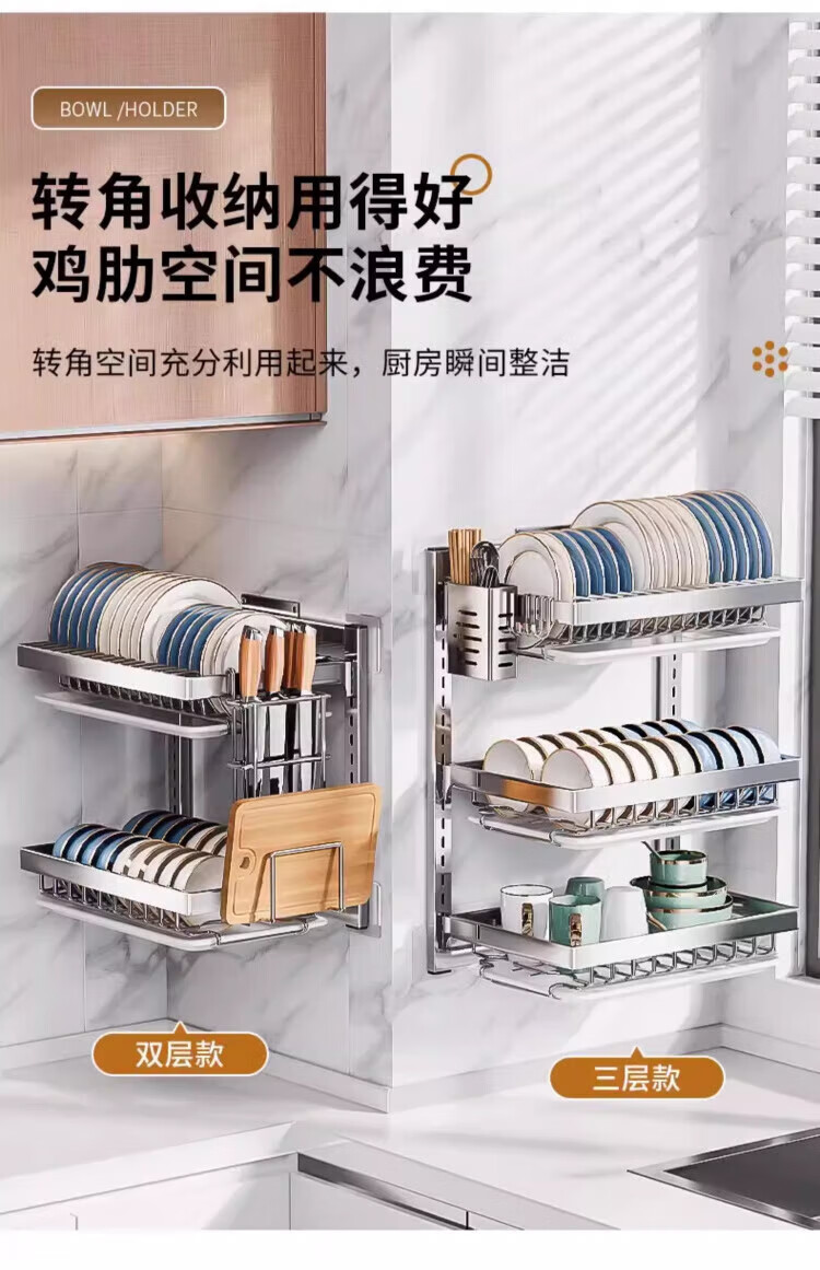 JCZS German brand stainless steel dish storage rack kitchen storage rack wall-mounted punch-free dish rack bowl chopsticks bowl plate drain black carbon steel 36cm double layer standard with drain tray
