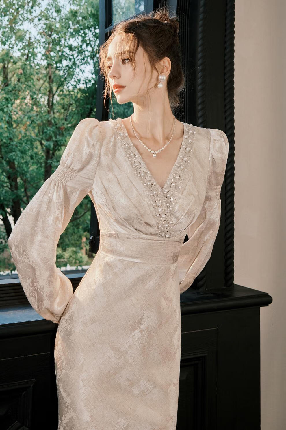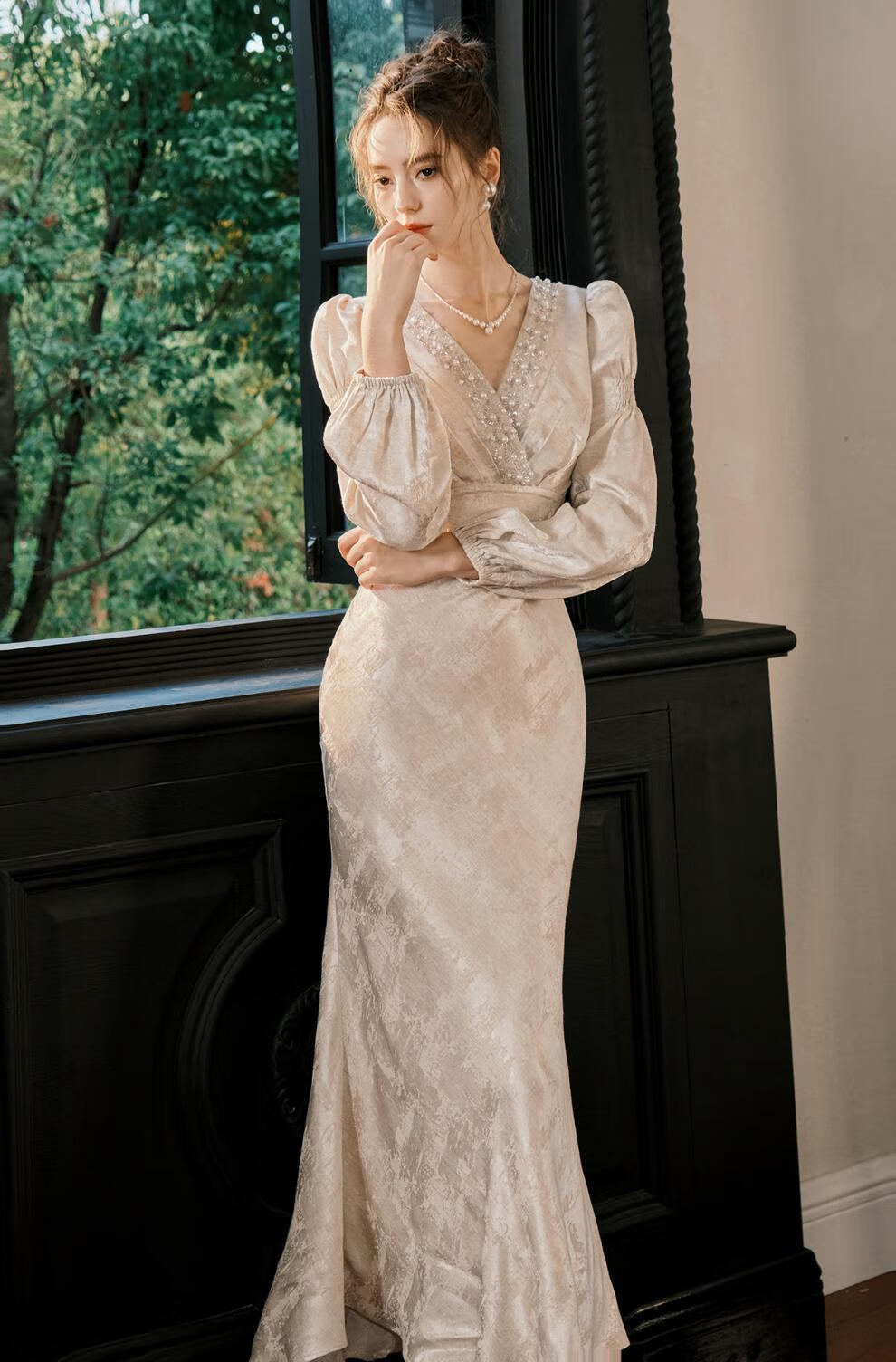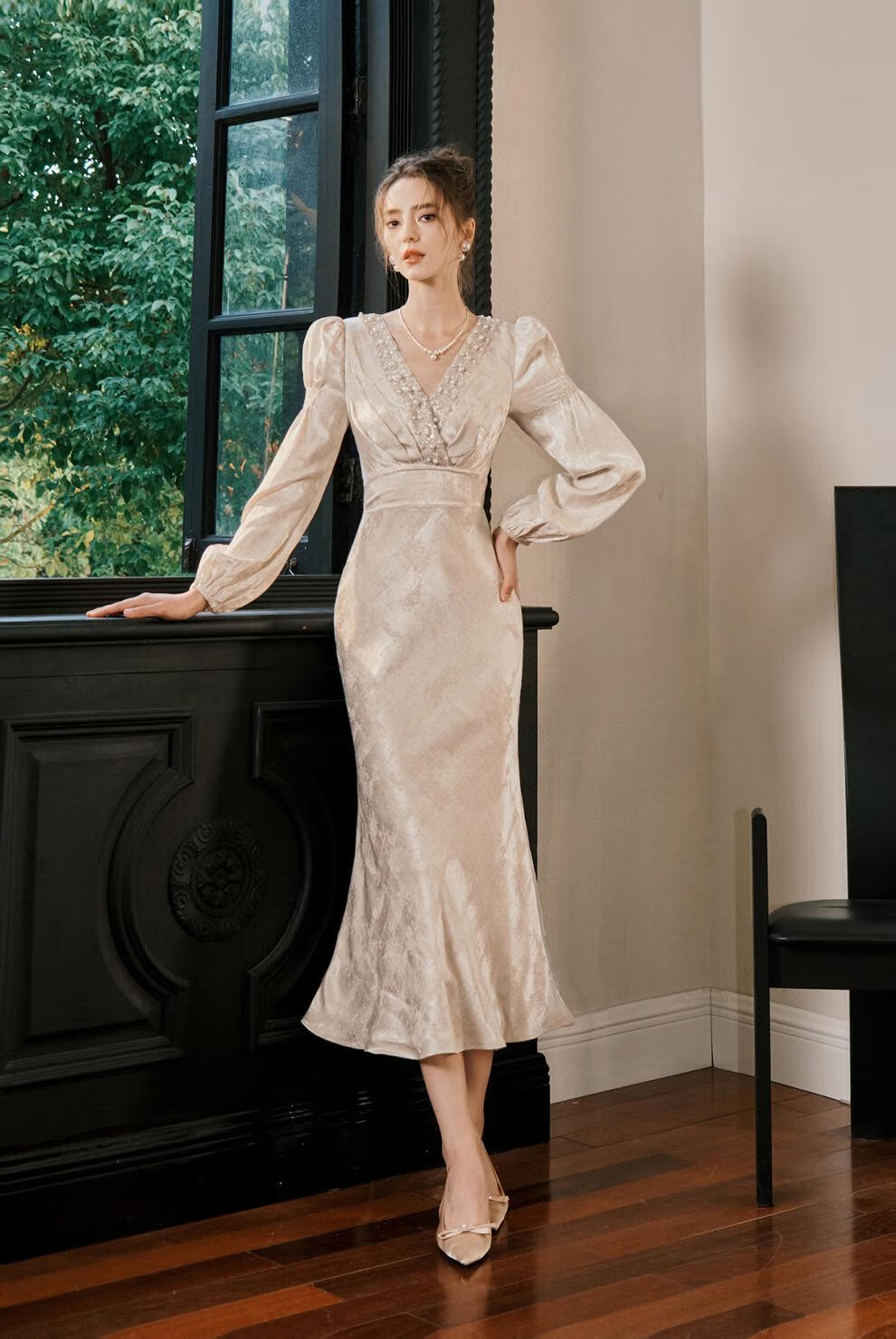 GJFD Sandalwood Snow French long-sleeved dress engagement light luxury fishtail elegant dress skirt Sandalwood Snow S