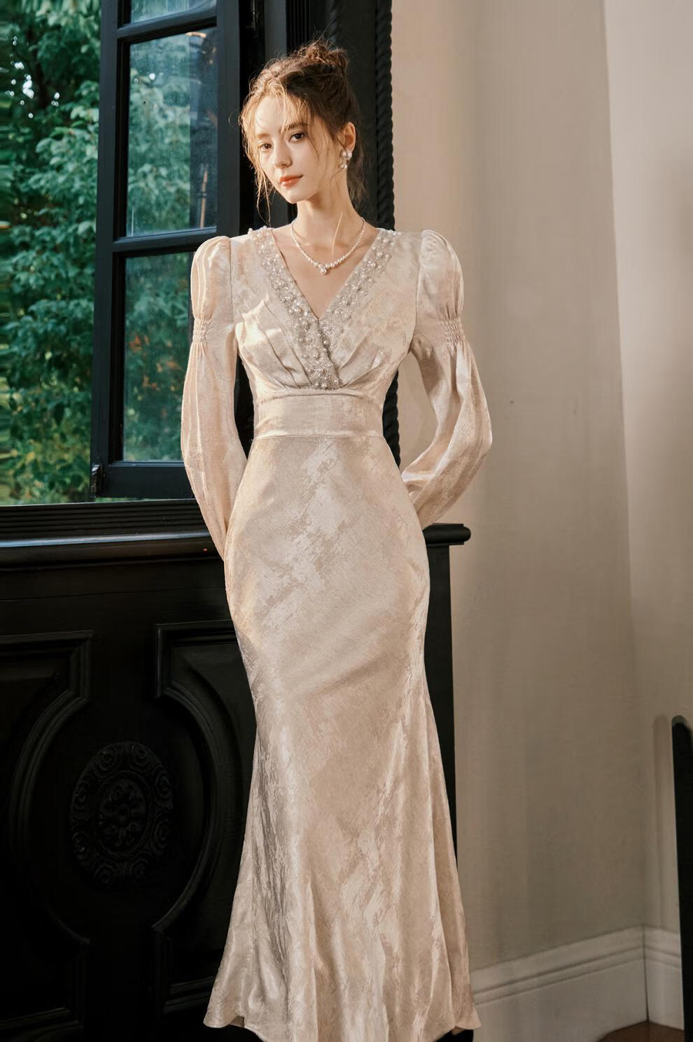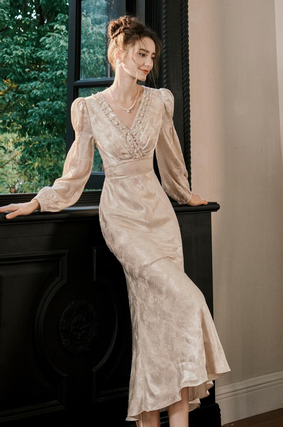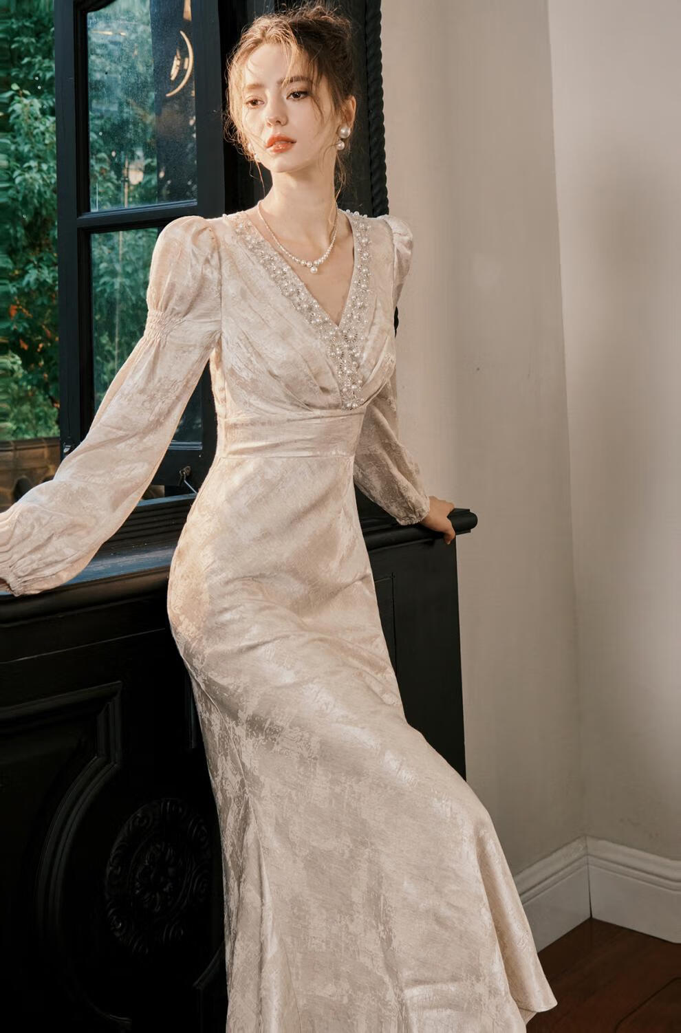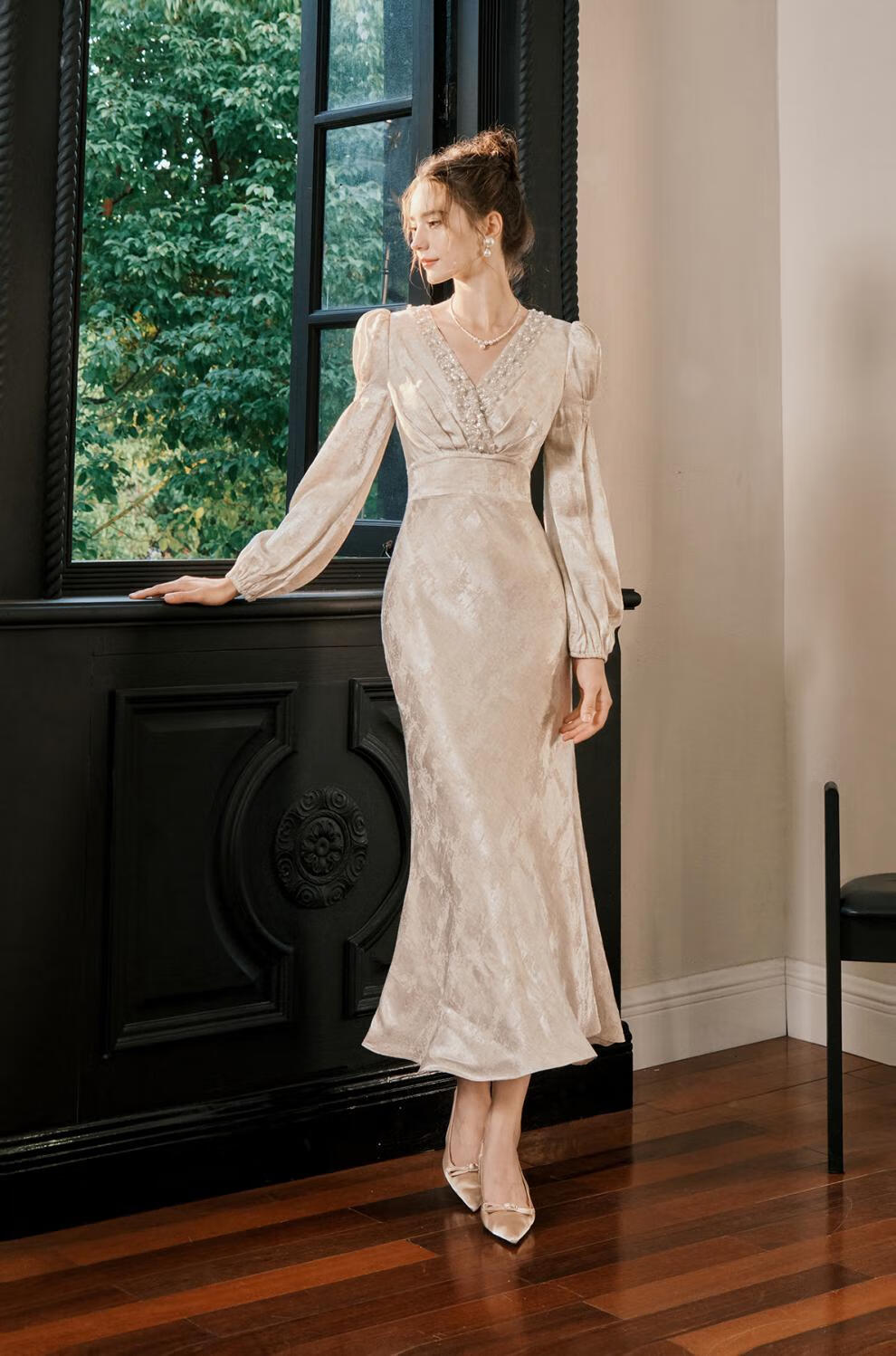 GJFD Sandalwood Snow French long-sleeved dress engagement light luxury fishtail elegant dress skirt Sandalwood Snow S