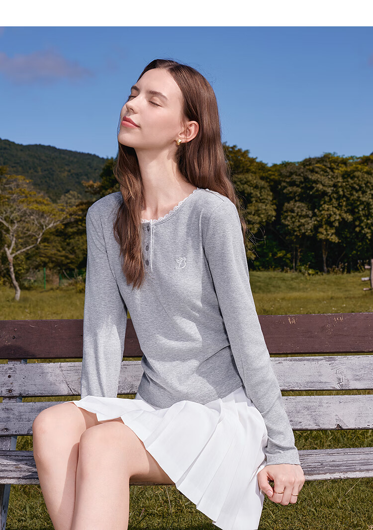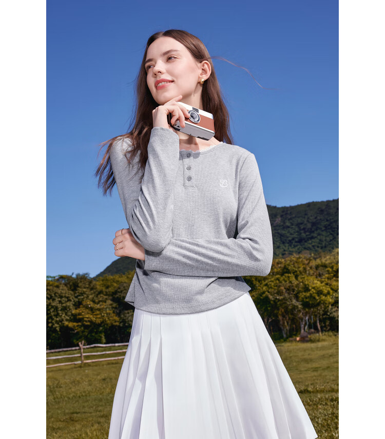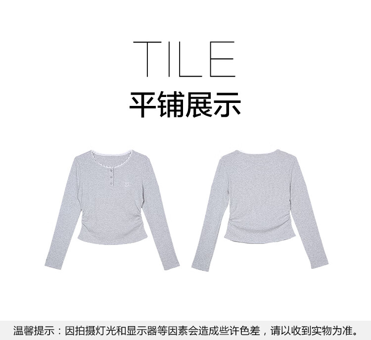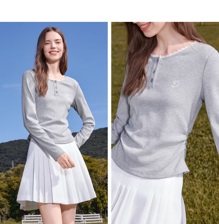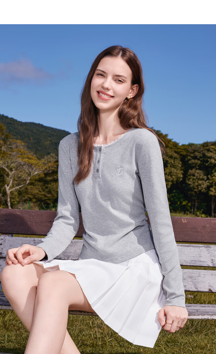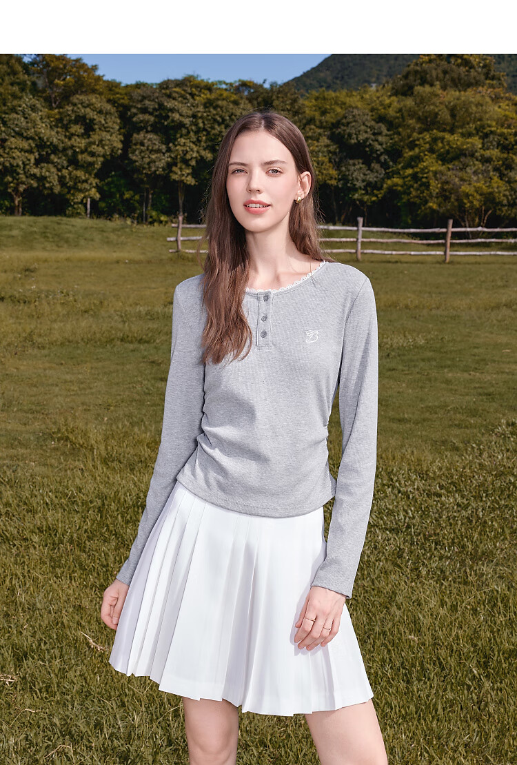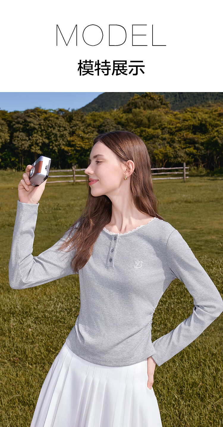 Betu Women's Clothing 2025 Autumn New T-shirt Collar Splicing Lace Pleated Waist Slim T Long Sleeve 2508T22 Light Gray L