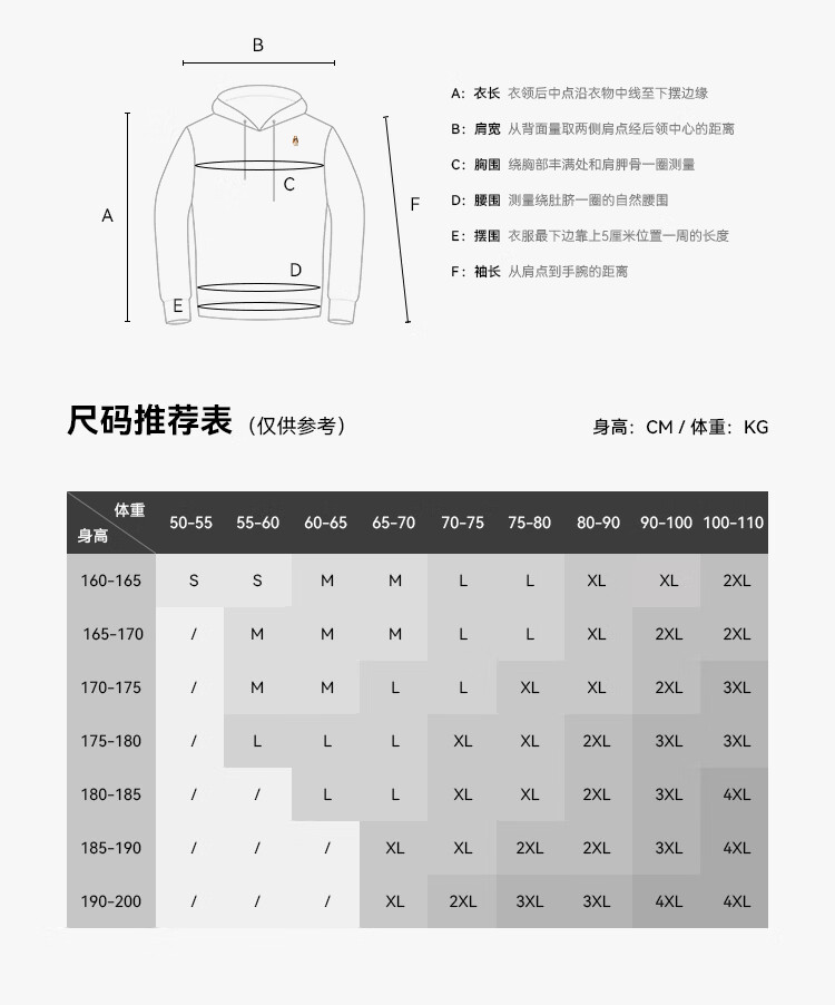 China (cm) 165 / 88-90 170 / 96-98 175 / 108-110 180 / 118-122 185 / 126-130