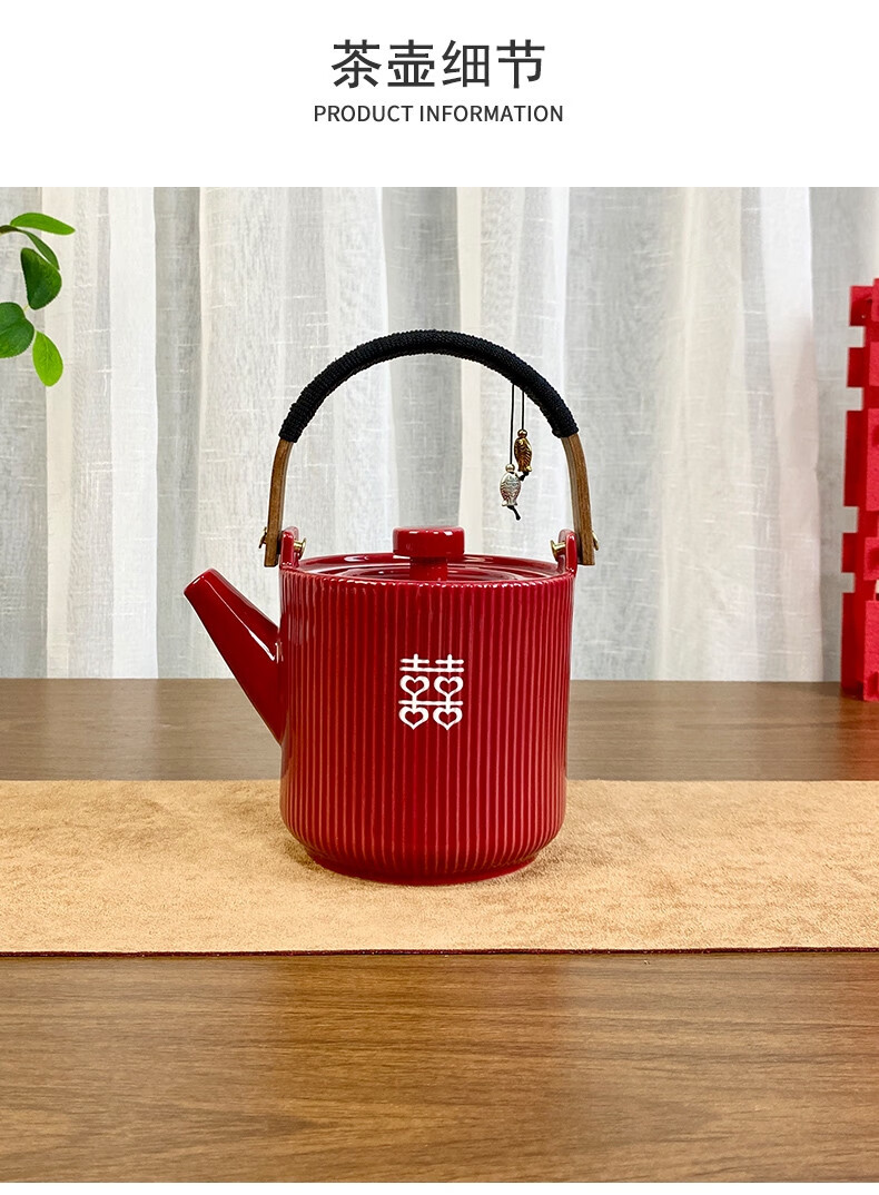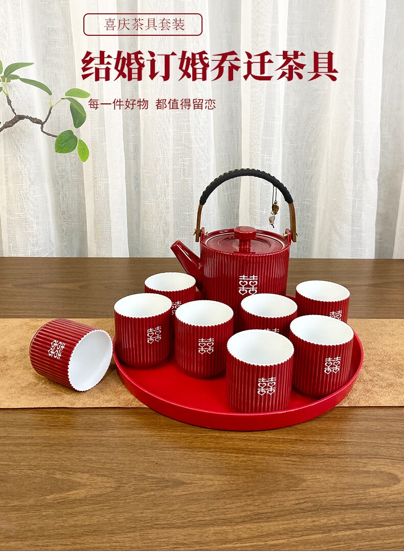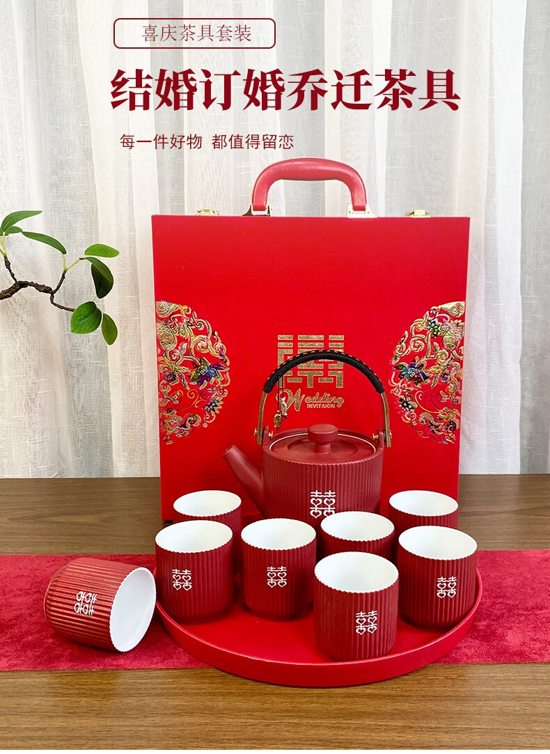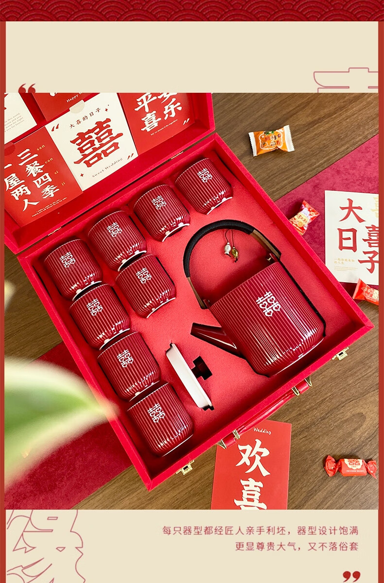 Fantasy wedding tea set set red large teapot wedding cup newlywed tea cup engagement gift dowry gift frosted Pisces 1 pot 8 cups amine disc + suitcase