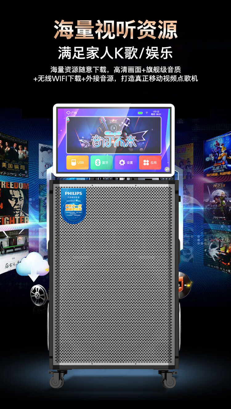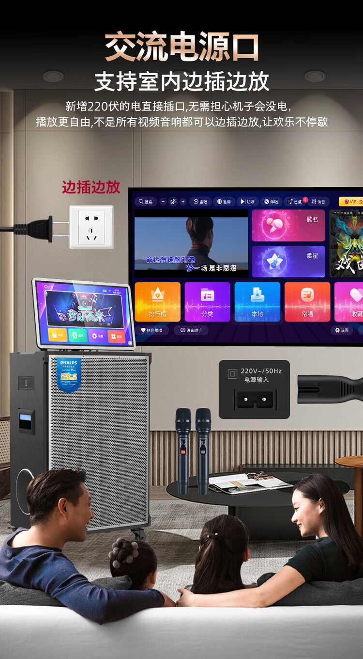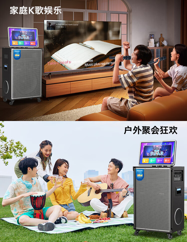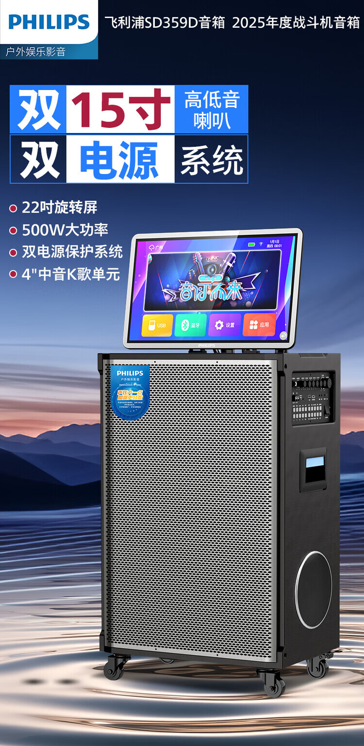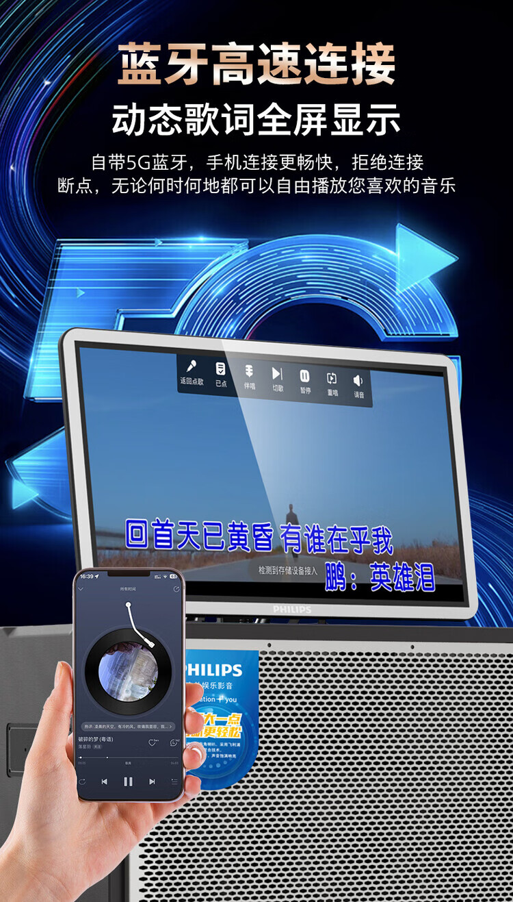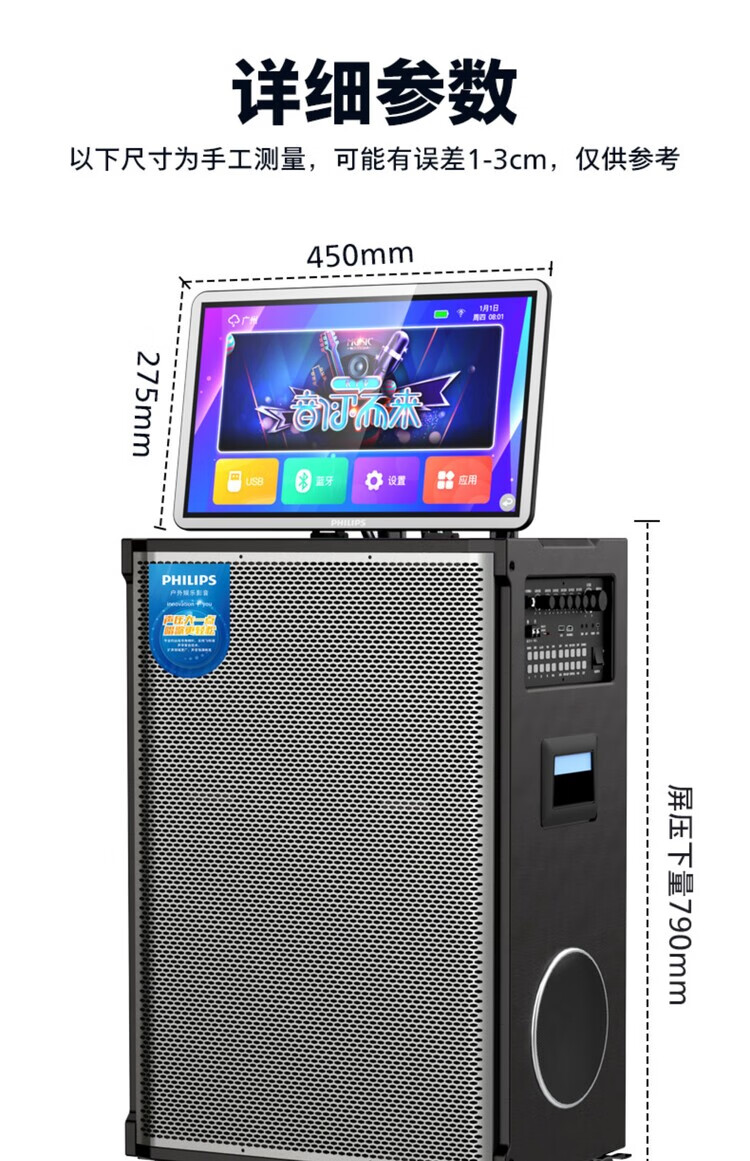 Philips (PHILIPS) 15-inch super bass outdoor audio large screen with sound card all-in-one KTV karaoke machine trolley speaker dual power supply/Bluetooth display lyrics 4 microphones