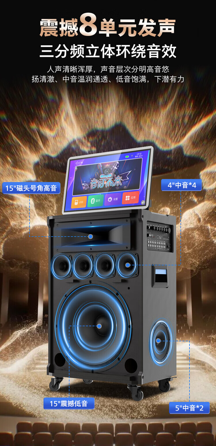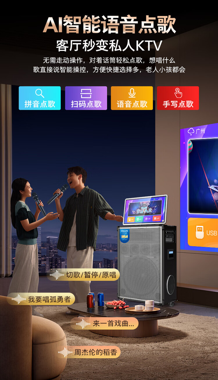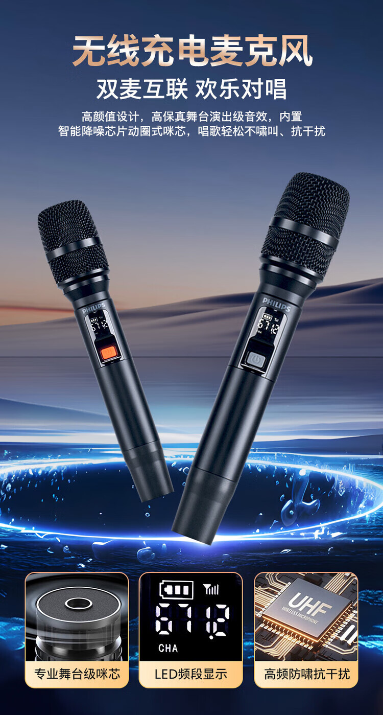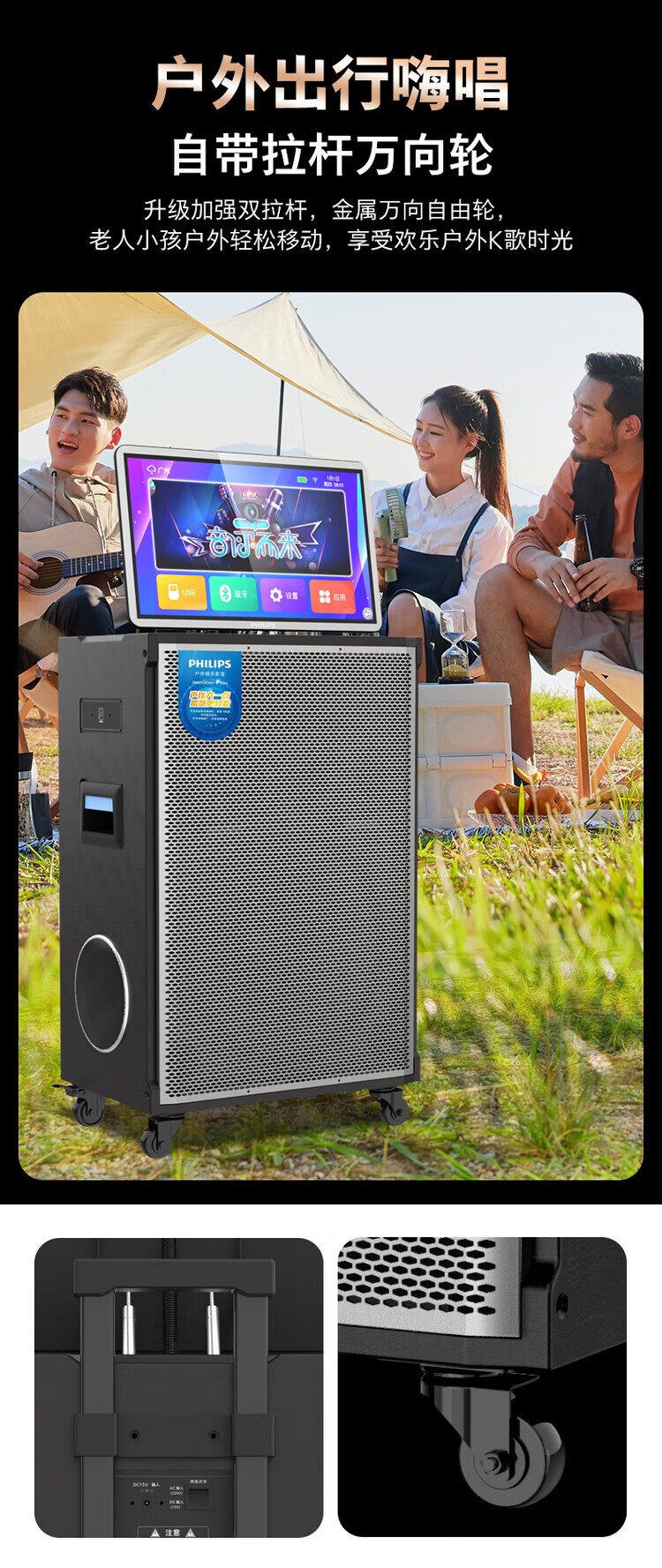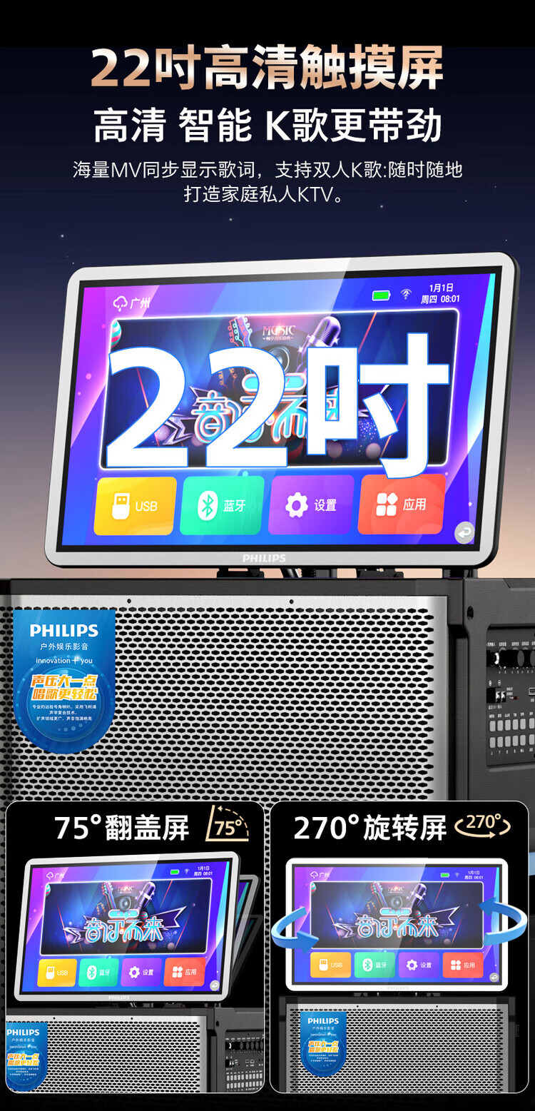 Philips (PHILIPS) 15-inch super bass outdoor audio large screen with sound card all-in-one KTV karaoke machine trolley speaker dual power supply/Bluetooth display lyrics 4 microphones