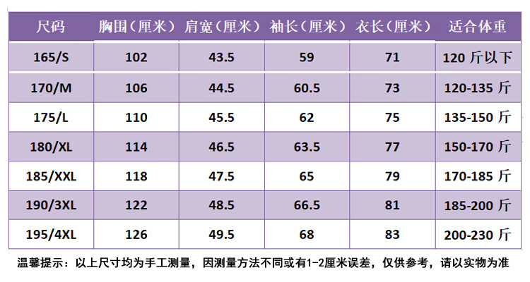 China (cm) 165 / 88-90 170 / 96-98 175 / 108-110 180 / 118-122 185 / 126-130