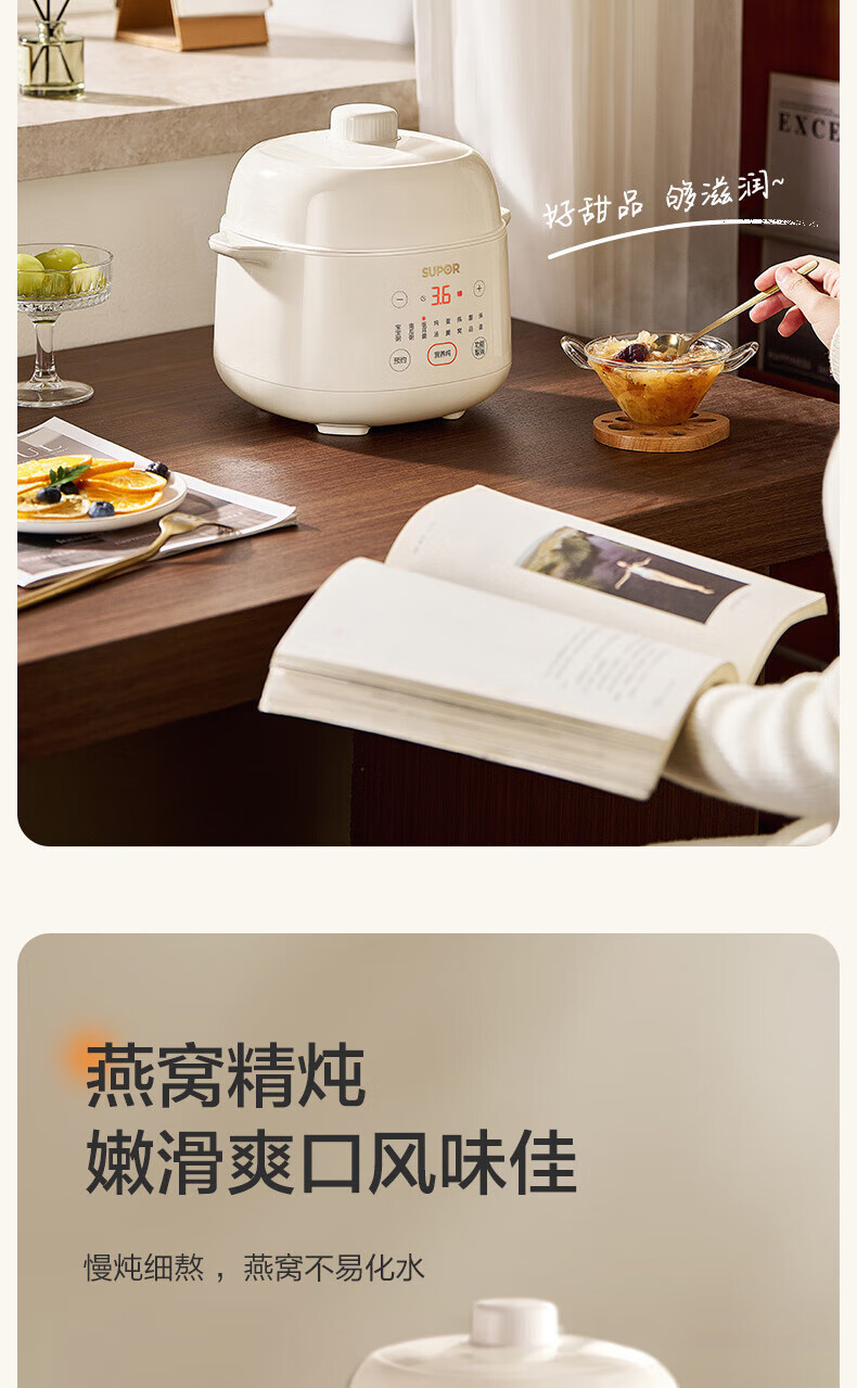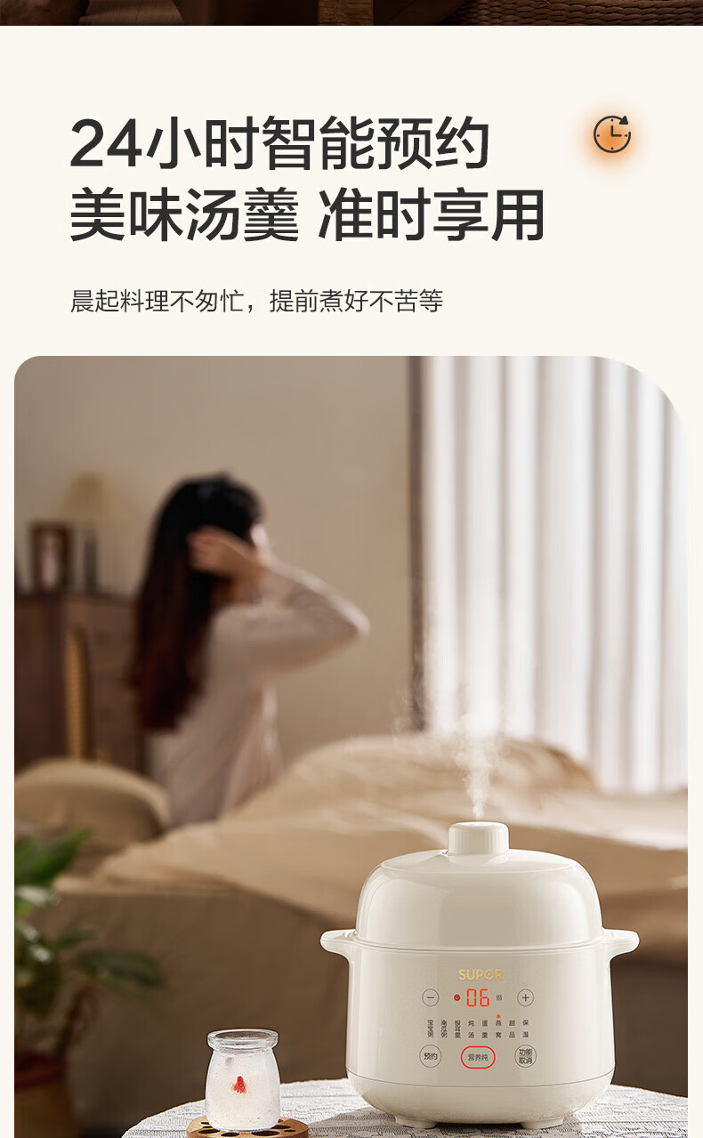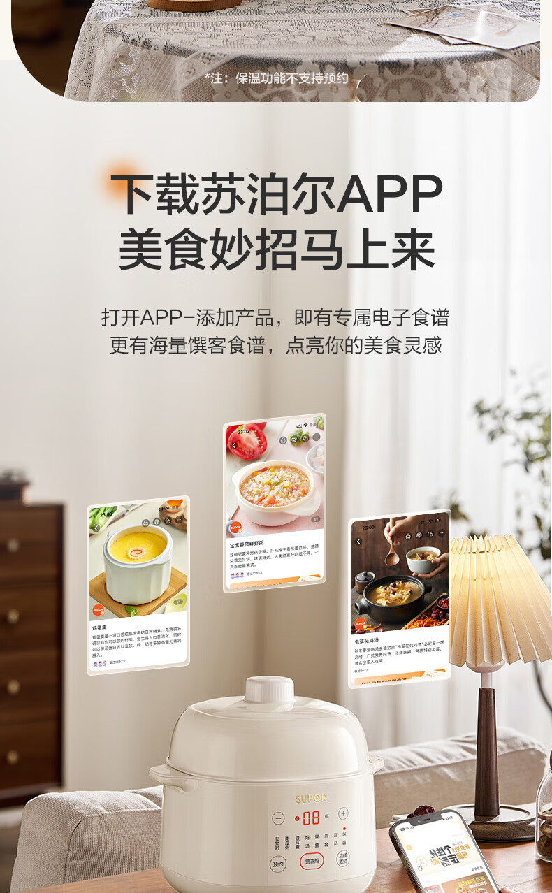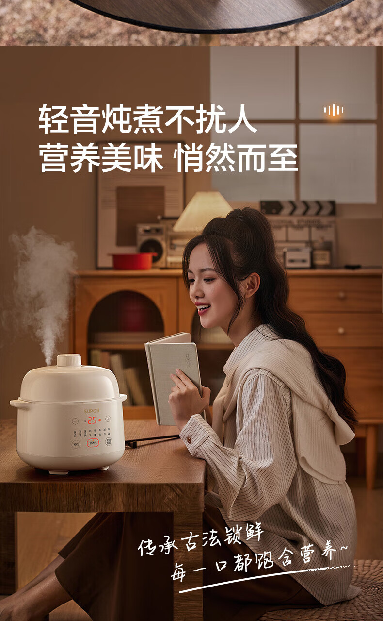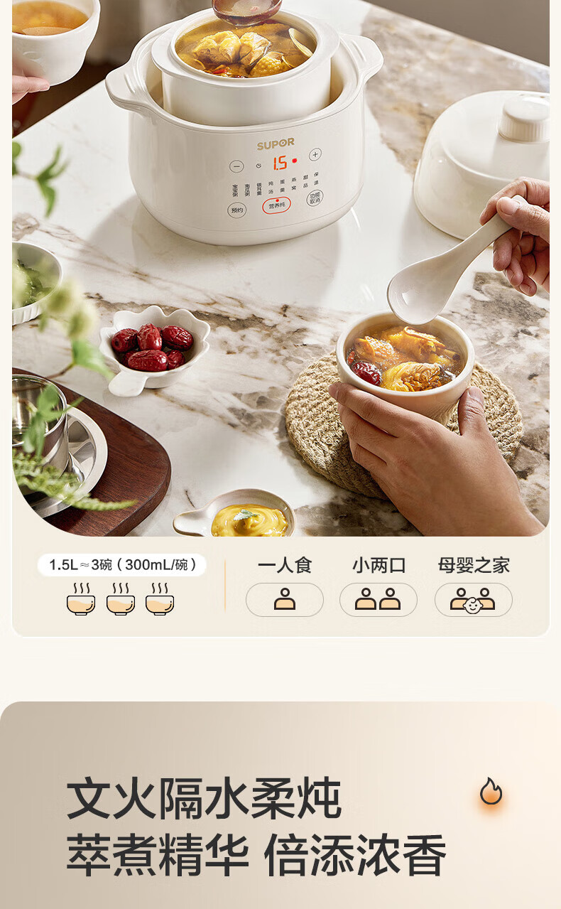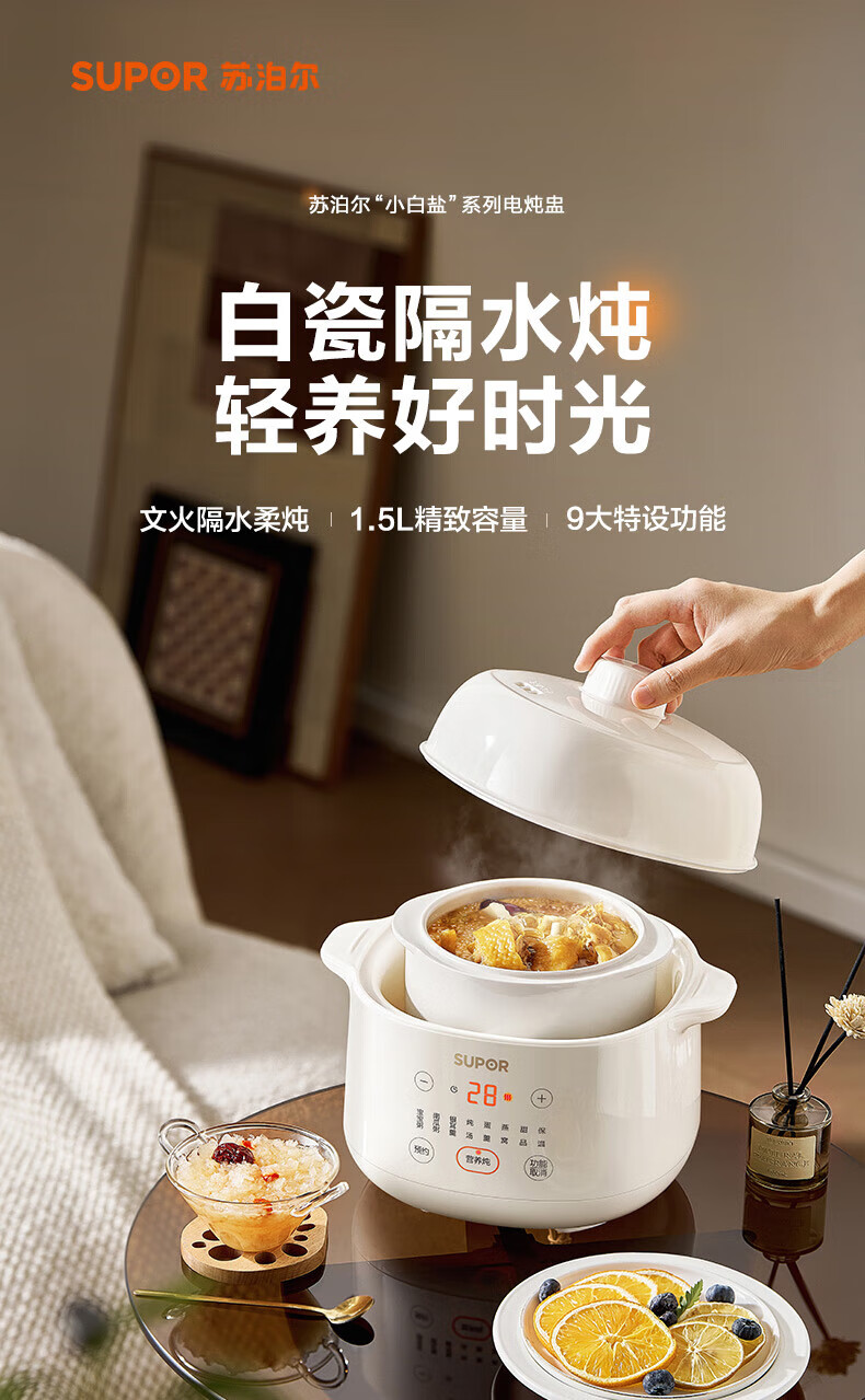 SUPOR electric stew pot, household fully automatic intelligent electric stew pot, water-proof stew pot, bird's nest stew pot, inner pot for cooking porridge, soup, stew, casserole, egg boiling artifact steamer 1.5L