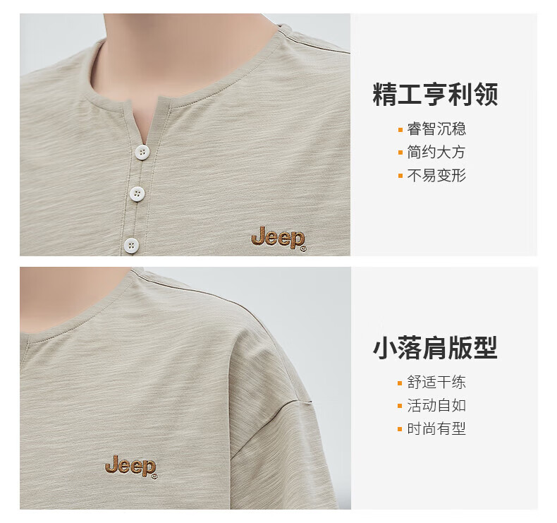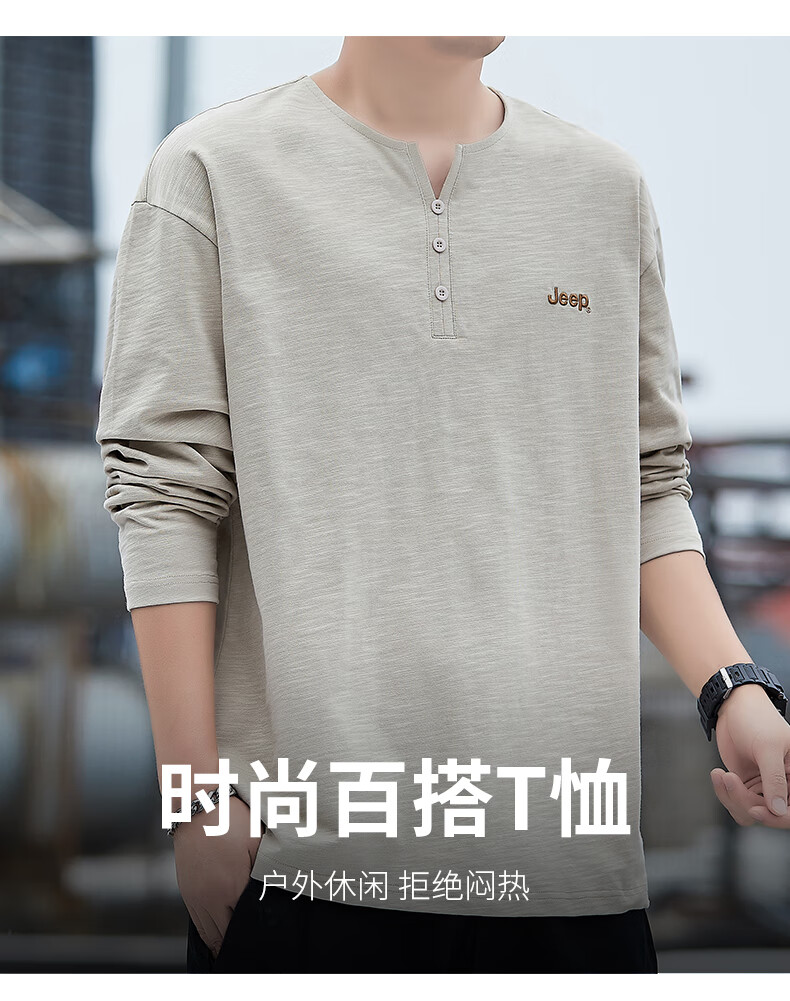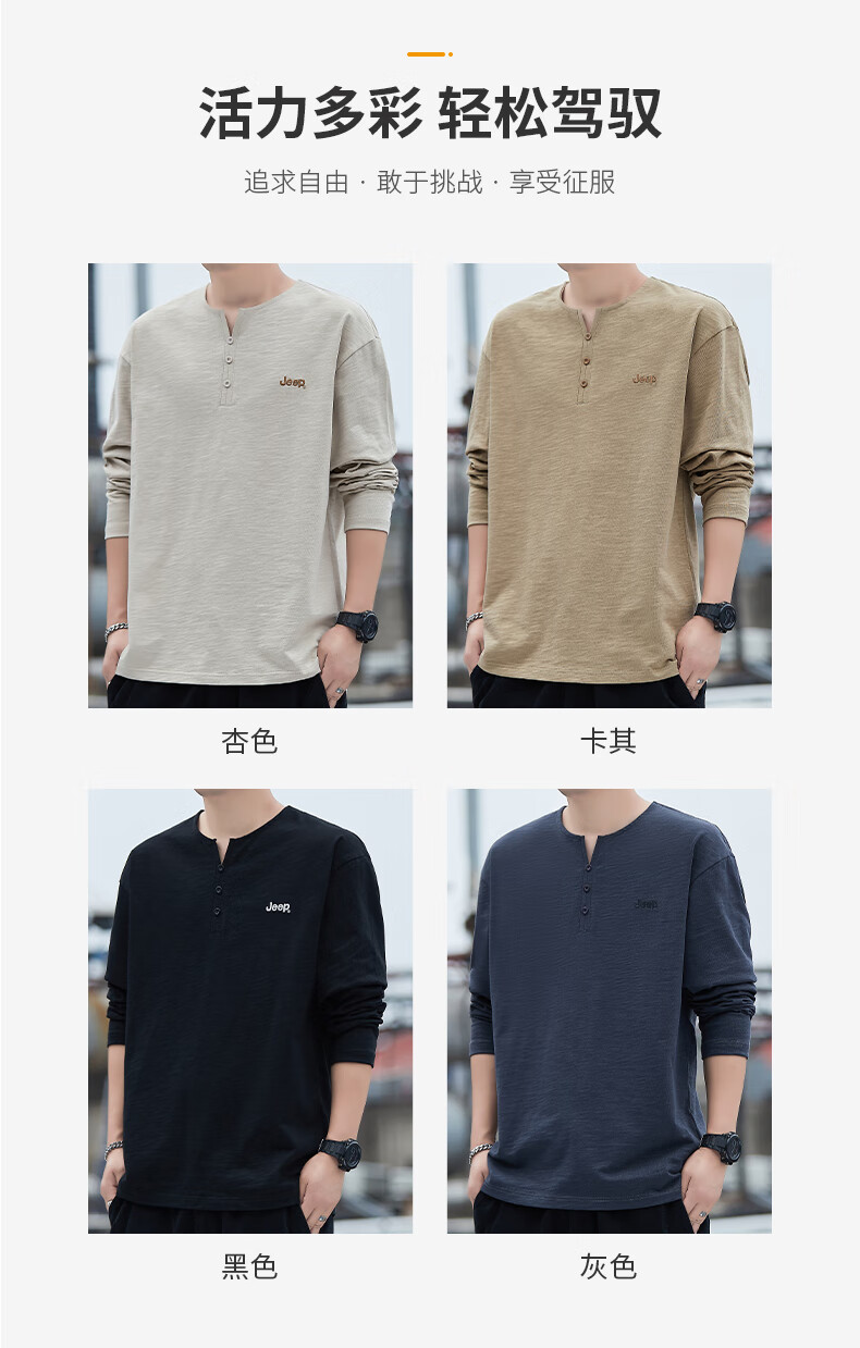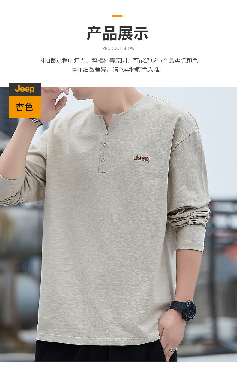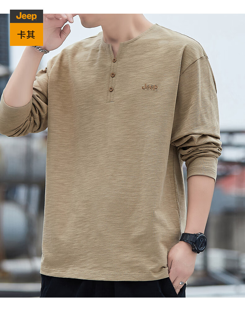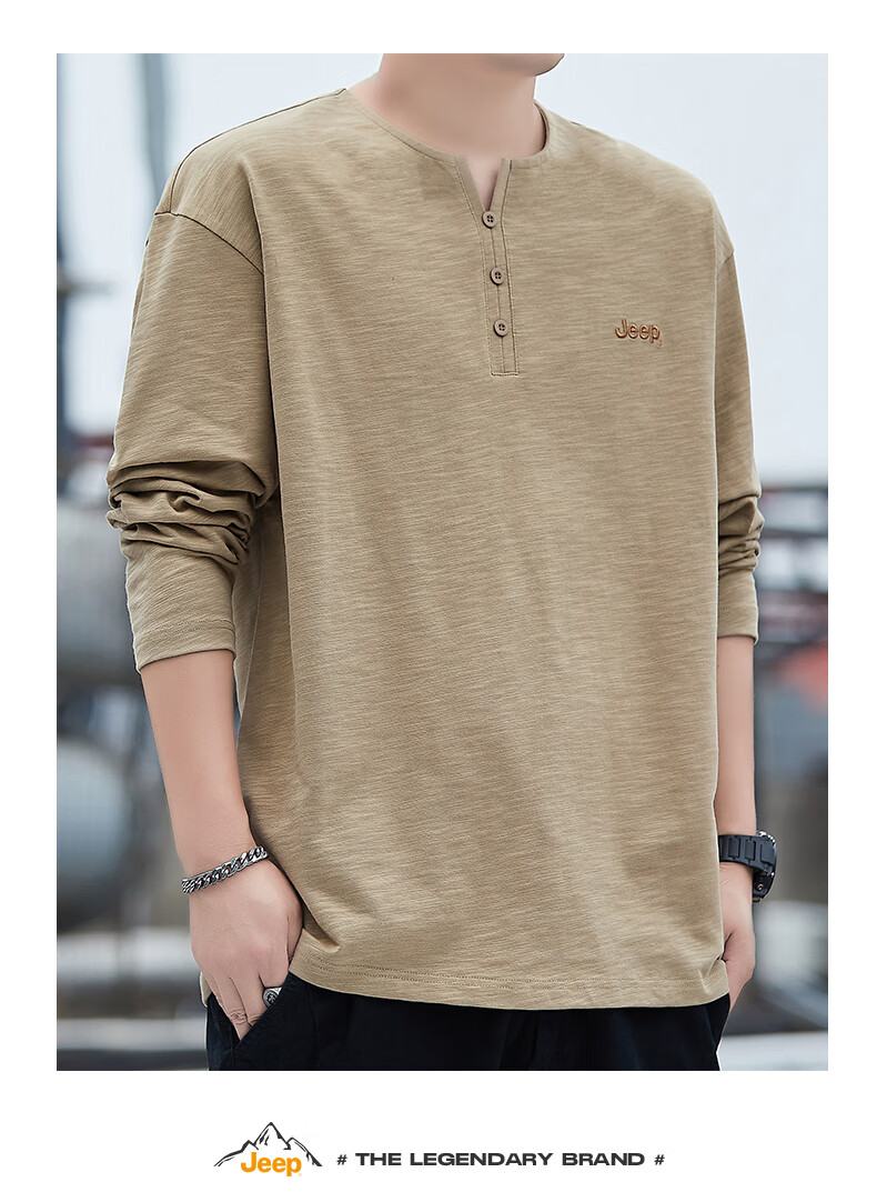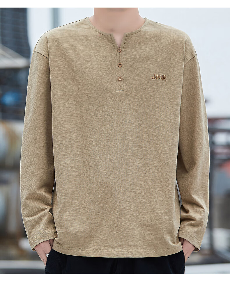 Jeep (JEEP) American genuine high-end pure cotton men's T-shirt bottoming shirt spring and autumn men's tops Henry collar casual thin sweatshirt (long sleeve) apricot official authentic 3XL suitable for 175Jin Jin equals about 0.5 kg