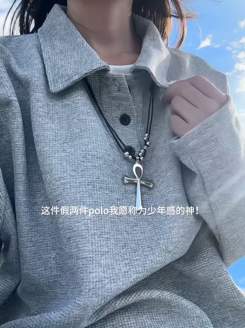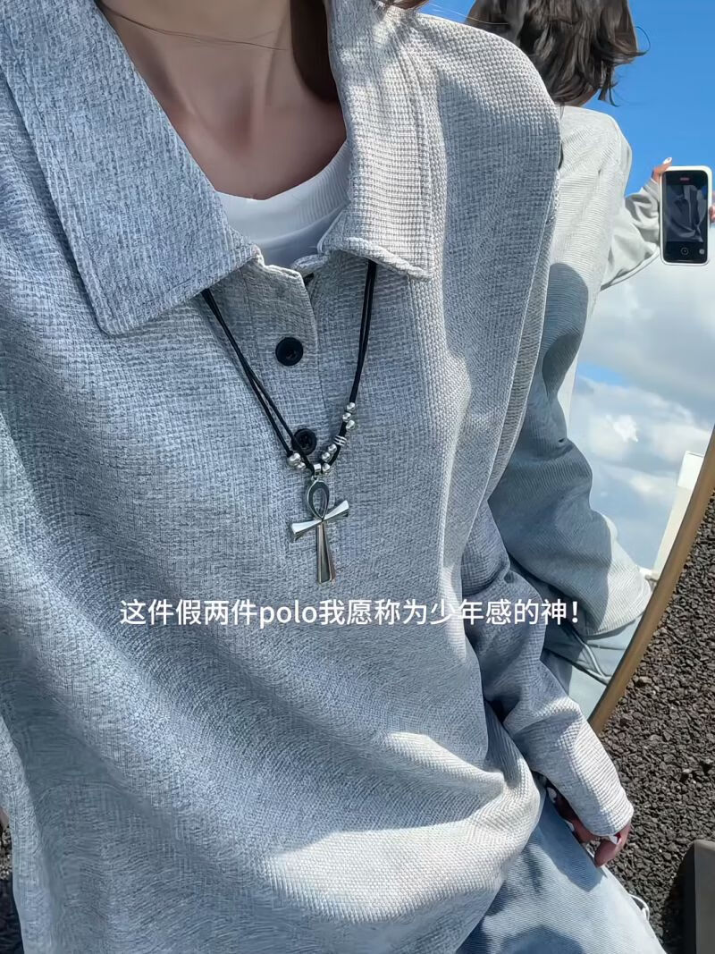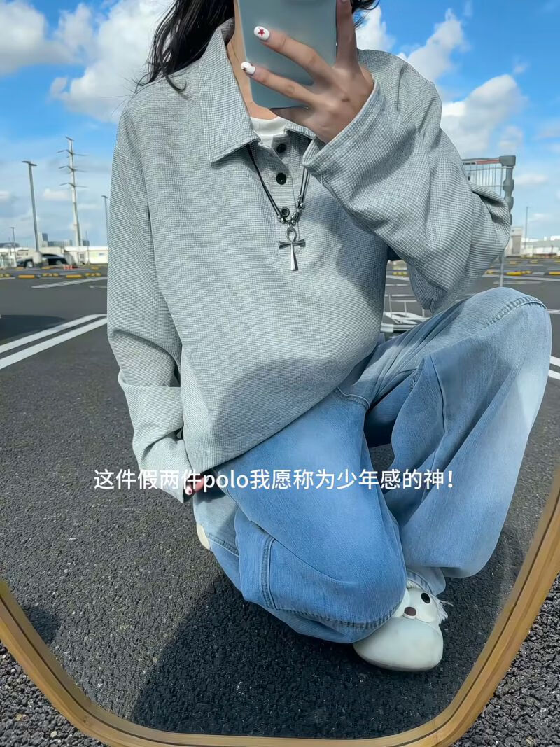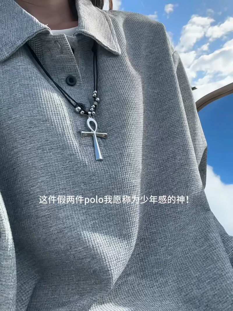 Unicorn Cool Henry Collar POLO Shirt Men's Autumn American Heavy Lapel Long Sleeve T-shirt Loose Casual Couple Outfit Gray M