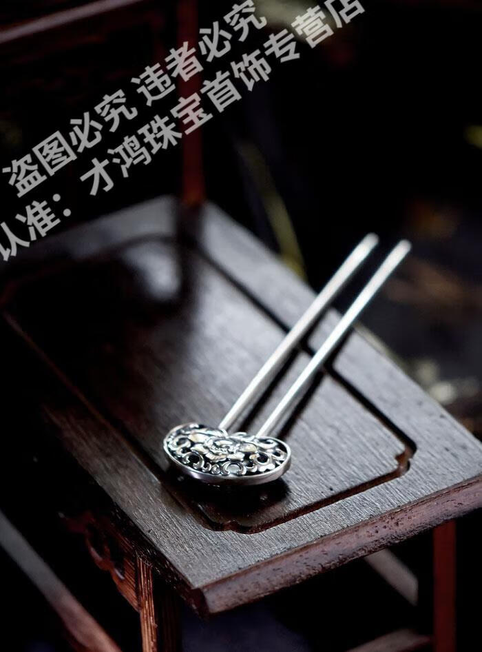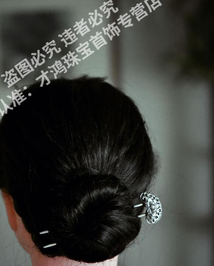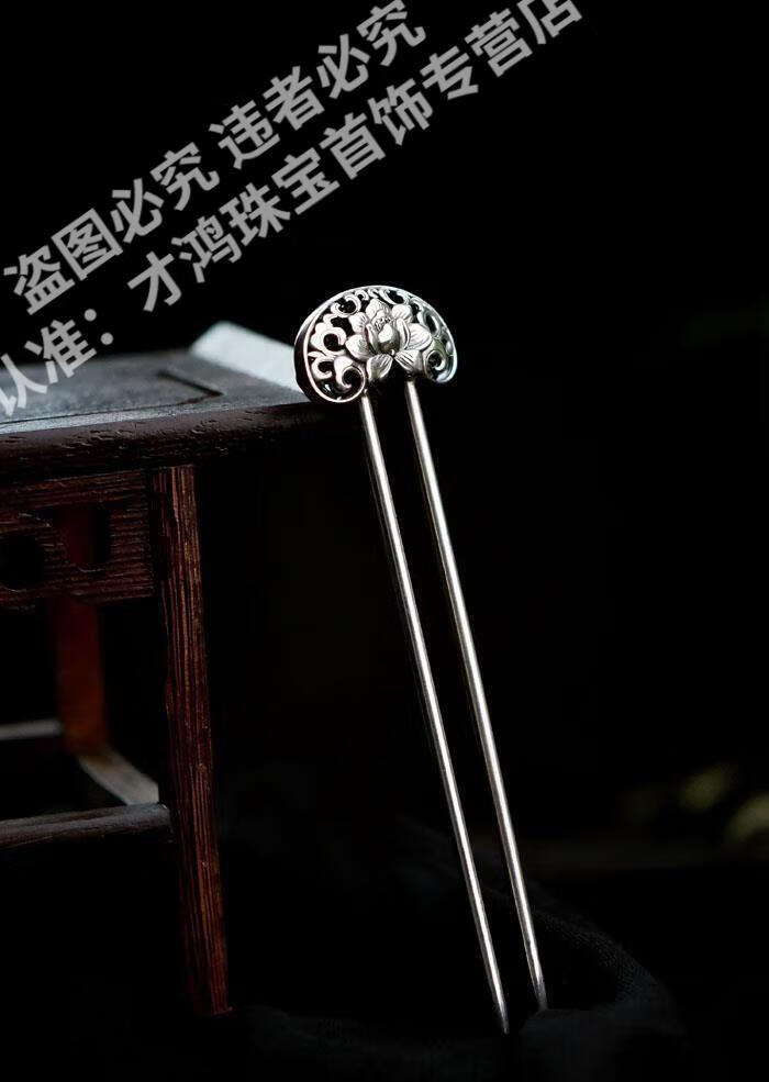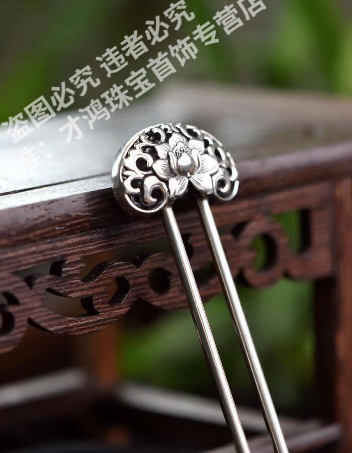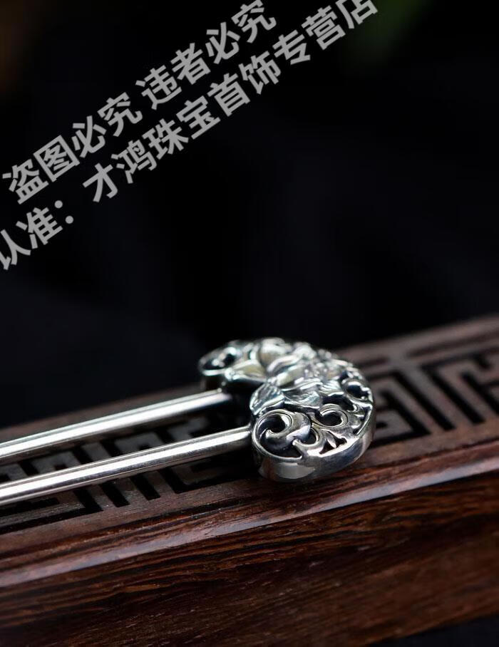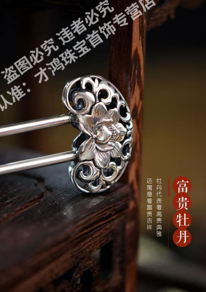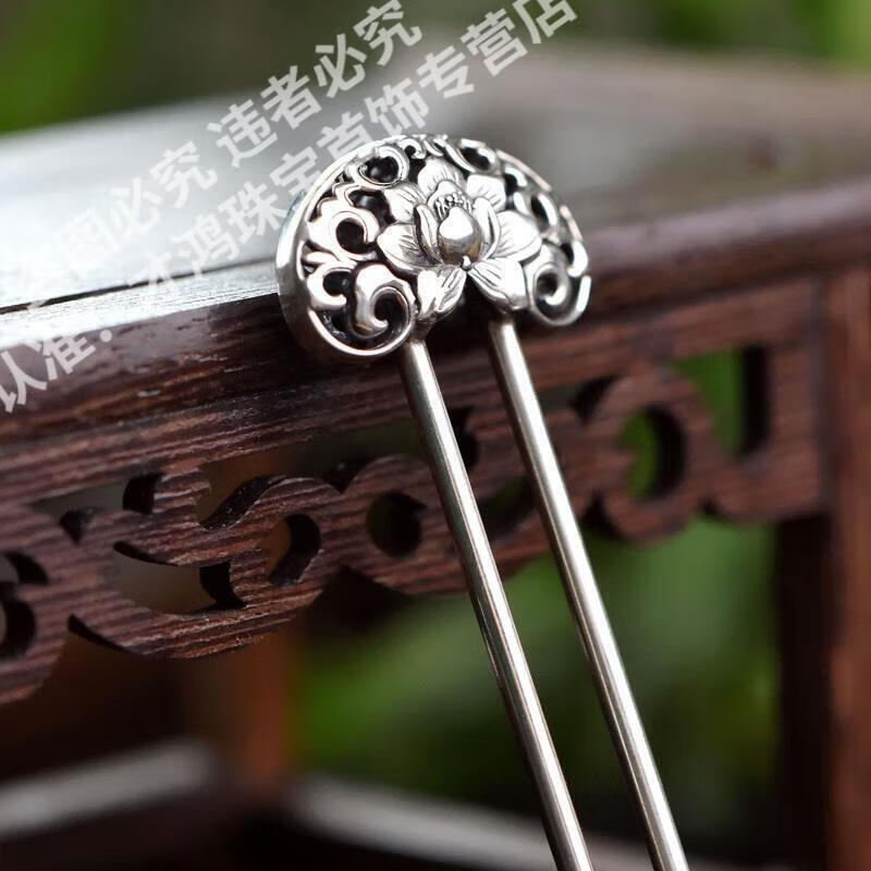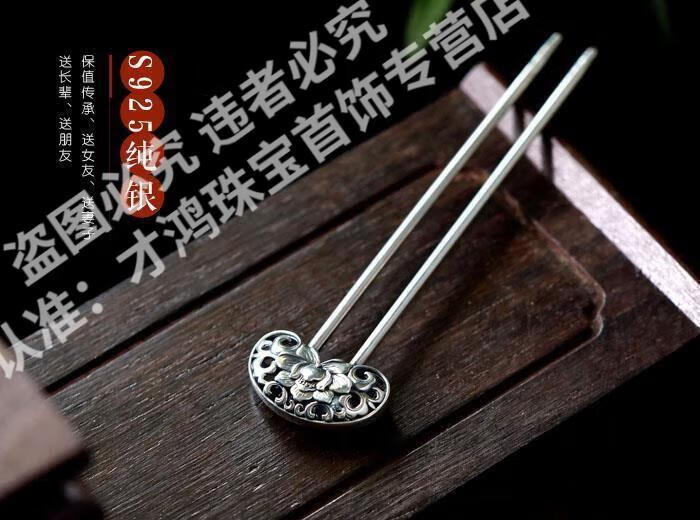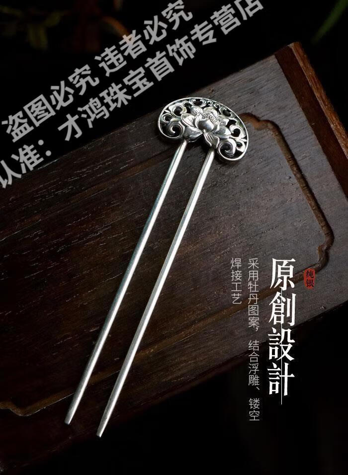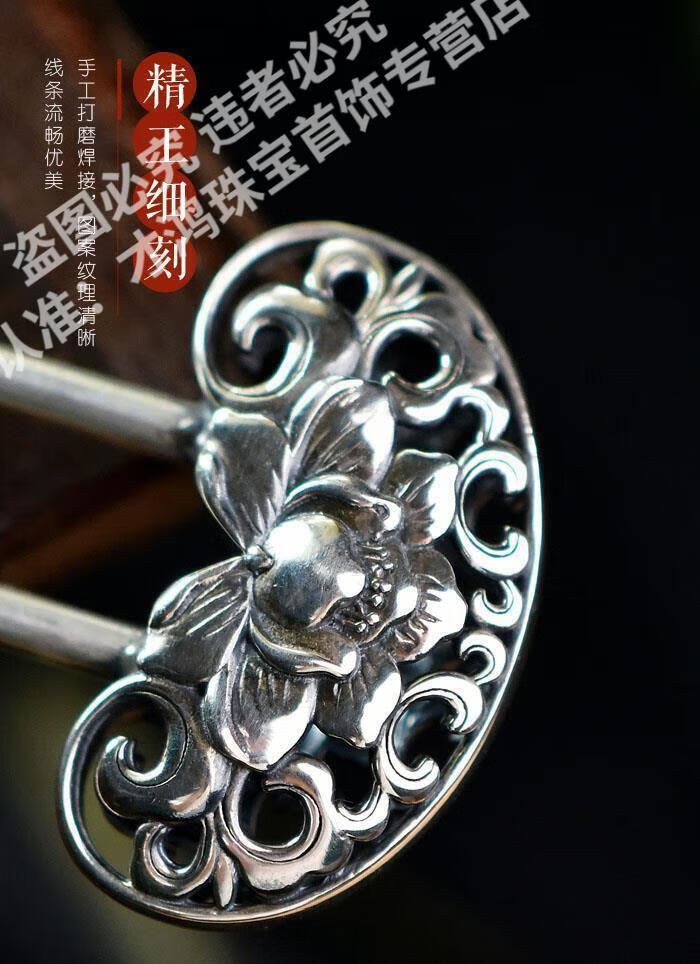 KZD Old Phoenix 999 sterling silver distressed hairpin Chinese retro style hollow peony hairpin pattern Hanfu tied hair headdress retro U-shaped peony.