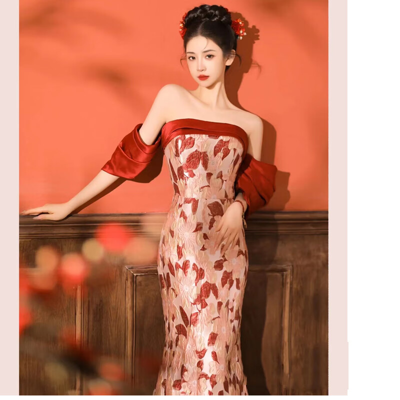 Fu Ling New Chinese Dressing Robe Bridal Luxurious Photography Chinese Engagement Toast Wear One Shoulder Fishtail Wedding Back Door Wear Banquet Burgundy M