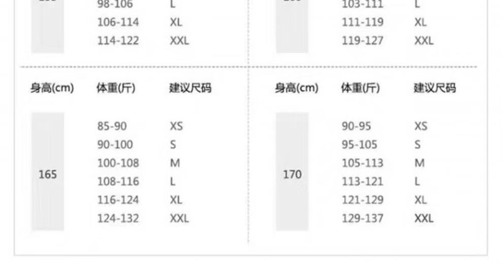 China (cm) 160-165/84-86 165-170 / 88-90 167-172 / 92-96 168-173 / 98-102 170-176 / 106-110
