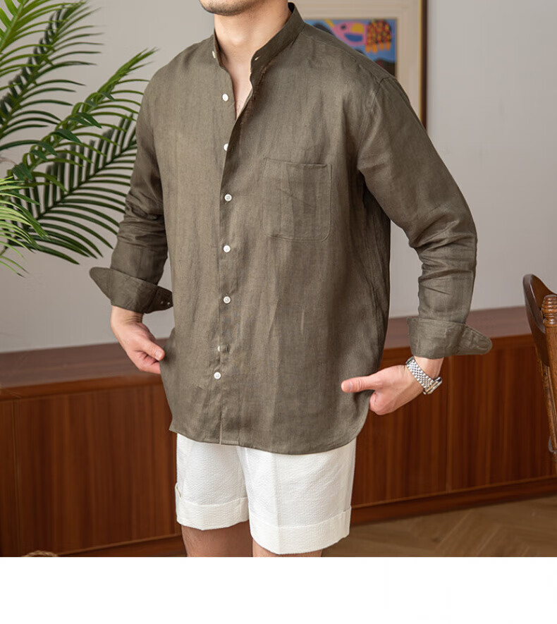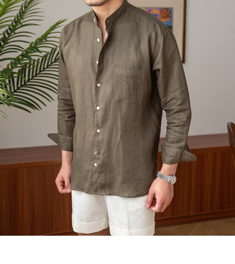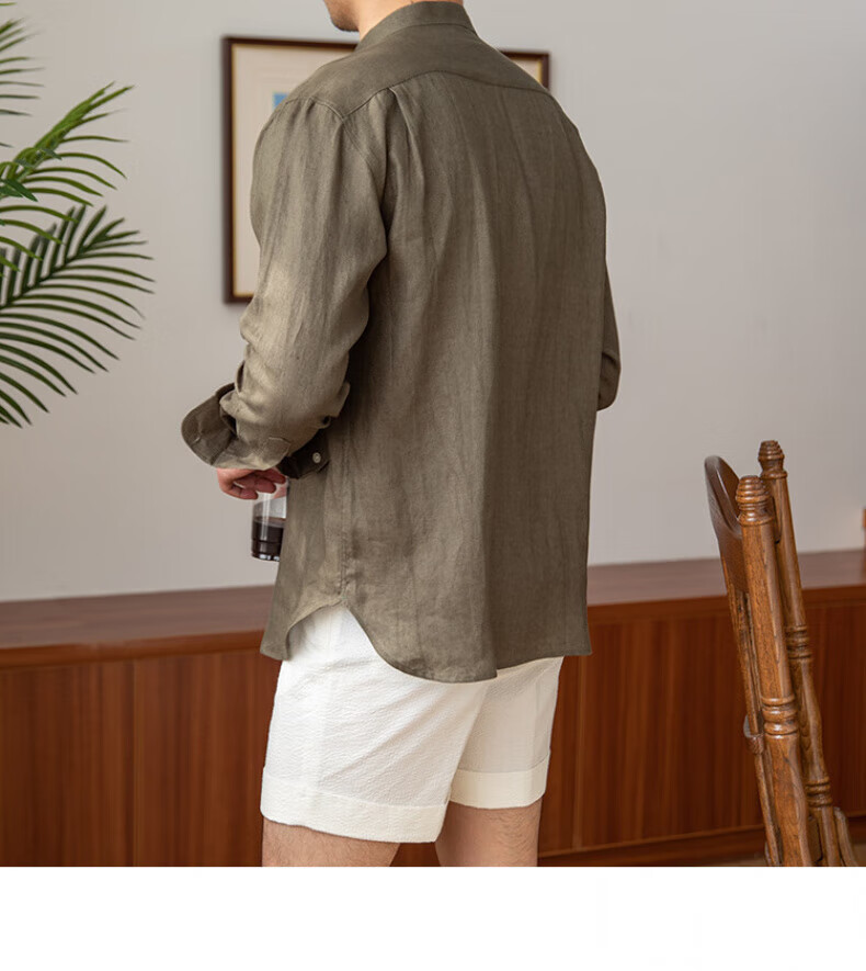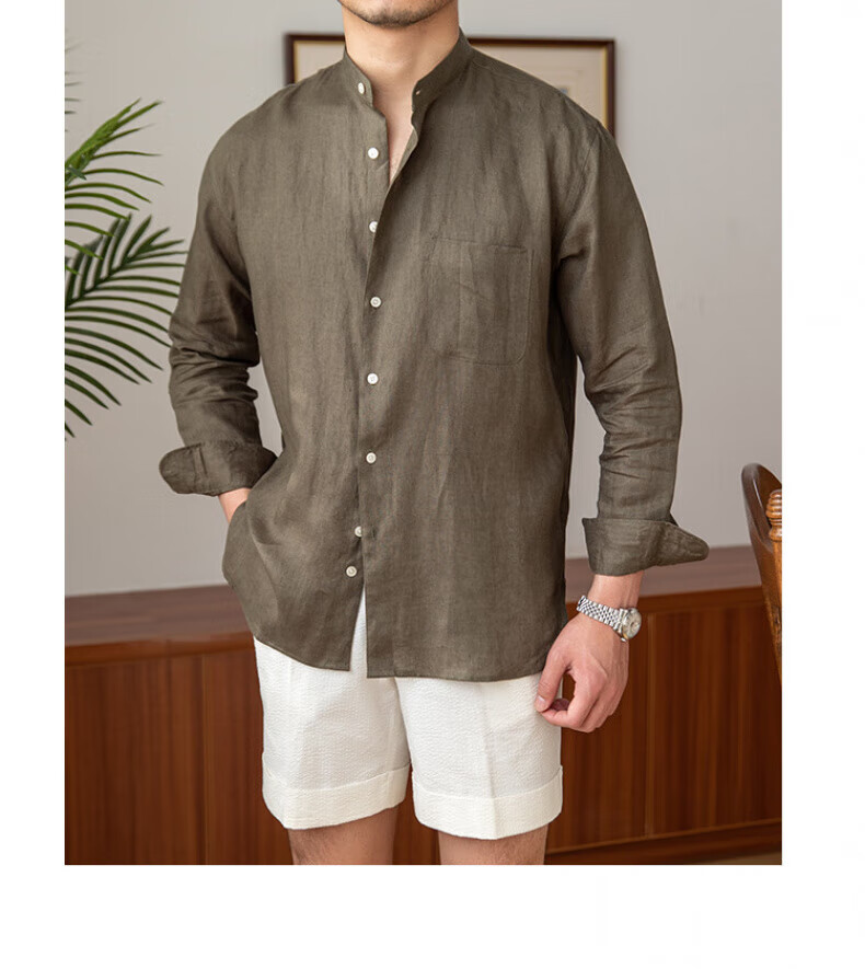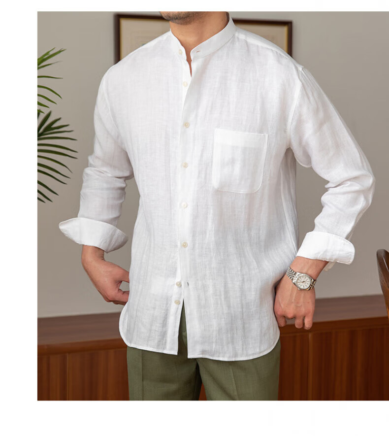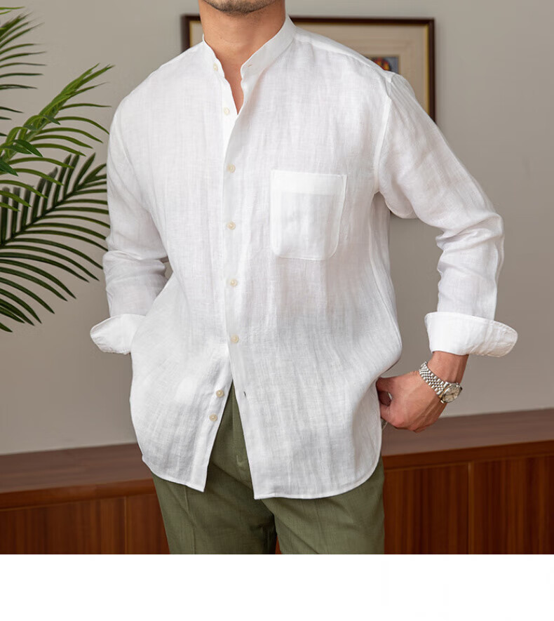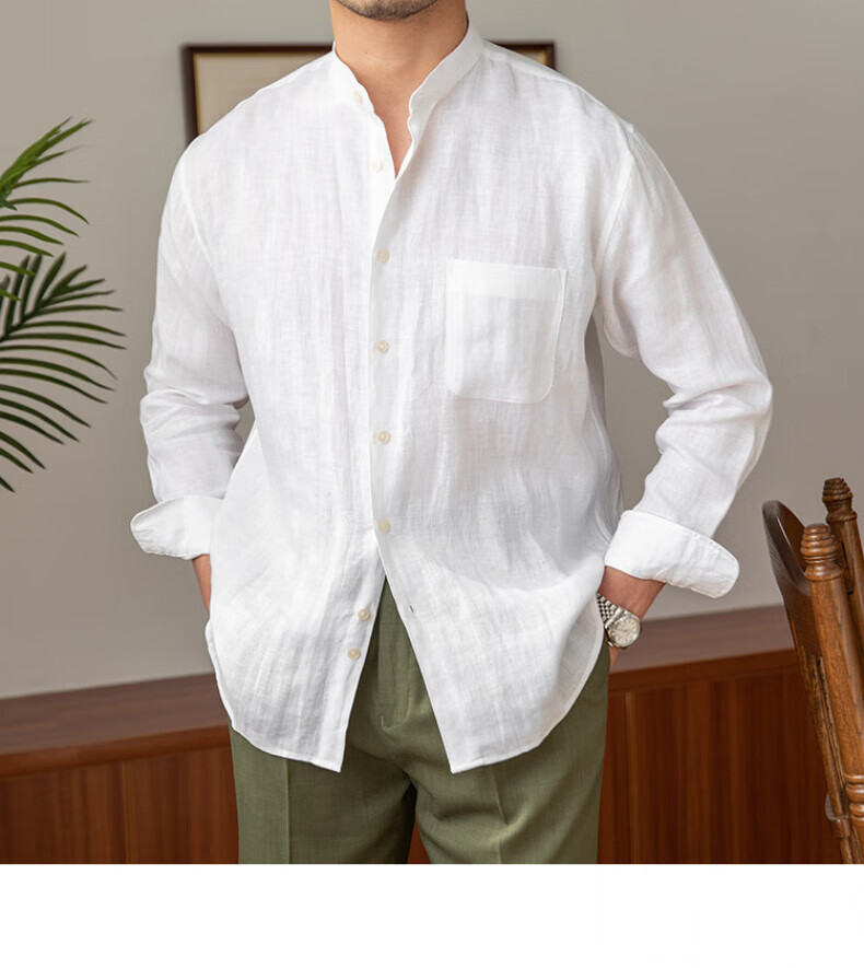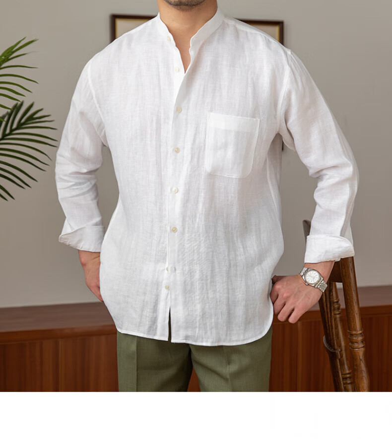 JEEP SPIRIT Commuting Light Mature Casual Breathable Pure Linen Long Sleeve Shirt Versatile Vacation Stand Collar Shirt Men's Henley Collar Top White L