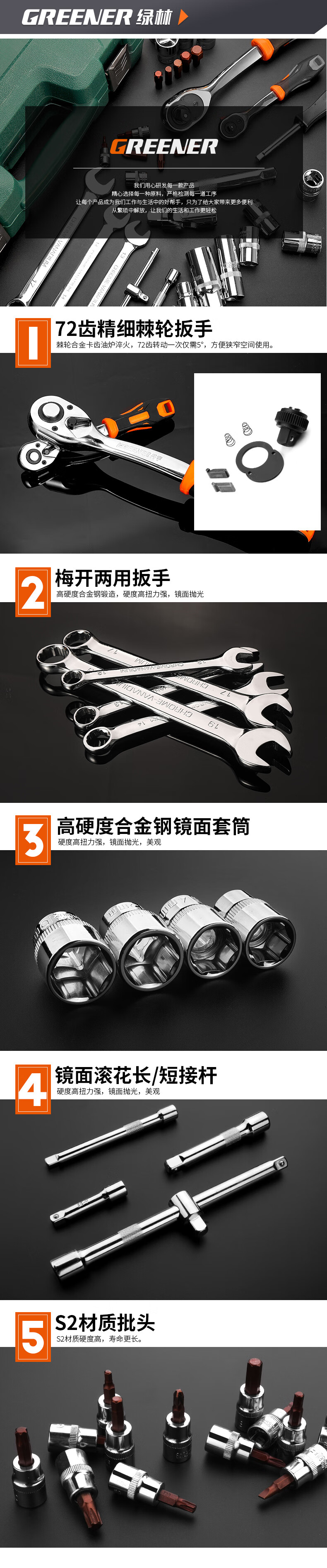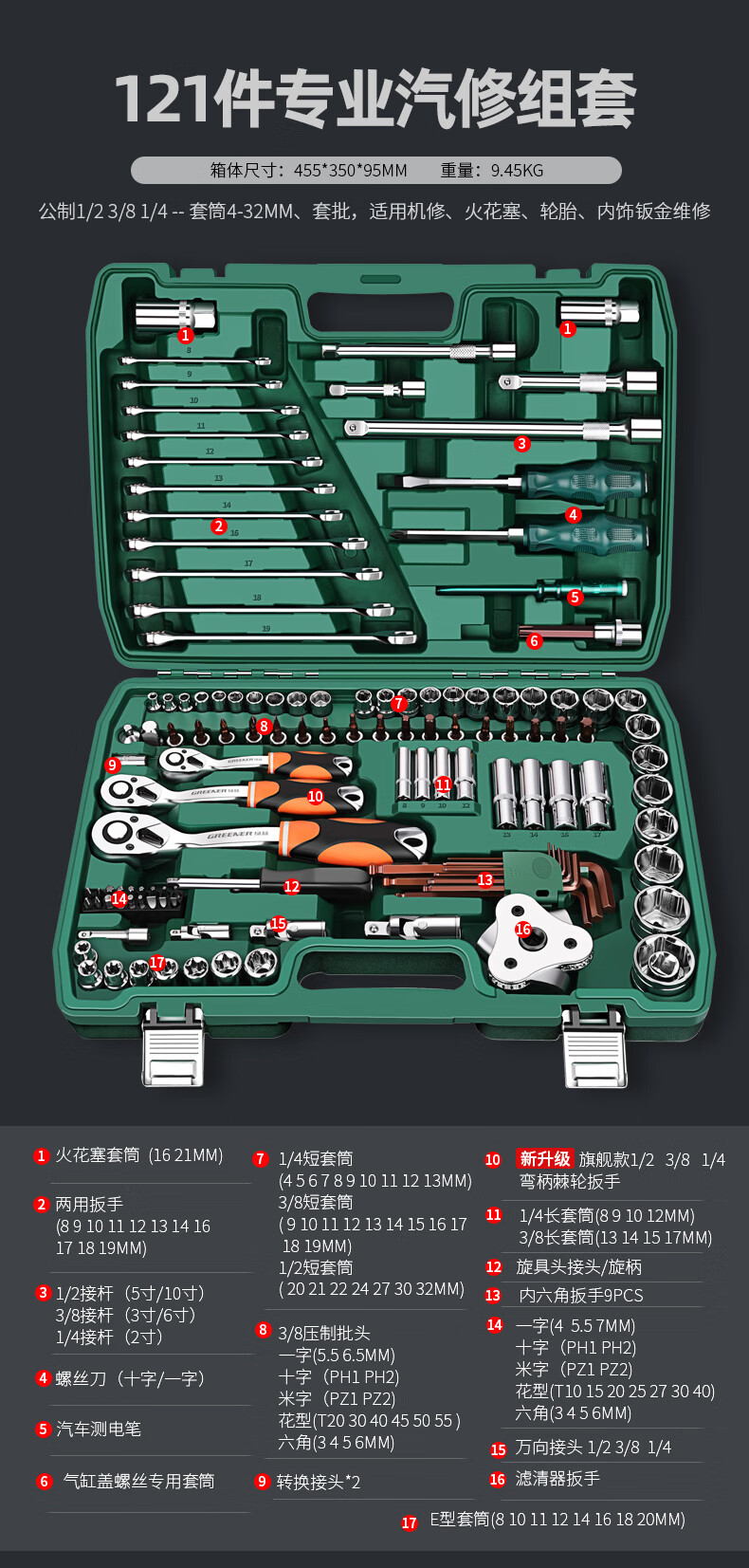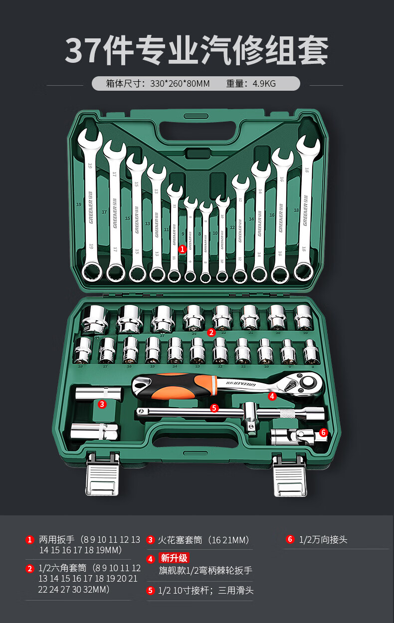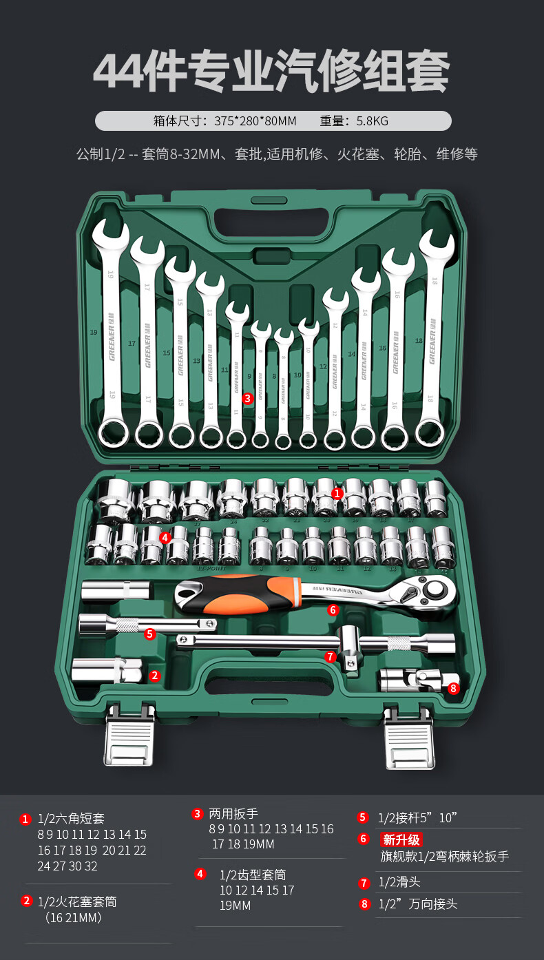 Green Forest 32-piece socket set, socket wrench, spark plug tool set, auto repair tool box, upgraded 72-tooth curved handle auto repair 32-piece set