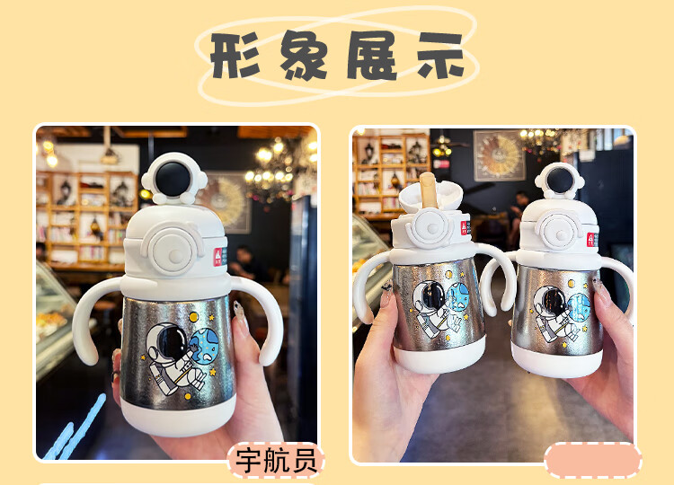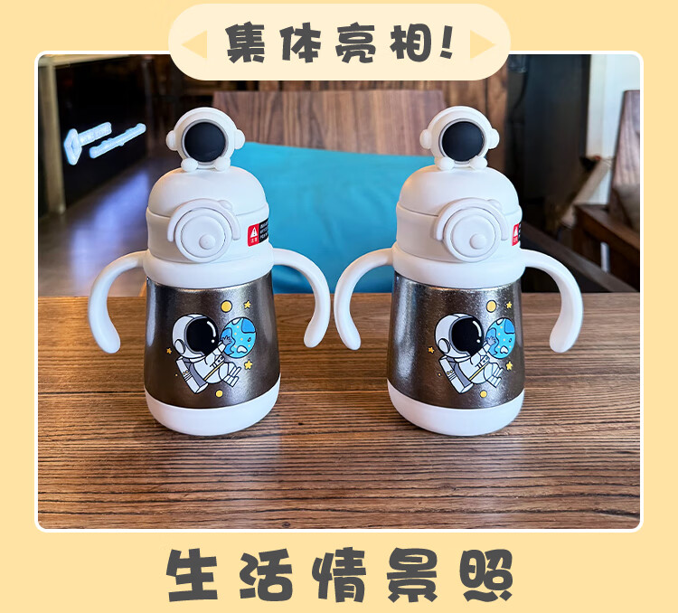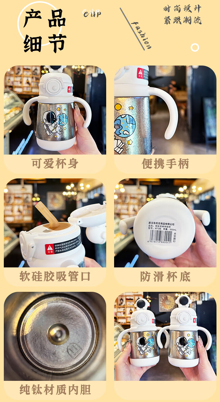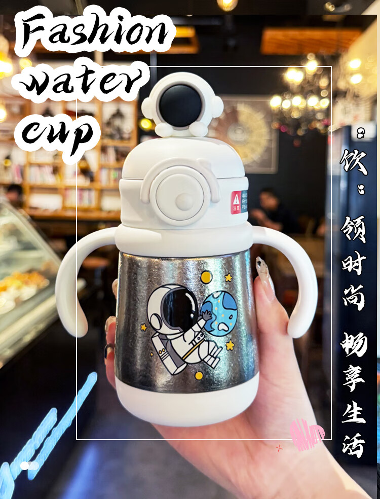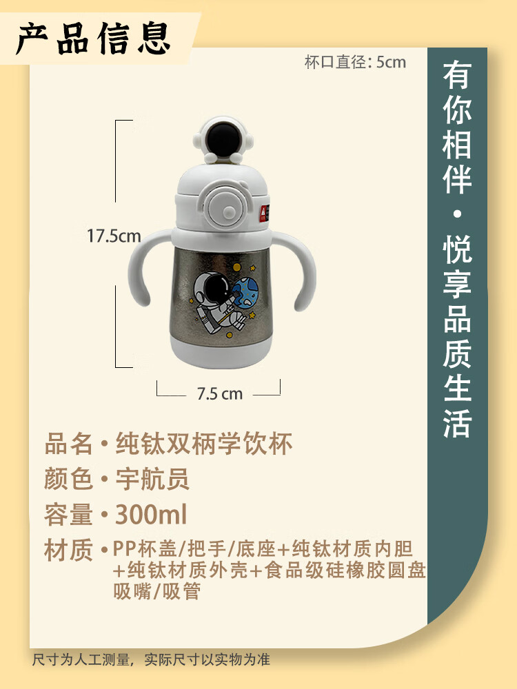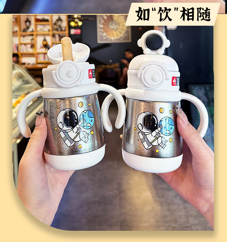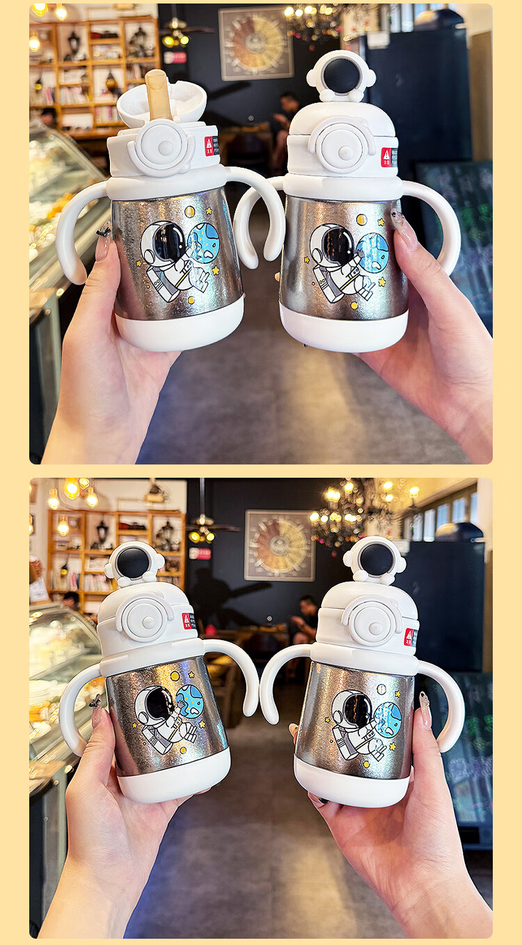 GULOO Pure Titanium Children's Straw Thermos Cup Baby Learning Drinking Cup with Handle Bottle Kindergarten 1-3 Years Old Special Water Cup Silver Astronaut Long-lasting Antibacterial Preservation 300ml