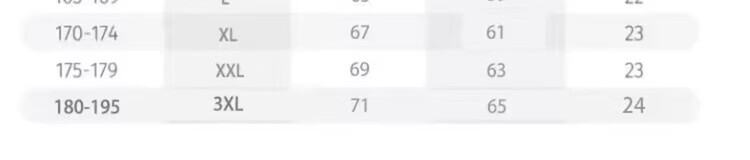 China (cm) 160-165/84-86 165-170 / 88-90 167-172 / 92-96 168-173 / 98-102 170-176 / 106-110