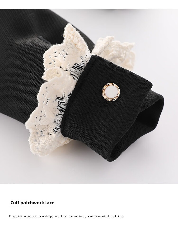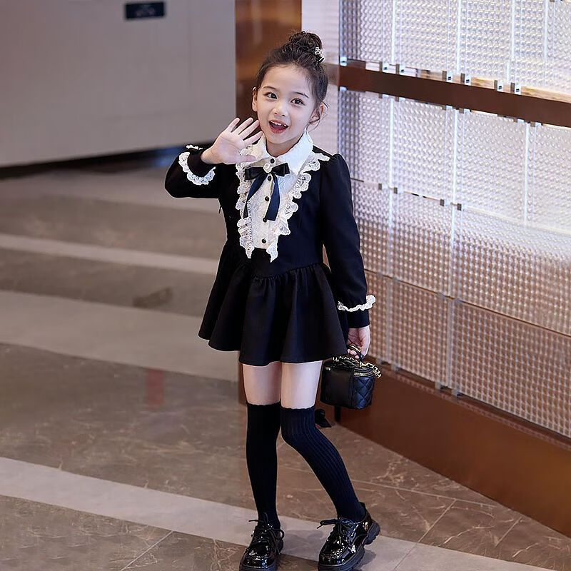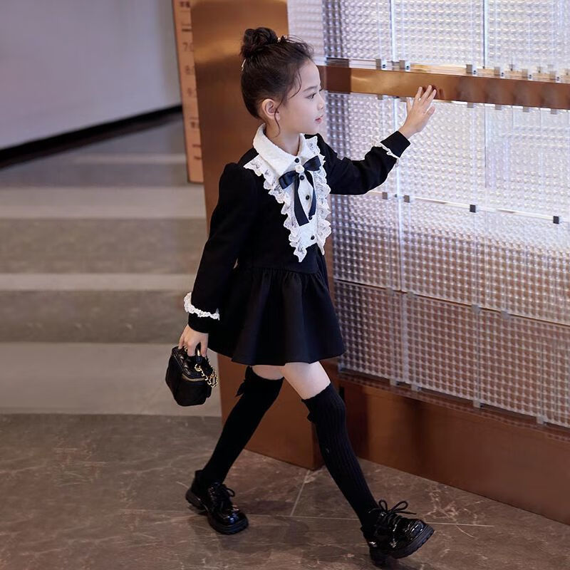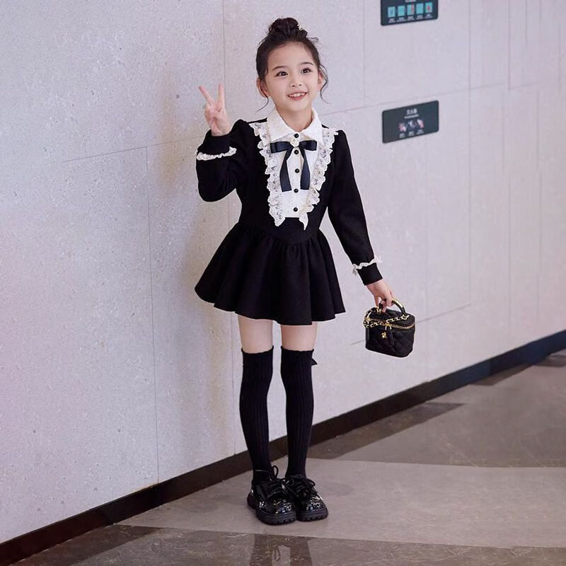 Burwilde international brand girls' preppy dress 2025 spring and autumn style children's fashionable princess dress for women Bow Hepburn black bow dress (gift box) 160 recommended 145-155cm