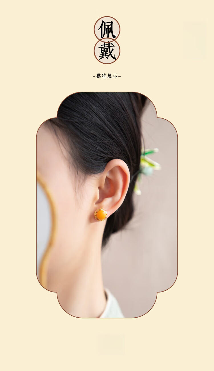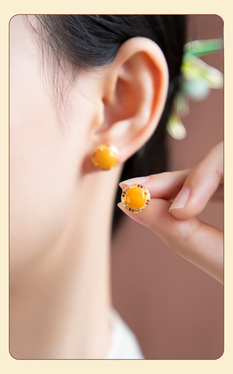 Fat Donglai's same style beeswax earrings, chicken fat yellow amber earrings, retro yellow egg surface gold inlaid with jade, natural metaphysical ears, natural chicken fat yellow Fuqiu earrings